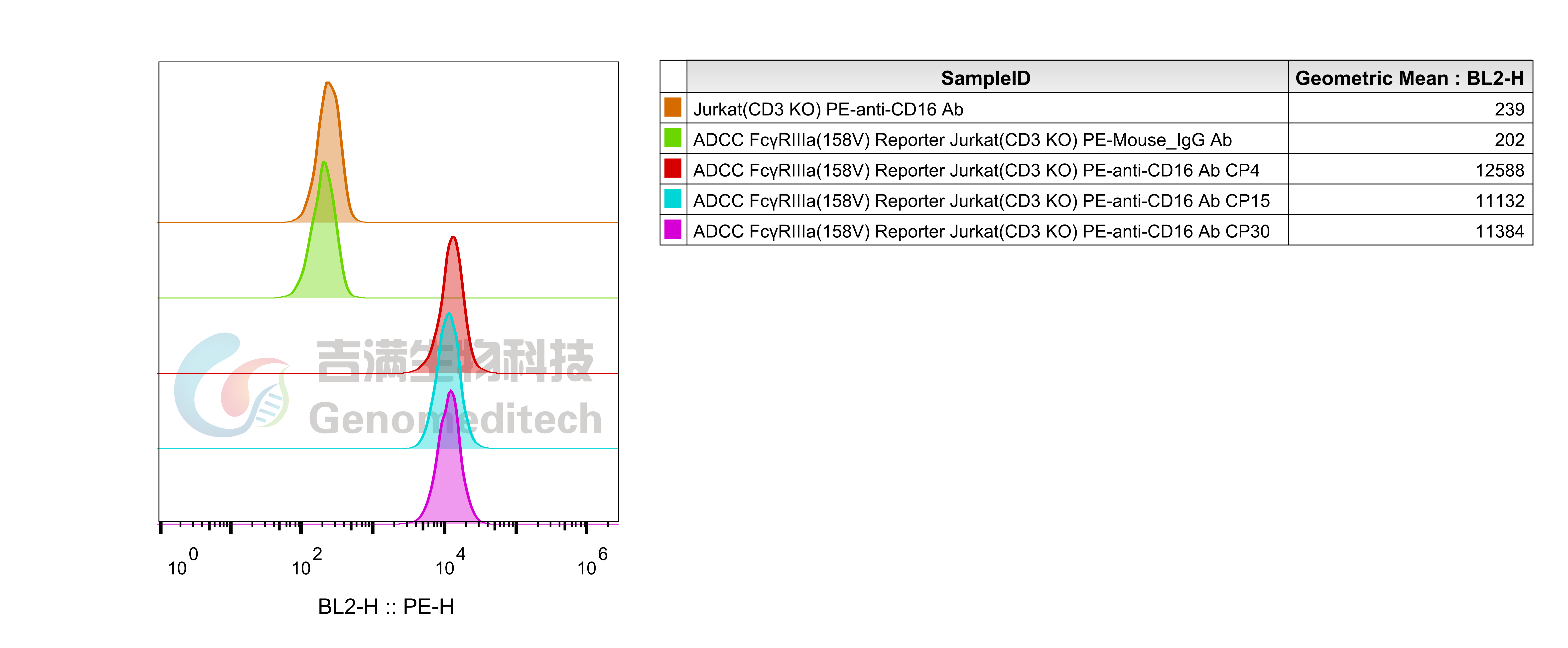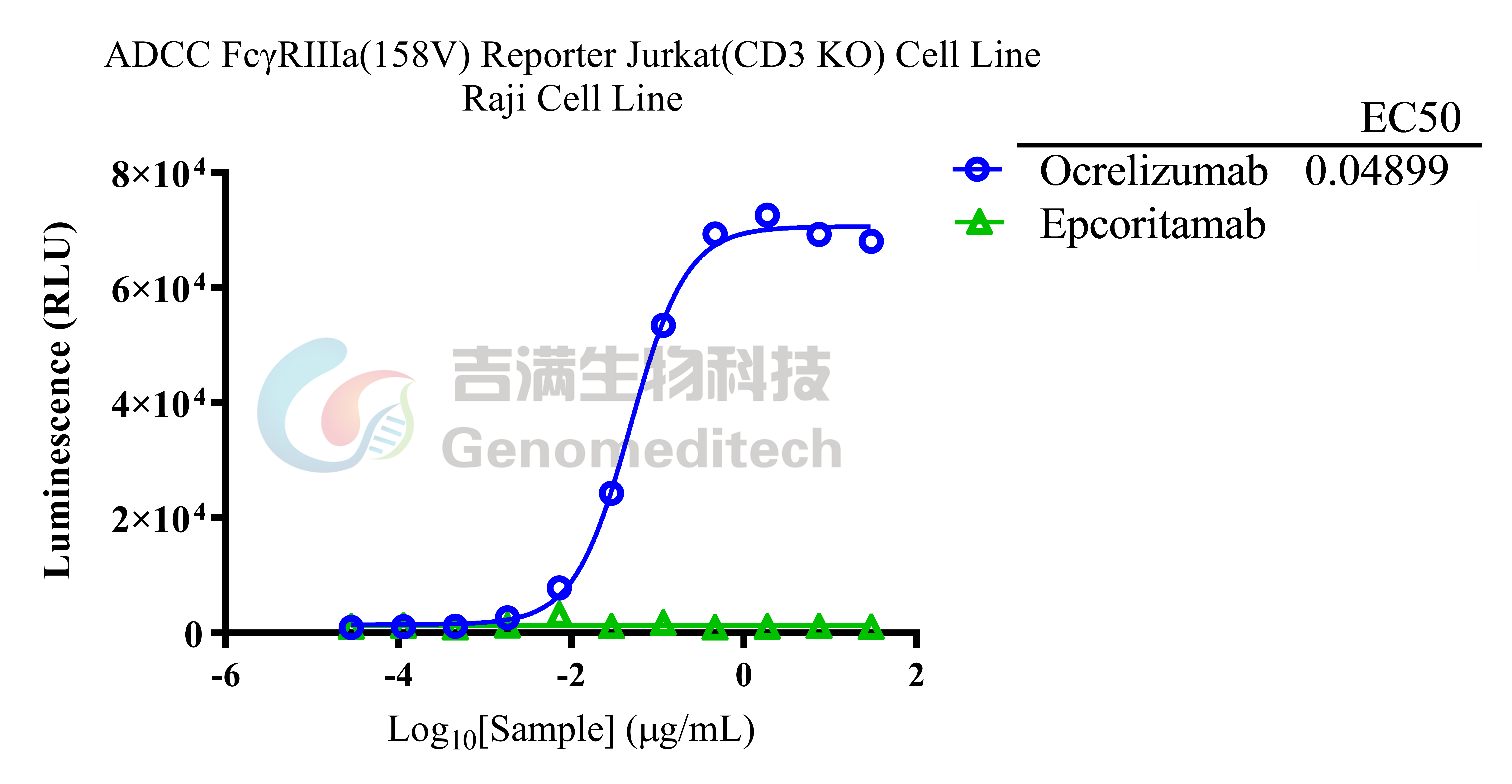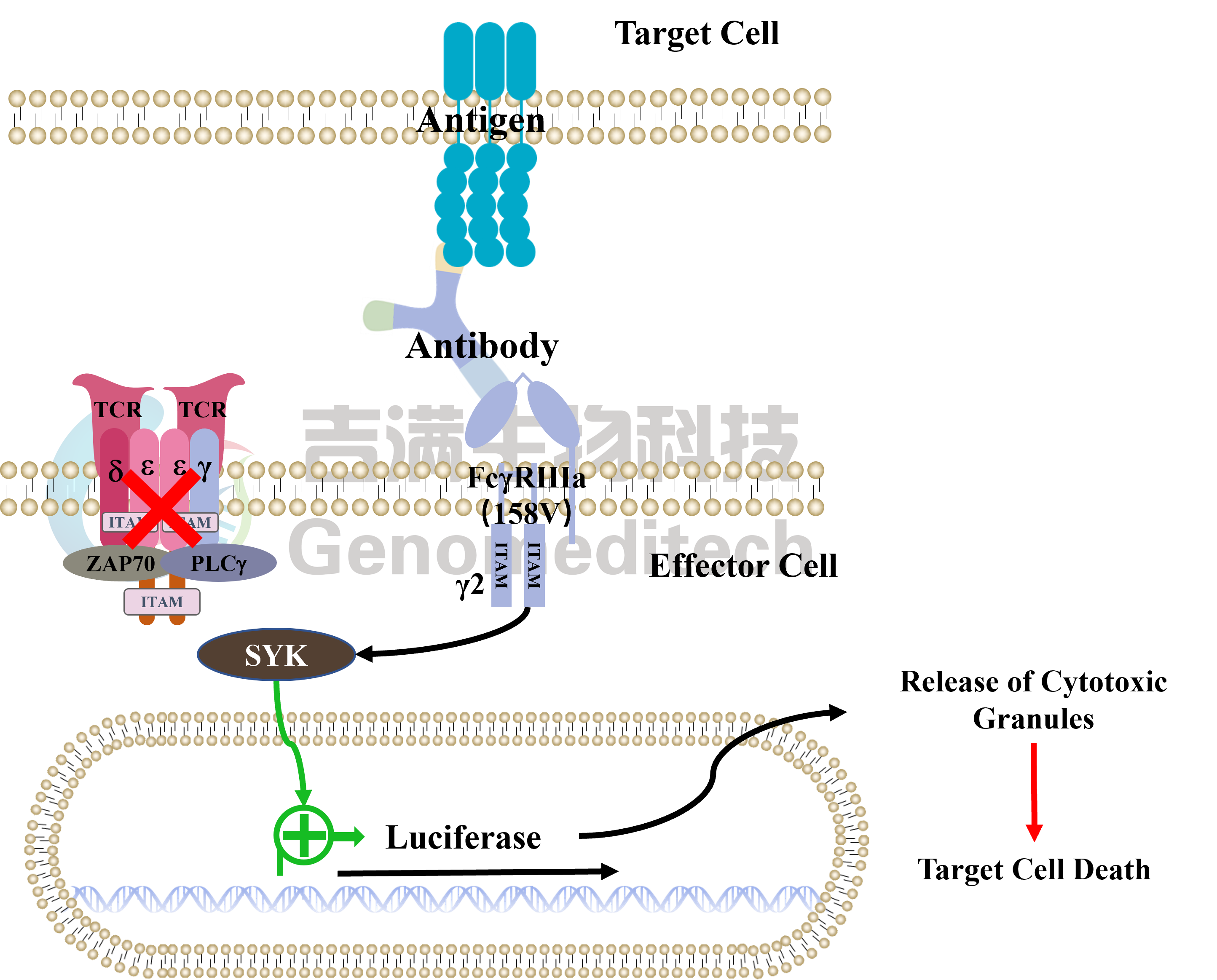 | 产品编号:GM-C39293 产品名称:ADCC FcγRIIIa(158V) Reporter Jurkat(CD3 KO) Cell Line ADCC即抗体依赖性细胞介导的细胞毒作用(antibody dependent cell-mediated cytotoxicity, ADCC),是指表达Fc受体的免疫细胞通过识别抗体的Fc段直接杀伤与抗体特异性结合的靶细胞的作用。现如今,ADCC作用机制被用来检测、评定抗体或靶细胞的功效。抗体与细胞表面上的目标抗原结合。如果抗体的 Fc 段同时结合到效应细胞(主要为自然杀伤细胞, natural killer cells )表面的 FcγRIIIa 受体上,两种类型的细胞即发生多重交联,导致 ADCC 作用机制通路的激活。 靶细胞的杀伤是此活化途径的终点,这一指标被用在经典的 ADCC 生物活性检测中,这些经典的检测方法利用供者的外周血单核细胞(PBMC)或自然杀伤(NK)细胞亚群作为效应细胞。这些细胞的应答变异性很大,难于制备,并容易引起很高的背景读数。 吉满生物ADCC FcγRIIIa(158V) Reporter Jurkat(CD3 KO) Cell Line报告基因细胞系采用工程改造的Jurkat细胞作为效应细胞。该细胞稳定表达了 FcγRIIIa 受体(高亲和158V)和由特定转录因子驱动表达的萤火虫萤光素酶,同时敲除了内源性CD3复合物。 这一设计使得细胞能专一响应受体介导的ADCC激活信号。通过检测细胞中荧光素酶的生物发光强度,可以精准定量ADCC通路的抗体活性。该体系信号强、背景低,特别适合用于双抗TCE药物的功能活性和机制验证研究。 | ![]() |