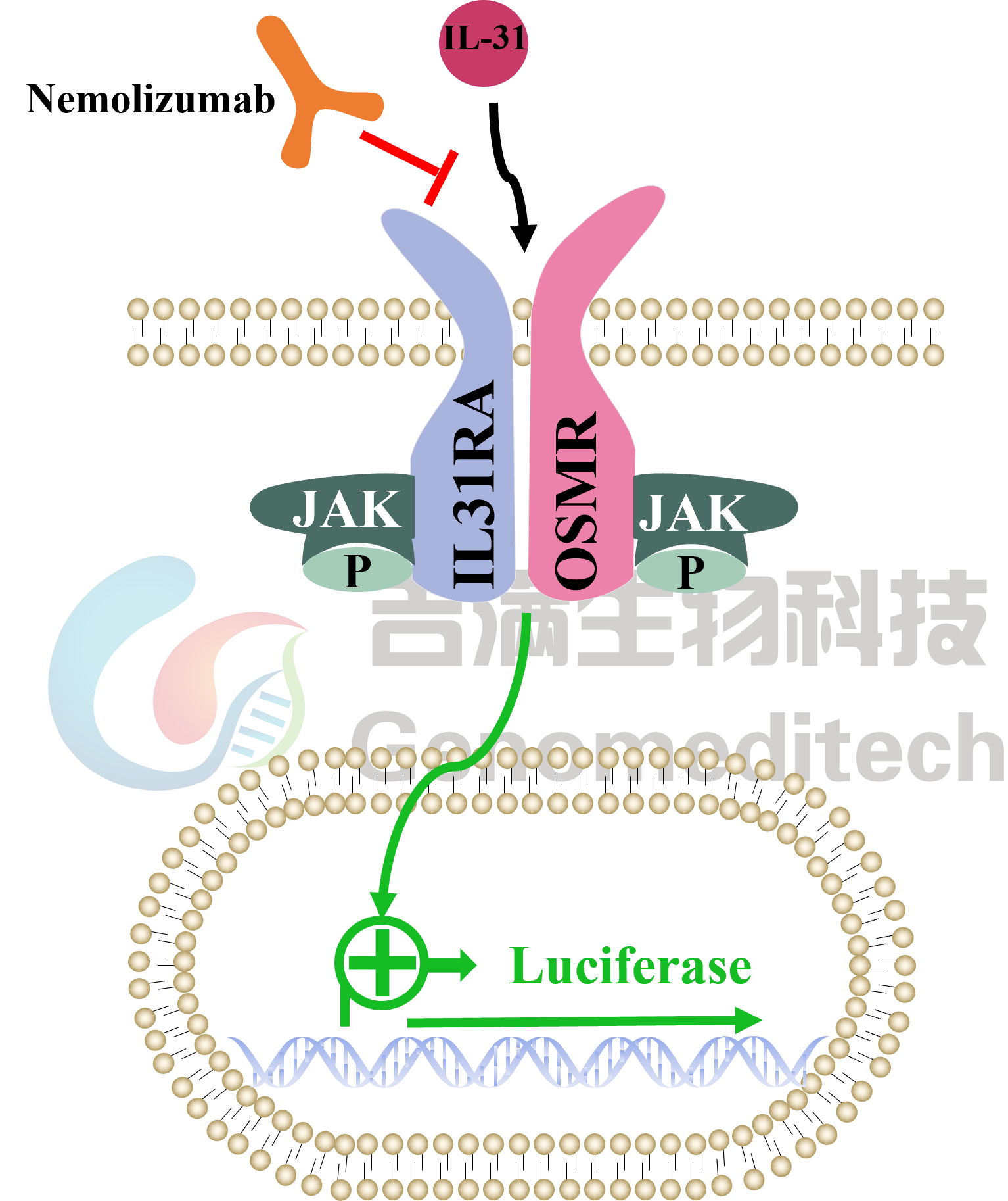 | 产品编号:GM-C38785 产品名称:Cynomolgus_IL-31RA OSMR Reporter Baf3 Cell Line 白细胞介素-31(IL-31)是一种新型细胞因子,其受体与IL-6受体相似,因此归属于IL-6细胞因子家族。其主要由活化的CD4+T淋巴细胞分泌,特别是活化的辅助性Th2细胞、肥大细胞、巨噬细胞以及树突状细胞等。IL-31主要通过感知周围神经系统的瘙痒来调节皮肤中细胞介导的免疫力,通过增加气道炎症调节肺部的免疫力,并通过防御微生物来调节肠道中的免疫力。 IL-31通过IL31RA和OSMR(oncostatin M receptor)受体形成异源二聚体复合物传递信号。其信号通路与慢性瘙痒性皮肤病(如特应性湿疹)密切相关。针对IL-31或IL-31受体的单克隆抗体相关药物可以有效地减少瘙痒和睡眠障碍,改善皮肤病变,并最大限度地减少局部类固醇的使用。 吉满生物Cynomolgus_IL-31RA OSMR Reporter Baf3 Cell Line报告基因细胞系。当IL-31结合IL31RA和OSMR受体后,激活下游信号通路,从而激活荧光素酶(Luciferase)的表达。Luciferase读值即代表信号通路的激活效果,因此可用于IL-31及等相关药物的体外效果评价。 | ![]() |