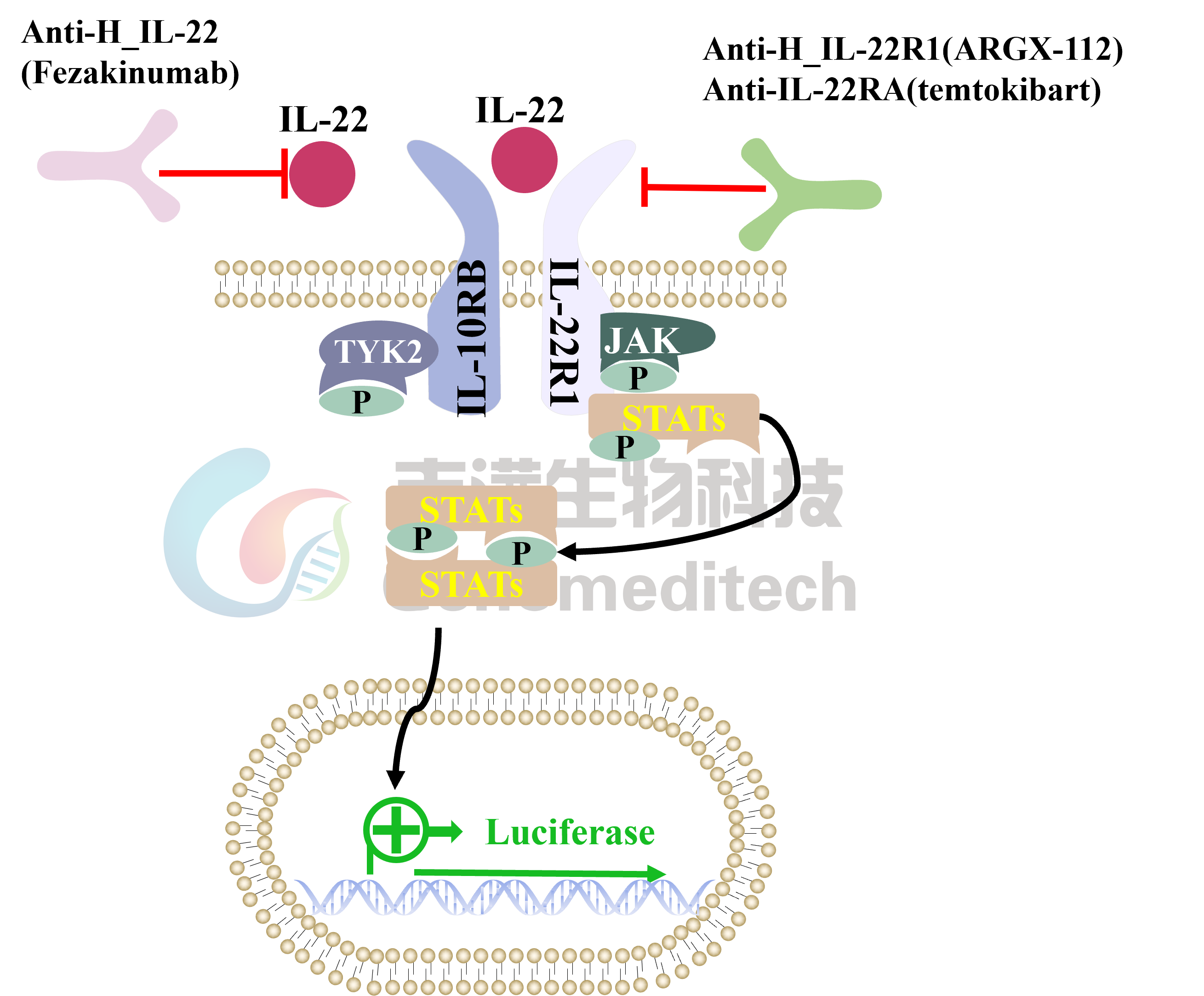 | IL-22在2000年发现,是IL-10家族一员。IL-22基因编码179氨基酸,移除33个氨基酸的信号肽后,是146个氨基酸的分泌型IL-22。IL-22与由IL-22R1和IL-10R2组成的异源二聚体跨膜受体复合物结合,激活了JAK1-STATs通路激活,产生相应的效应功能。IL-22不直接调节白细胞的功能,而是靶向一线防御系统的细胞,例如呼吸上皮细胞。其作用可以是免疫调节或促炎反应。IL-22还可能通过上调肺部的趋化因子来发挥其防御作用,并防止肺部在炎症急性期(例如真菌感染,肺炎,过敏性气道炎症的初始阶段等)中遭受损害。 吉满生物Cynomolgus_IL22 Reporter 293 Cell Line细胞系是基于JAK-STAT信号通路构建的一种Luciferase报告基因细胞系。当IL-22结合IL-22R1、IL10RB受体后,激活下游信号通路,从而激活荧光素酶(Luciferase)的表达。Luciferase读值即代表信号通路的激活效果,因此可用于IL-22相关药物的体外效果评价。 |