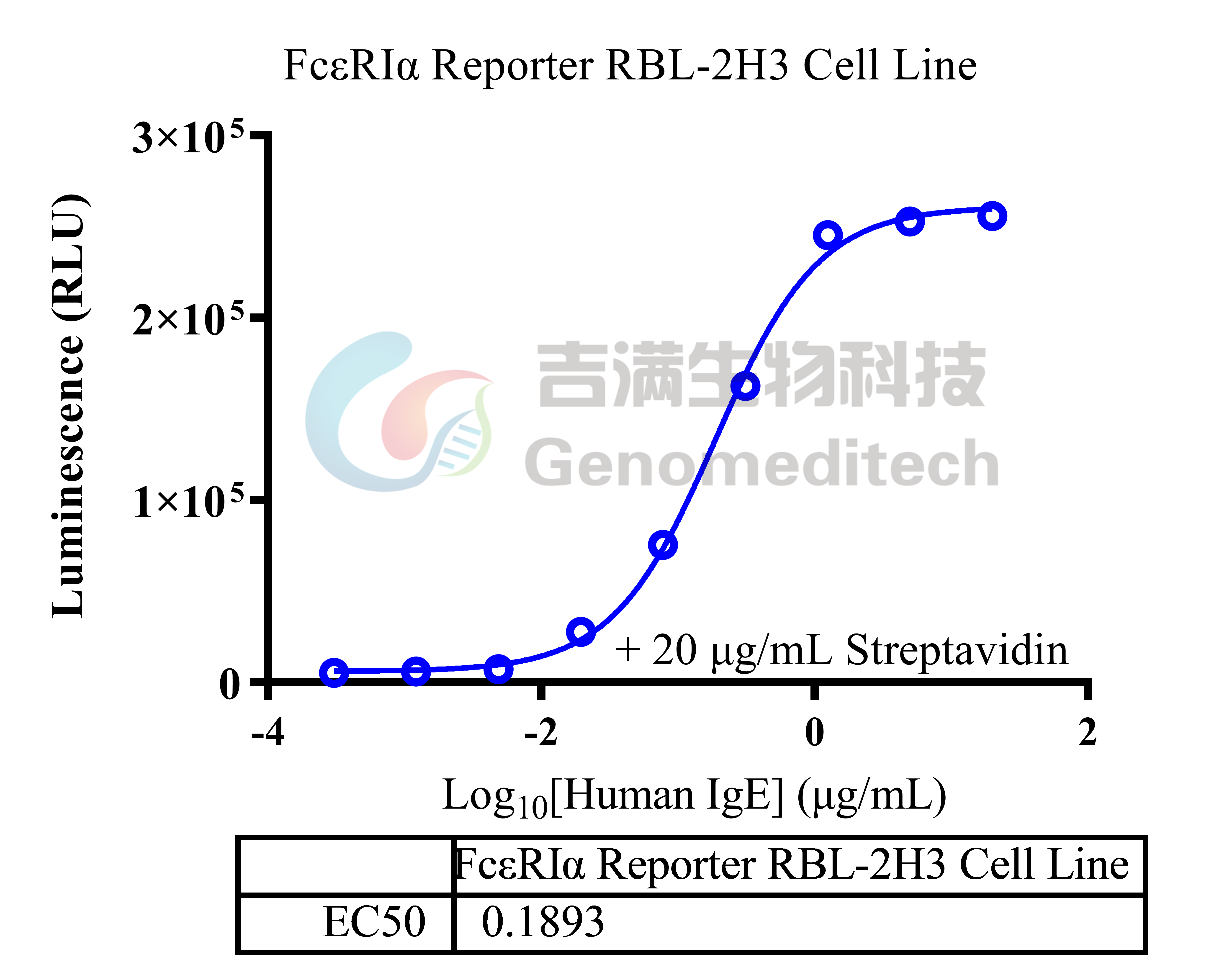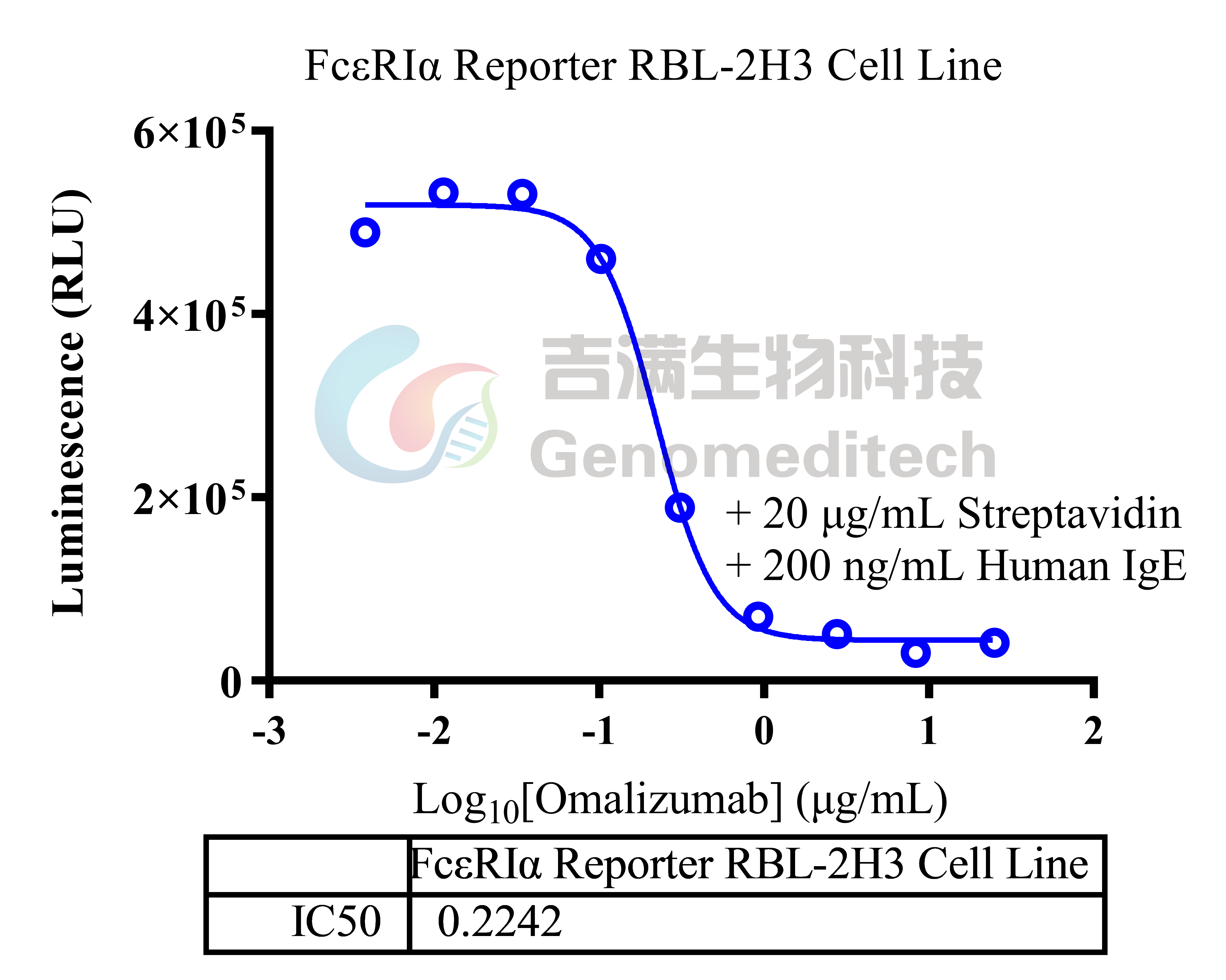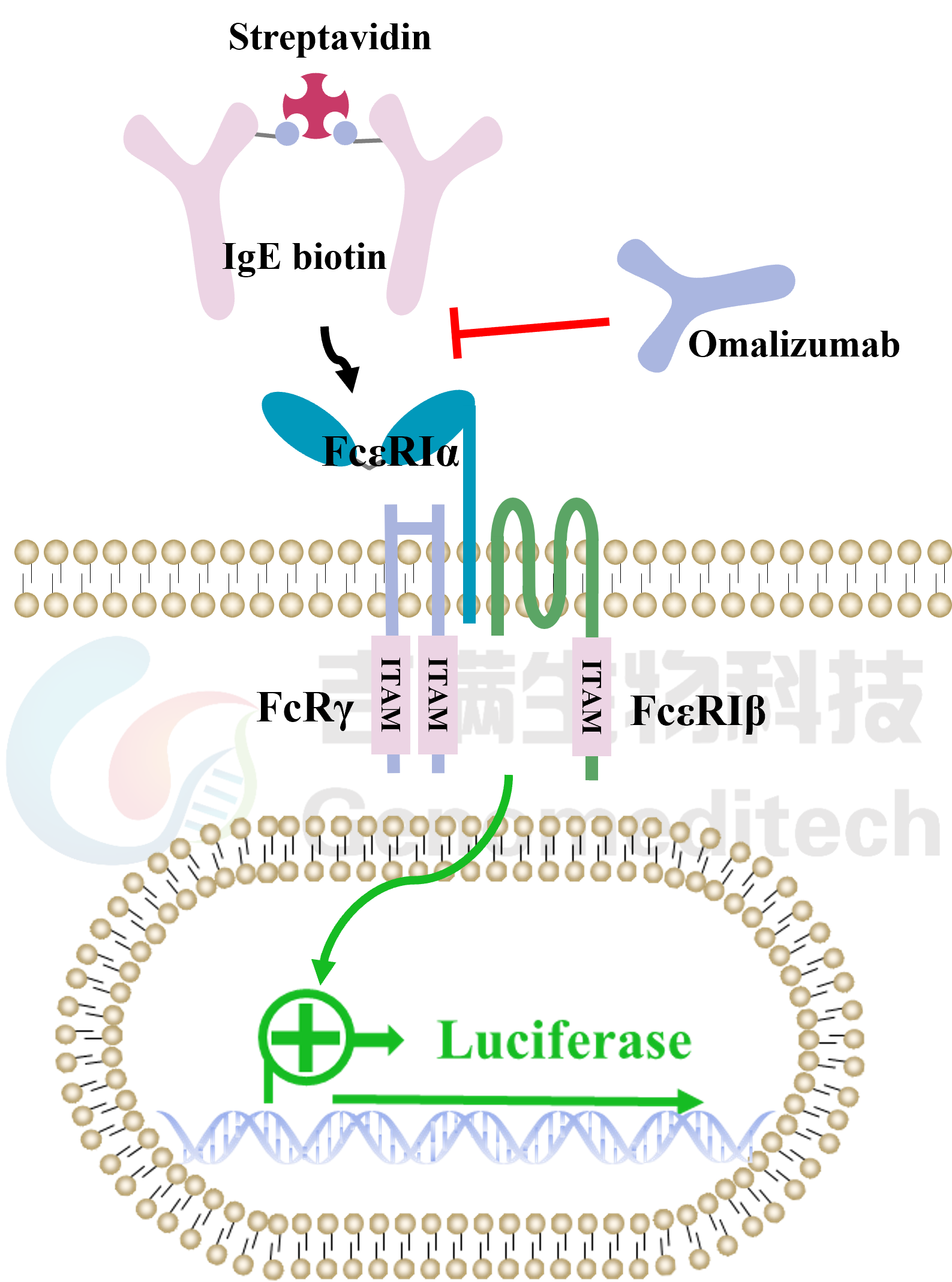 | FcεRIα(高亲和力IgE受体α亚基)是免疫球蛋白E(IgE)的特异性受体,主要表达于肥大细胞和嗜碱性粒细胞表面,在I型超敏反应中起核心作用。该蛋白由胞外区、跨膜区和短胞内尾组成,其胞外区包含两个Ig样结构域(D1和D2),直接结合IgE抗体的Fc段恒定区(Fcε3结构域)。当多价过敏原交联细胞膜上FcεRIα结合的IgE时,会触发受体聚集,激活下游信号通路(如Syk激酶、Ca²⁺内流和NFAT转录因子),导致细胞脱颗粒释放组胺、白三烯等炎症介质。FcεRIα与IgE的结合具有超高亲和力(Kd~10⁻¹⁰ M),这种特性使其成为过敏性疾病治疗的关键靶点,例如抗IgE单抗奥马珠单抗(Omalizumab)正是通过阻断IgE与FcεRIα的结合发挥治疗作用。由于人类细胞系天然缺乏FcεRIα的高表达,研究中常通过转染RBL-2H3大鼠嗜碱性白血病细胞构建模型,用于过敏机制研究和药物筛选。 吉满生物FcεRIα Reporter RBL-2H3 Cell Line是一种Luciferase报告基因细胞系。IgE-biotin通过Fc区与FcεRIα结合,同时其biotin可被链霉亲和素(Streptavidin)交联,模拟过敏原诱导的受体聚集,激活下游信号通路;Omalizumab作为抗IgE单抗,其Fab段特异性结合游离IgE的Fcε3结构域,阻断IgE与FcεRIα的结合,抑制下游信号通路,从而激活荧光素酶(Luciferase)的表达。Luciferase 读值即代表信号通路的激活效果。因此可用于评估抗IgE抗体的生物活性。 |