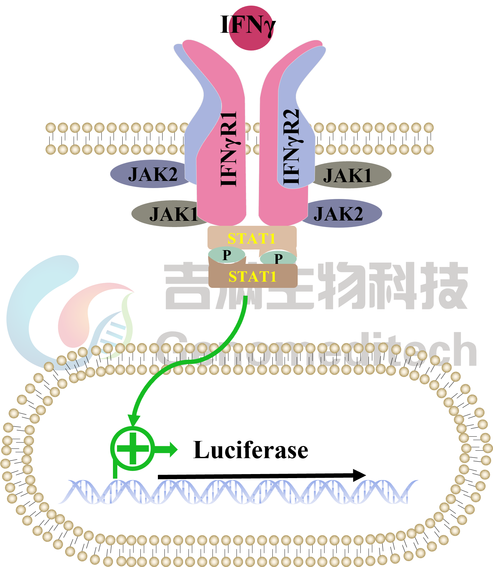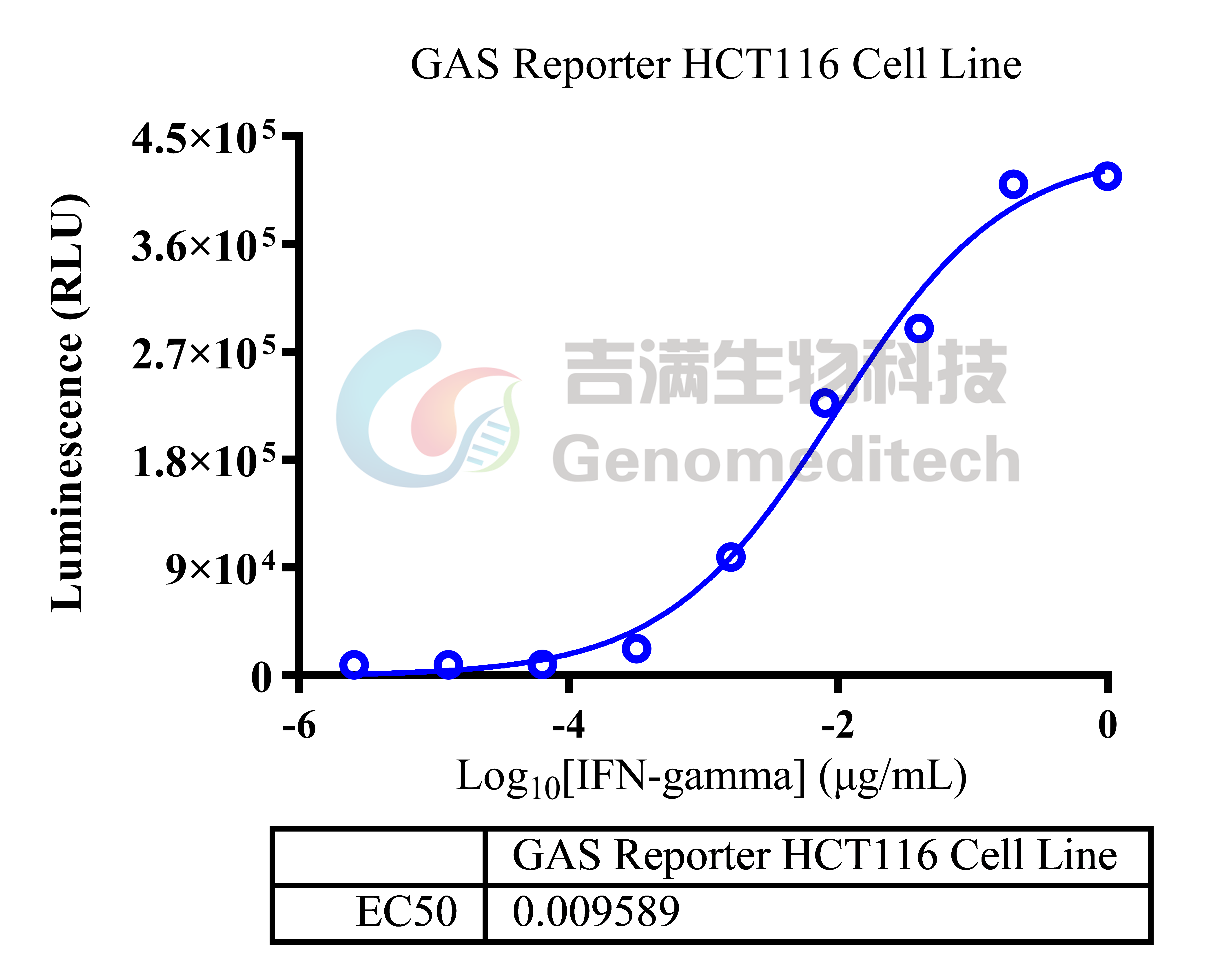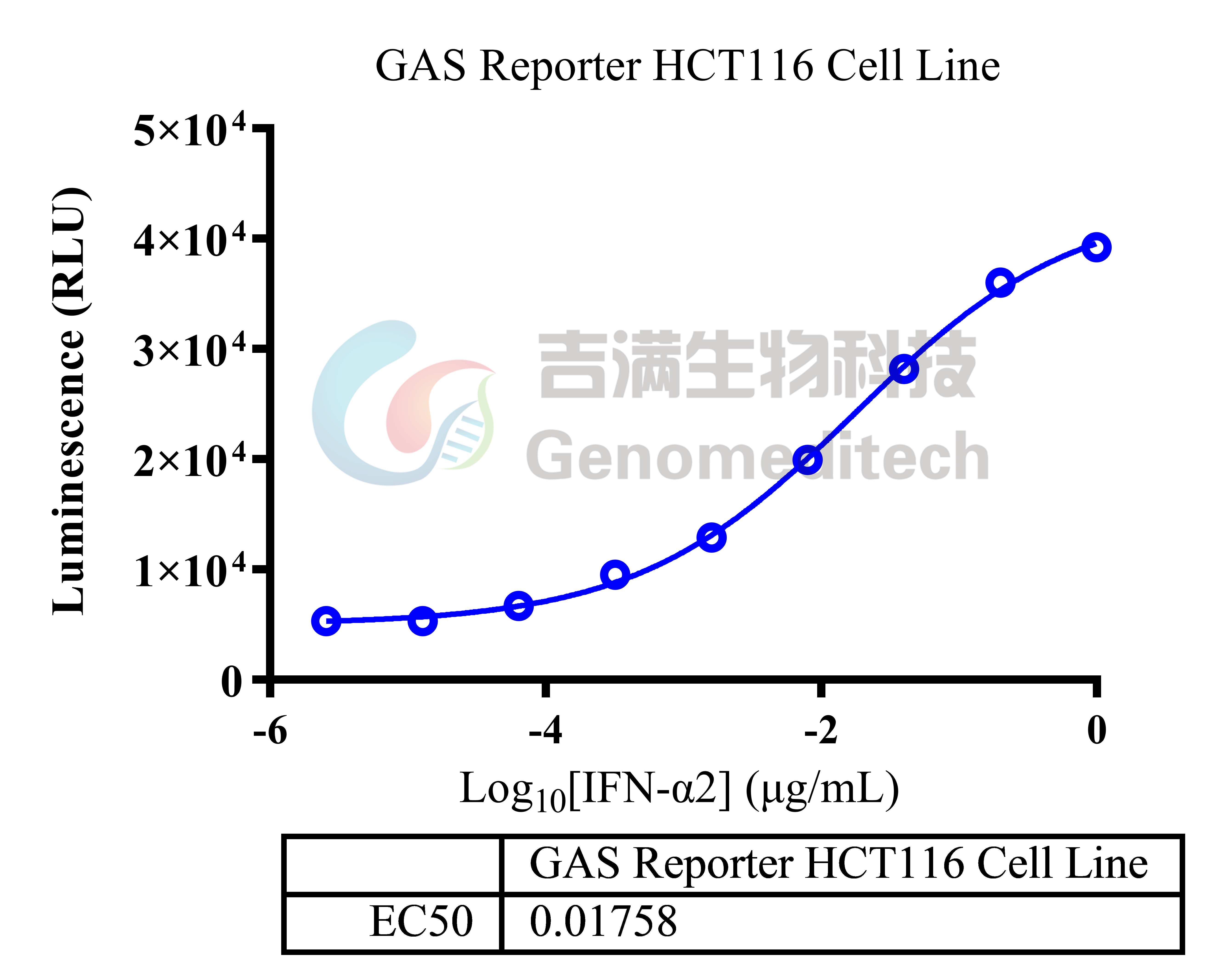 吉满生物的GAS Reporter HCT116 Cell Line是一种Luciferase报告基因细胞系,IFNγ结合受体后,可以激活下游信号通路,随后通过测定荧光信号确定荧光素酶的表达,间接评估配体对信号通路的影响程度。Luciferase 读值即代表信号通路的激活效果,因此可用于 IFNγ相关药物的体外效果评价。