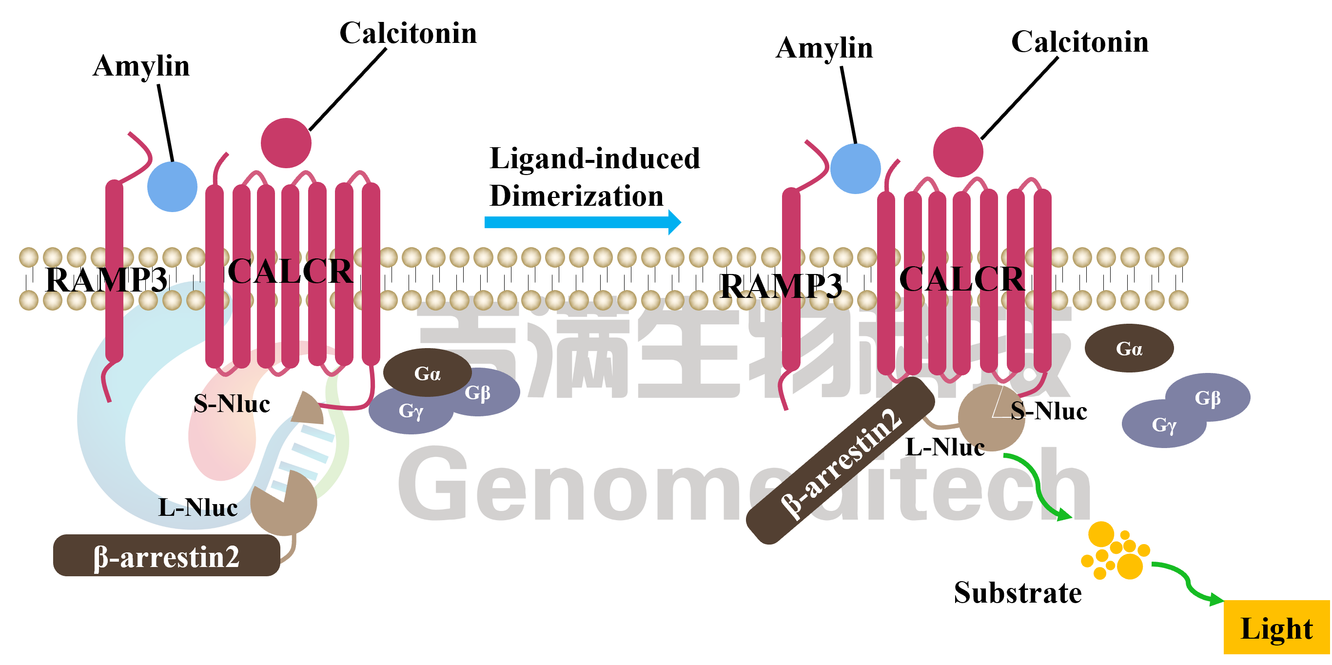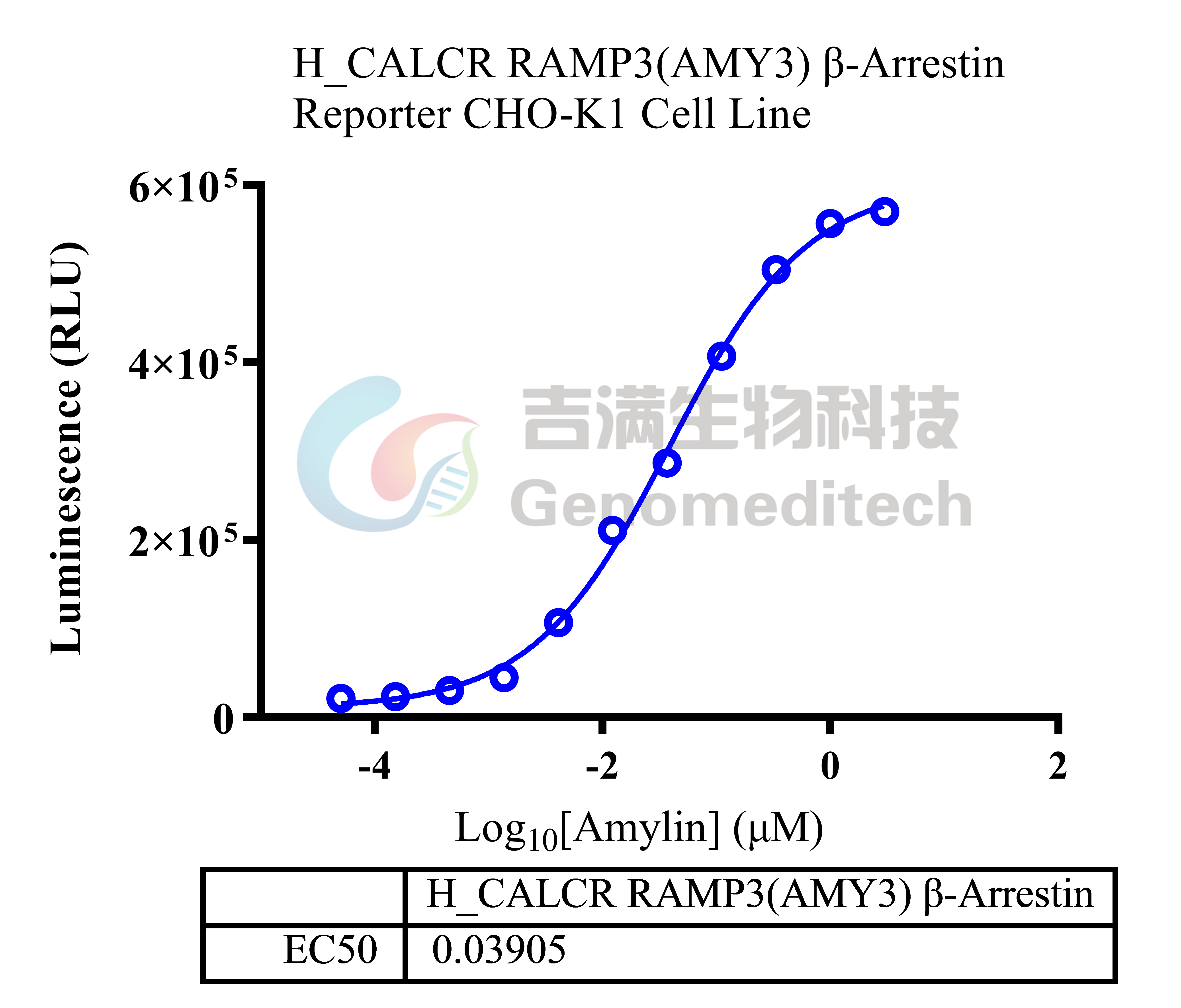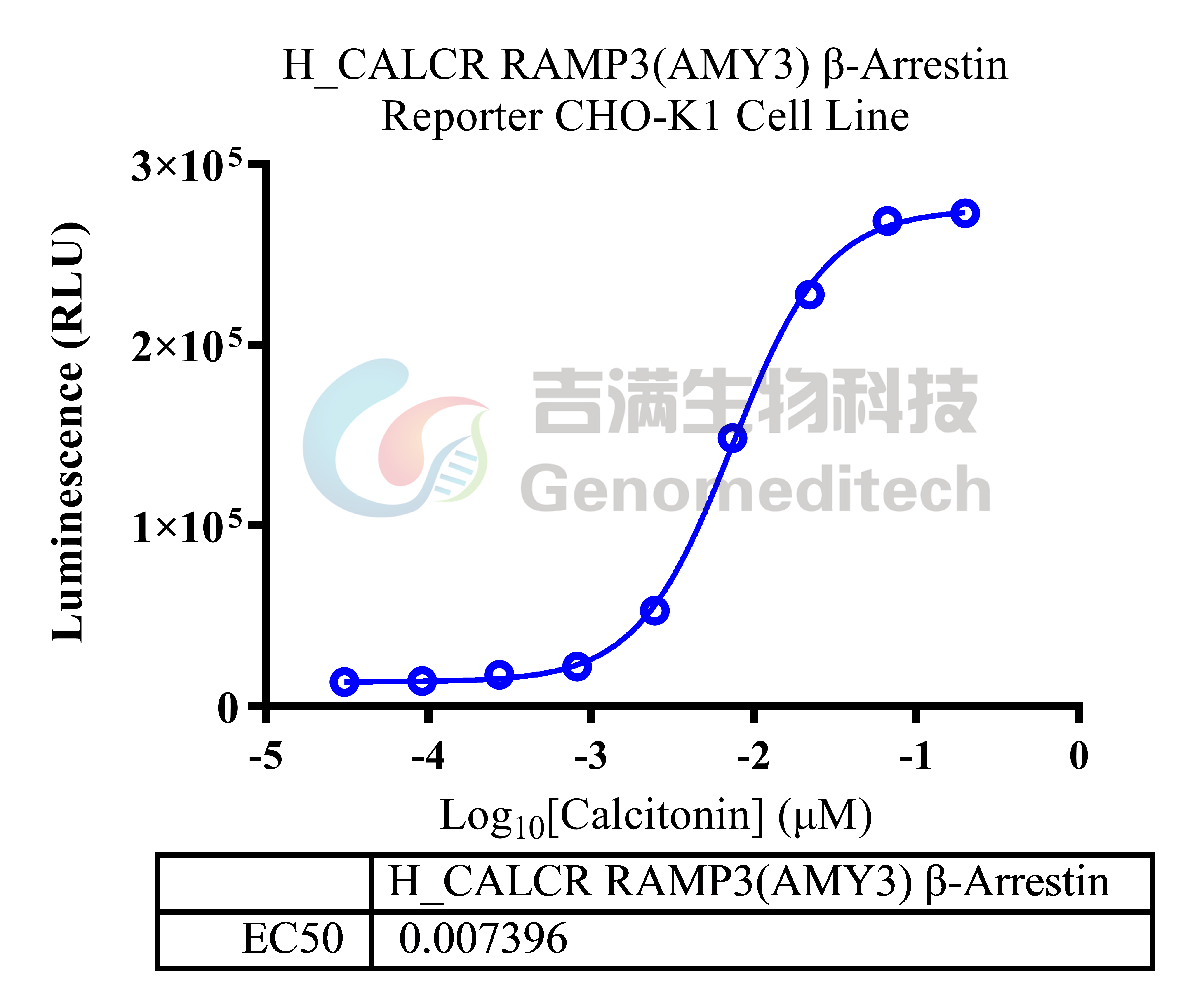 | 产品编号:GM-C42213 产品名称:H_CALCR RAMP3(AMY3) β-Arrestin Reporter CHO-K1 Cell Line 降钙素基因相关肽家族,包括降钙素(CT, Calcitonin)、胰岛淀粉样肽(AMY, Amylin)、降钙素基因相关肽(CGRP, Calcitonin Gene Related Peptide) 、肾上腺髓质素(AM, Adrenomedullin) 。 Amylin有三类潜在受体,均是由降钙素受体(CALCR、CTR)和受体活性修饰蛋白(RAMPs)形成的复合物。受体活性修饰蛋白(RAMPs)是一系列I型单跨膜蛋白,它们与G蛋白偶联受体形成异源二聚体,分为三种亚型:RAMP1,RAMP2和RAMP3。它们具有较大的细胞外氨基末端结构域,单个TM跨膜结构域和短的〜10个氨基酸的胞质结构域。这三个RAMP具有相似的基本结构,但氨基酸序列中只有约30%的同一性。CALCR和RAMP1形成的复合物AMY1, CALCR和RAMP2形成的复合物AMY2, CALCR和RAMP3形成的复合物AMY3。 Amylin由胰腺产生,并作为激素发挥作用,调节营养摄入。 Amylin神经元沉积的研究主要集中在Amylin在阿尔茨海默病中的作用。 吉满生物H_CALCR RAMP3(AMY3) β-Arrestin Reporter CHO-K1 Cell Line报告基因细胞系,是基于β-arrestin信号通路构建的一种Luciferase报告基因细胞系。当配体与CALCR/RAMPs结合后, 招募下游的融合荧光素酶报告基因的β-Arrestin,当加入荧光素酶底物后,催化底物反应,从而产生可检测的发光信号。因此可用于相关药物的体外效果评价。 | ![]() |