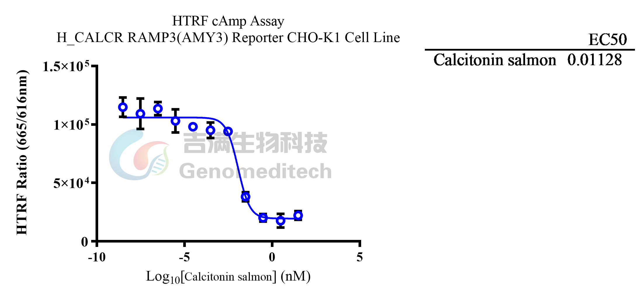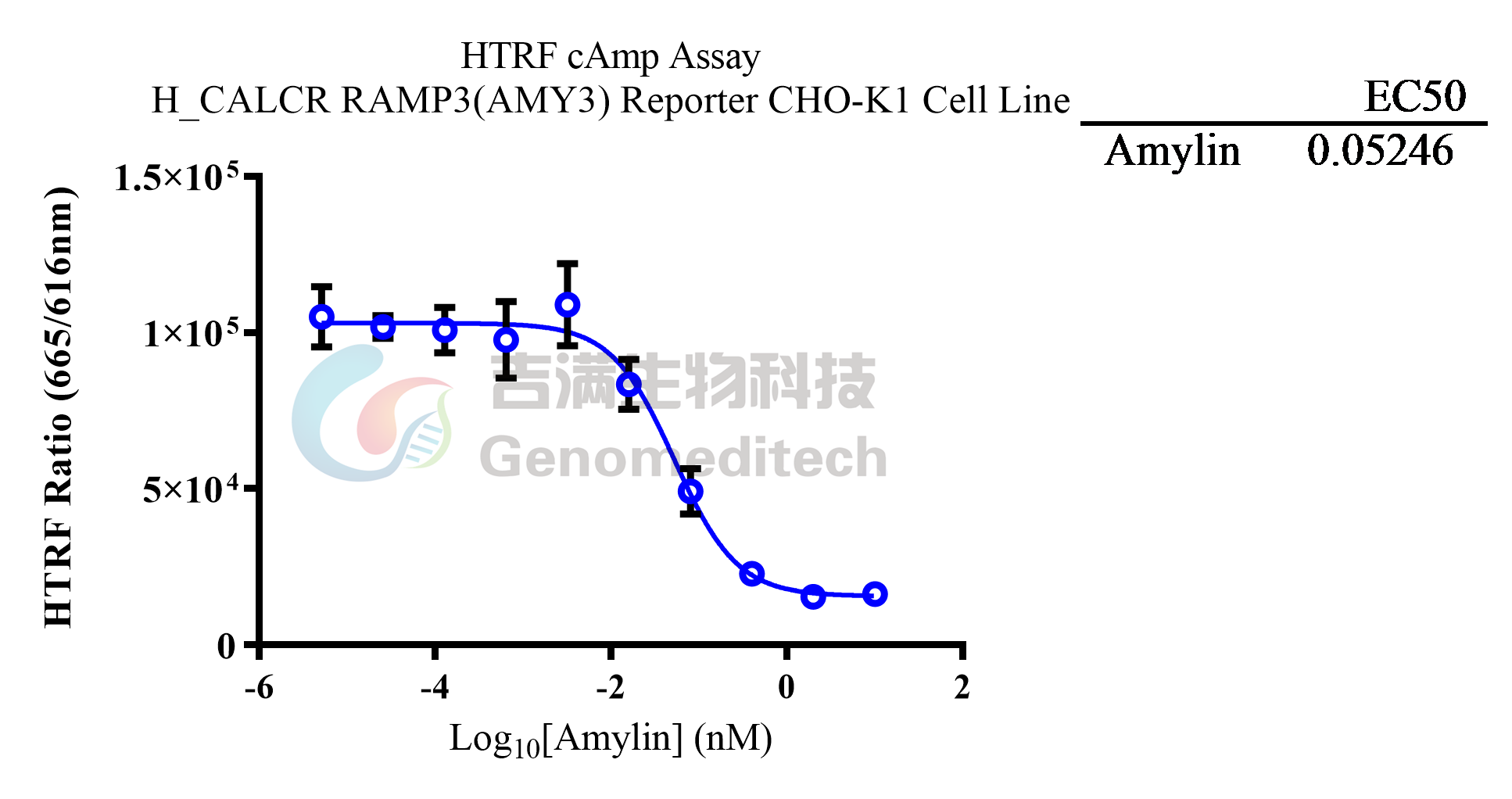 | 产品编号:GM-C26533 产品名称:H_CALCR RAMP3(AMY3) Reporter CHO-K1 Cell Line 降钙素基因相关肽家族,包括降钙素(CT, Calcitonin)、胰岛淀粉样肽(AMY, Amylin)、降钙素基因相关肽(CGRP, Calcitonin Gene Related Peptide) 、肾上腺髓质素(AM, Adrenomedullin) 。 Amylin有三类潜在受体,均是由降钙素受体(CALCR、CTR)和受体活性修饰蛋白(RAMPs)形成的复合物。受体活性修饰蛋白(RAMPs)是一系列I型单跨膜蛋白,它们与G蛋白偶联受体形成异源二聚体,分为三种亚型:RAMP1,RAMP2和RAMP3。它们具有较大的细胞外氨基末端结构域,单个TM跨膜结构域和短的〜10个氨基酸的胞质结构域。这三个RAMP具有相似的基本结构,但氨基酸序列中只有约30%的同一性。CALCR和RAMP1形成的复合物AMY1, CALCR和RAMP2形成的复合物AMY2, CALCR和RAMP3形成的复合物AMY3。 Amylin由胰腺产生,并作为激素发挥作用,调节营养摄入。 Amylin神经元沉积的研究主要集中在Amylin在阿尔茨海默病中的作用。 Amylin与受体复合物结合后,复合物与G蛋白相互作用,Gαs亚基从复合物中分离并激活腺苷酸环化酶,产生cAMP。 细胞内cAMP浓度的升高刺激cAMP依赖的信号通路,最终导致转录因子cAMP反应元件结合蛋白与启动子结合,诱导基因表达。 吉满生物H_CALCR RAMP3(AMY3) Reporter CHO-K1 Cell Line报告基因细胞系,是基于cAMP信号通路构建的一种Luciferase报告基因细胞系。当Amylin与CALCR/RAMPs结合后,通过激活cAMP信号通路激活荧光素酶(Luciferase)的表达。Luciferase读值即代表信号通路的激活效果,因此可用于Amylin相关药物的体外效果评价。 | ![]() |