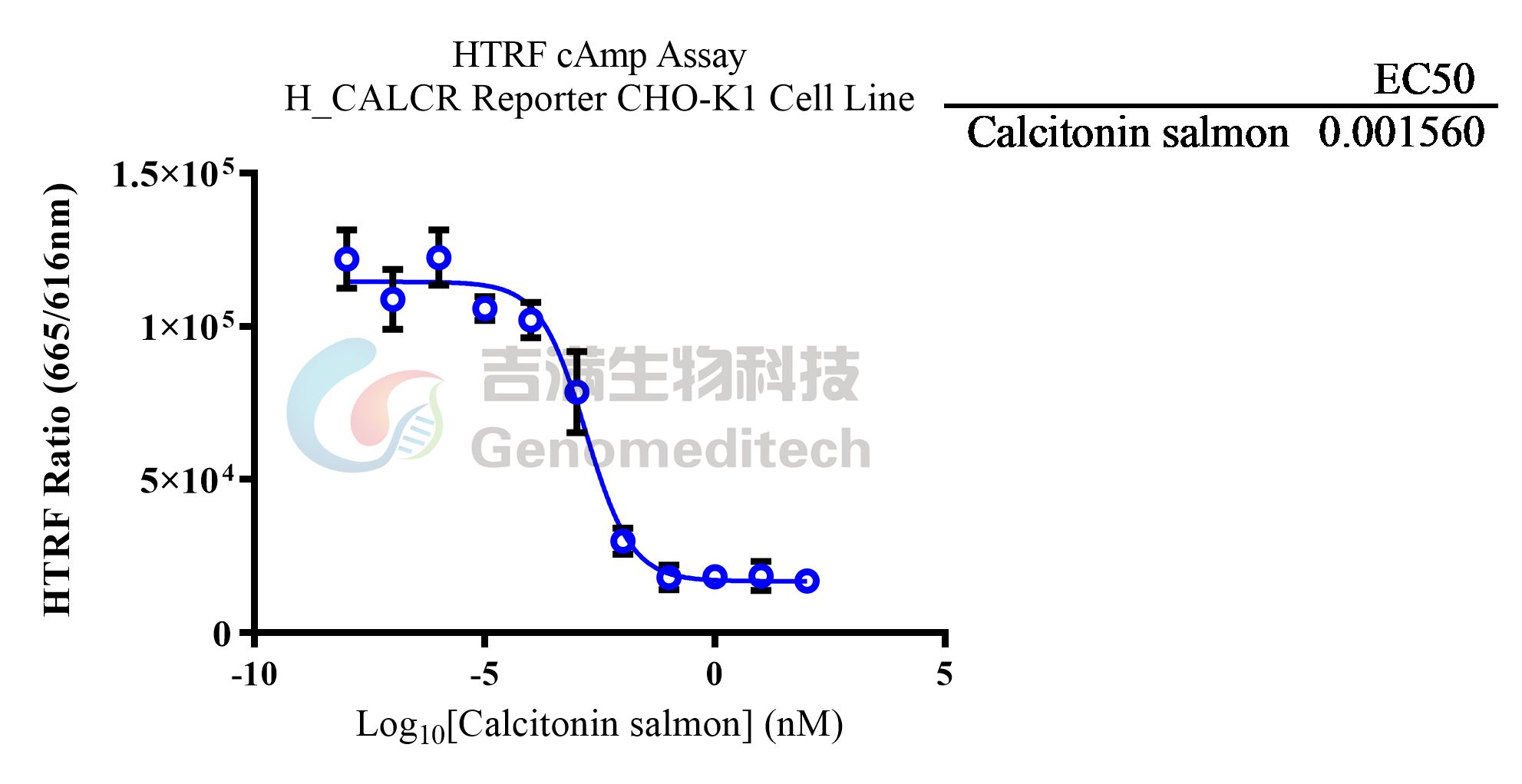 | 产品编号:GM-C37605 产品名称:H_CALCR Reporter CHO-K1 Cell Line CALCR(Calcitonin Receptor)是一种重要的细胞膜受体,属于G蛋白偶联受体(GPCR)家族,具有多个跨膜区段,能够与不同的G蛋白相互作用,激活下游信号通路。其结构的多样性使其能够与多种配体结合,调节不同的生理反应。 CALCR主要与降钙素(Calcitonin)结合,参与调节体内钙的平衡。在骨骼、肾脏和中枢神经系统中表达,发挥着多种生理功能。CALCR的功能失调与多种疾病相关,如骨质疏松症、甲状腺疾病和某些类型的癌症。因此,CALCR及其信号通路成为了潜在的治疗靶点。 吉满生物H_CALCR Reporter CHO-K1 Cell Line报告基因细胞系,是基于cAMP信号通路构建的一种Luciferase报告基因细胞系。当Calcitonin salmon与CALCR结合后,通过激活cAMP信号通路激活荧光素酶(Luciferase)的表达。Luciferase读值即代表信号通路的激活效果,因此可用于Calcitonin salmon相关药物的体外效果评价。 | ![]() |
