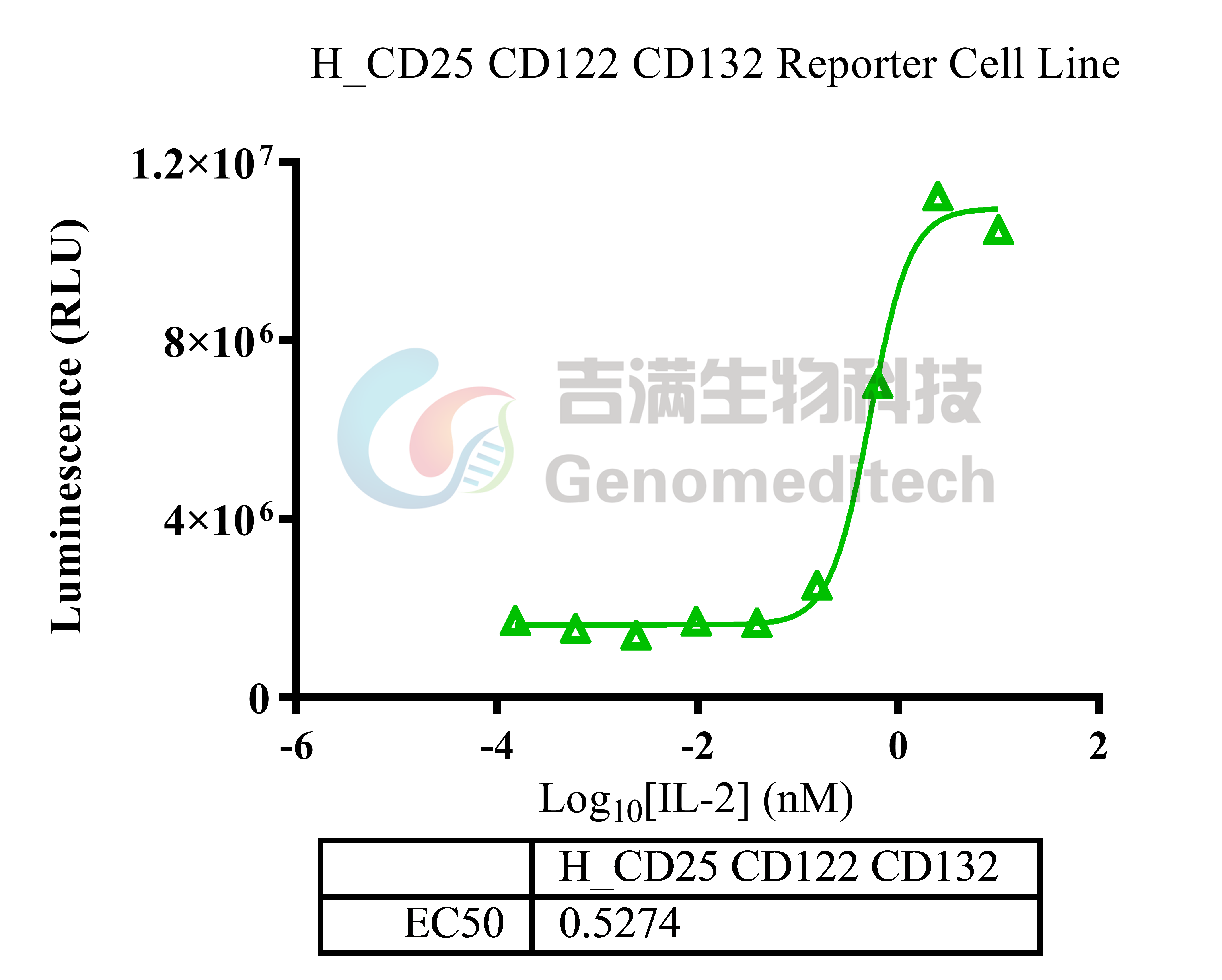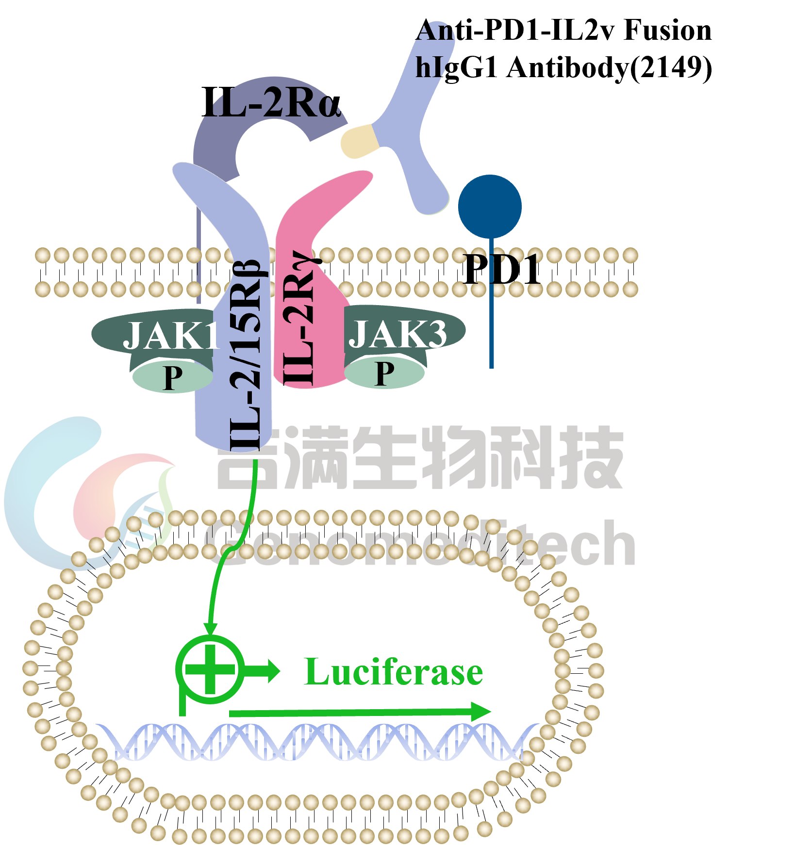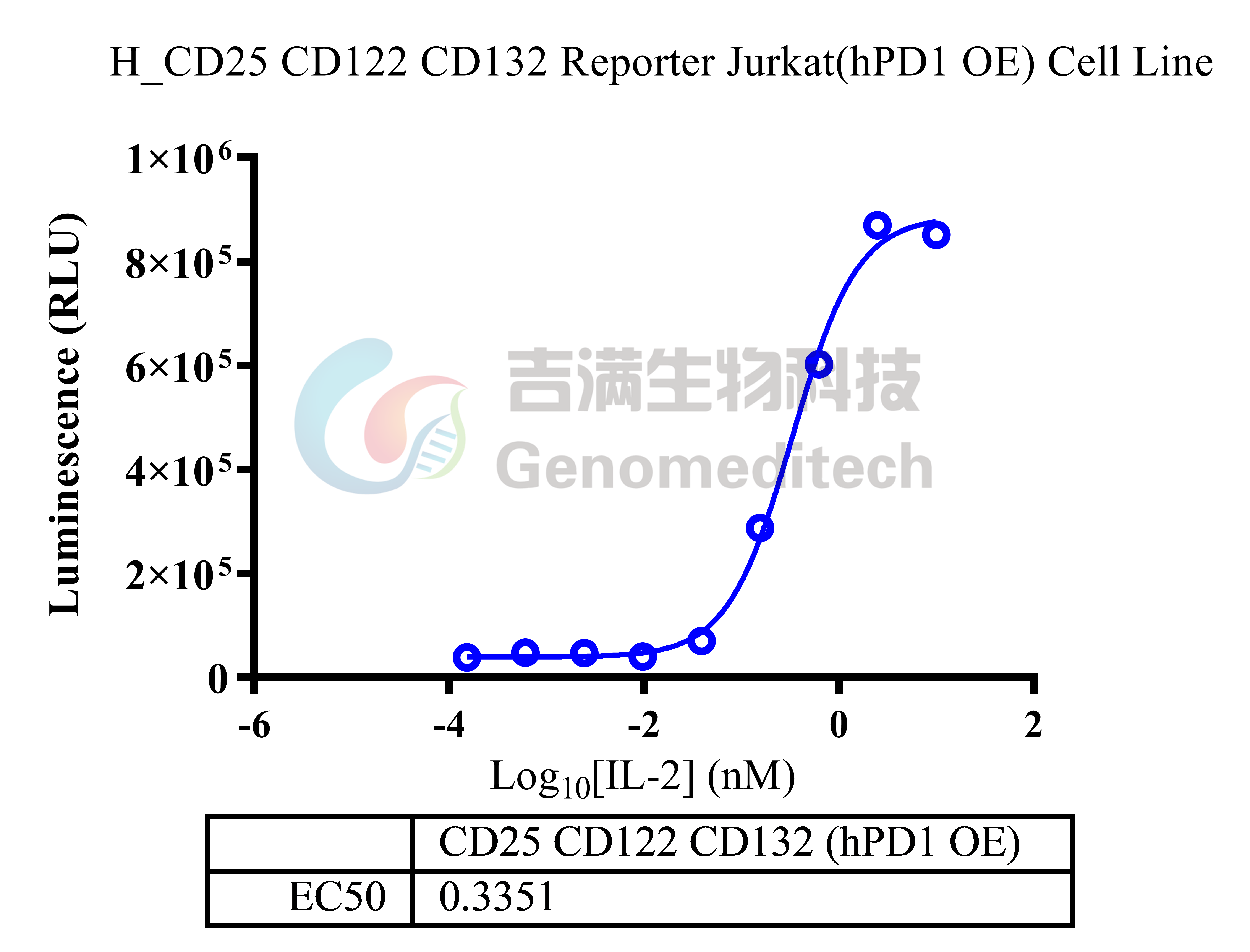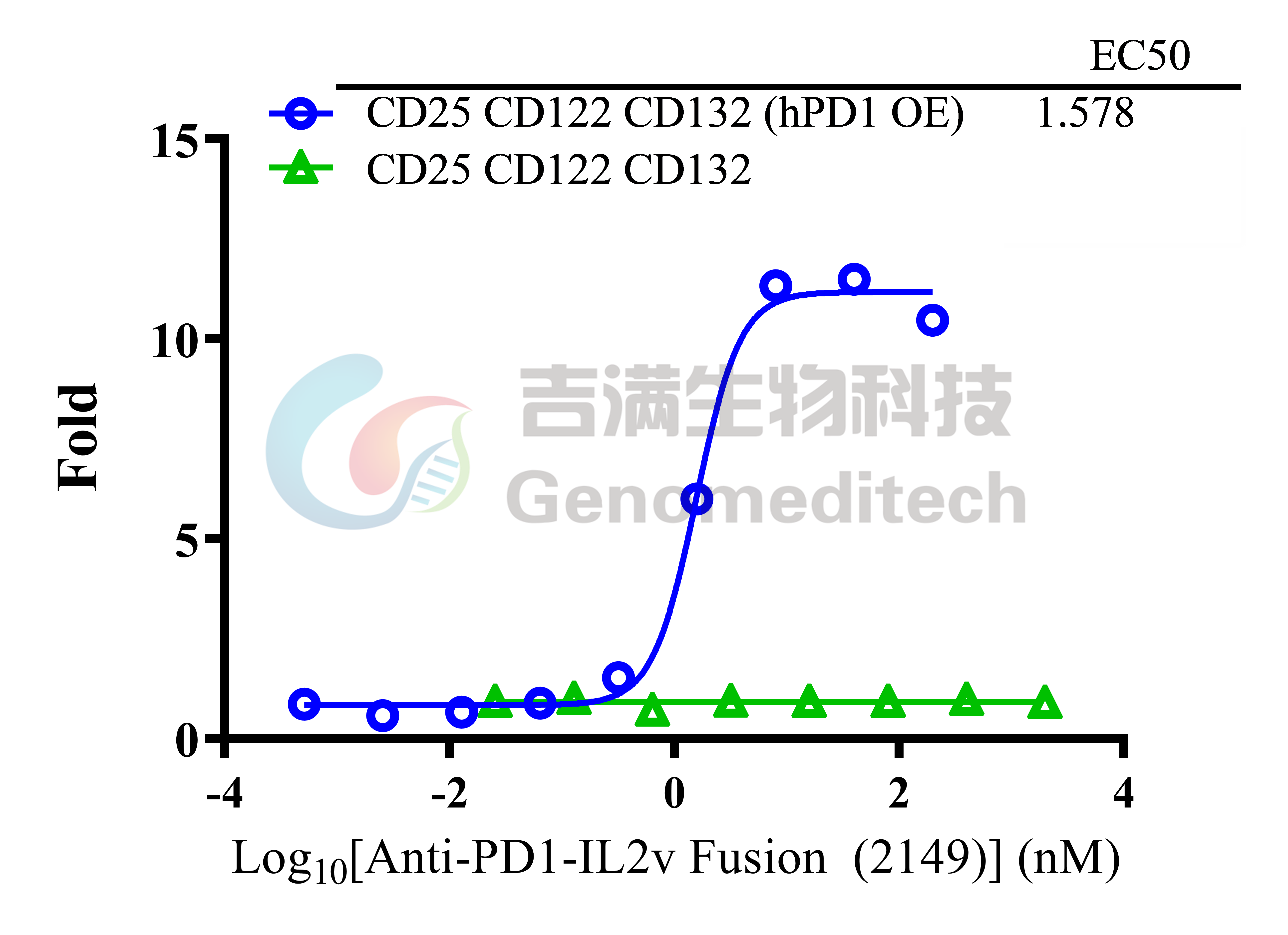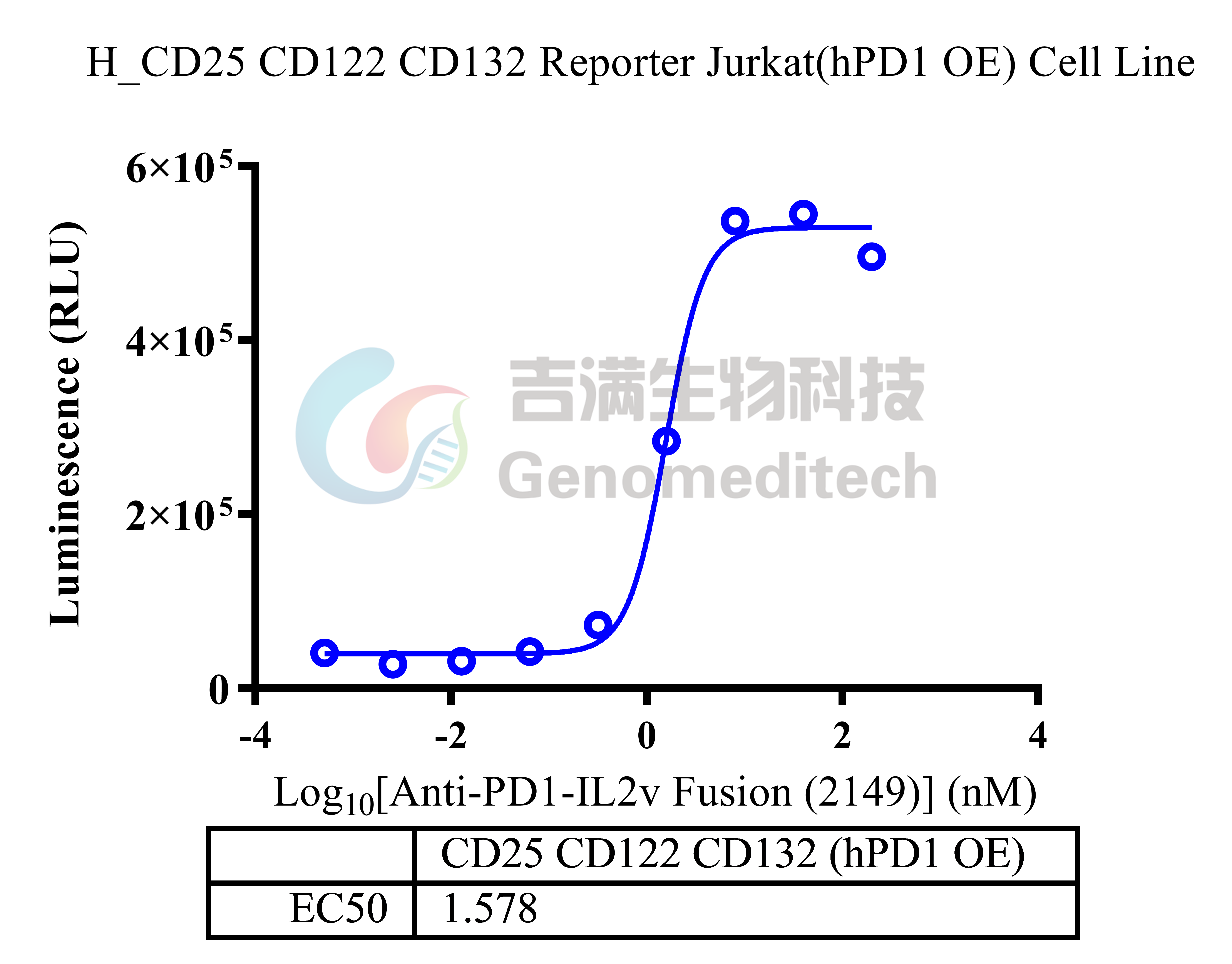 | 产品编号:GM-C41979 产品名称:H_CD25 CD122 CD132 Reporter Jurkat(hPD1 OE) Cell Line 白细胞介素‑2(IL‑2)由活化 T 细胞在 TCR 识别抗原后产生,是肿瘤浸润淋巴细胞的重要生长因子。它既促进效应与初始 T 细胞增殖存活,也会激活调节性 T 细胞(Tregs)。其受体IL-2R由 CD25(IL‑2Rα)、CD122(IL‑2Rβ)、CD132(γc) 组成。三种亚基可形成不同亲和力复合体:高亲和力三聚体 CD25+CD122+CD132、中等亲和力二聚体 CD122+CD132、以及仅用于配体捕获的低亲和力 CD25 单体。 程序性死亡受体 1(PD 1,编码基因为PDCD1)是免疫检查点受体,主要表达于活化的T细胞、B细胞与部分髓系细胞表面。其胞外区为免疫球蛋白样结构域,胞内含ITIM/ITSM基序,可在与配体PD L1或PD L2结合后招募SHP 2等磷酸酶,抑制TCR与CD28信号传导,从而降低细胞增殖、细胞毒活性与细胞因子分泌,维持外周耐受并防止免疫过度活化。 Anti-PD1-IL2v是一类将抗PD-1单克隆抗体与经工程改造的变体白细胞介素-2(IL‑2 variant, IL2v)通过融合蛋白或偶联形式整合于一体的新型免疫治疗药物。 吉满生物H_CD25 CD122 CD132 Reporter Jurkat(hPD1 OE) Cell Line报告基因细胞系同时表达CD25、CD122、CD132以及PD1四个受体基因,当Anti-PD-1-IL-2v结合PD-1并将IL-2v递送至IL-2R时,可激活下游IL-2R信号通路,从而诱导荧光素酶表达。Luciferase读值即代表信号通路的激活效果,因此可用于相关药物的体外效果评价。 | ![]() |