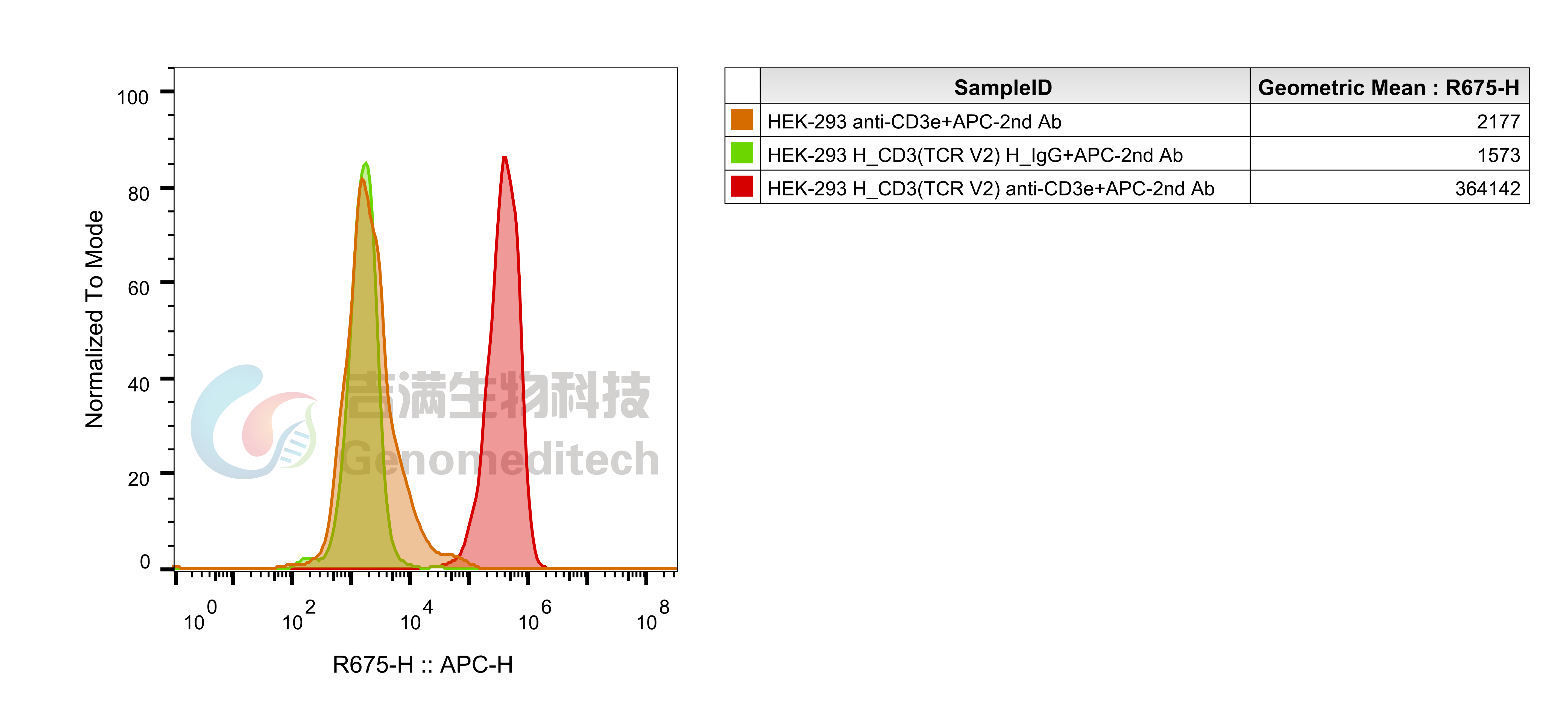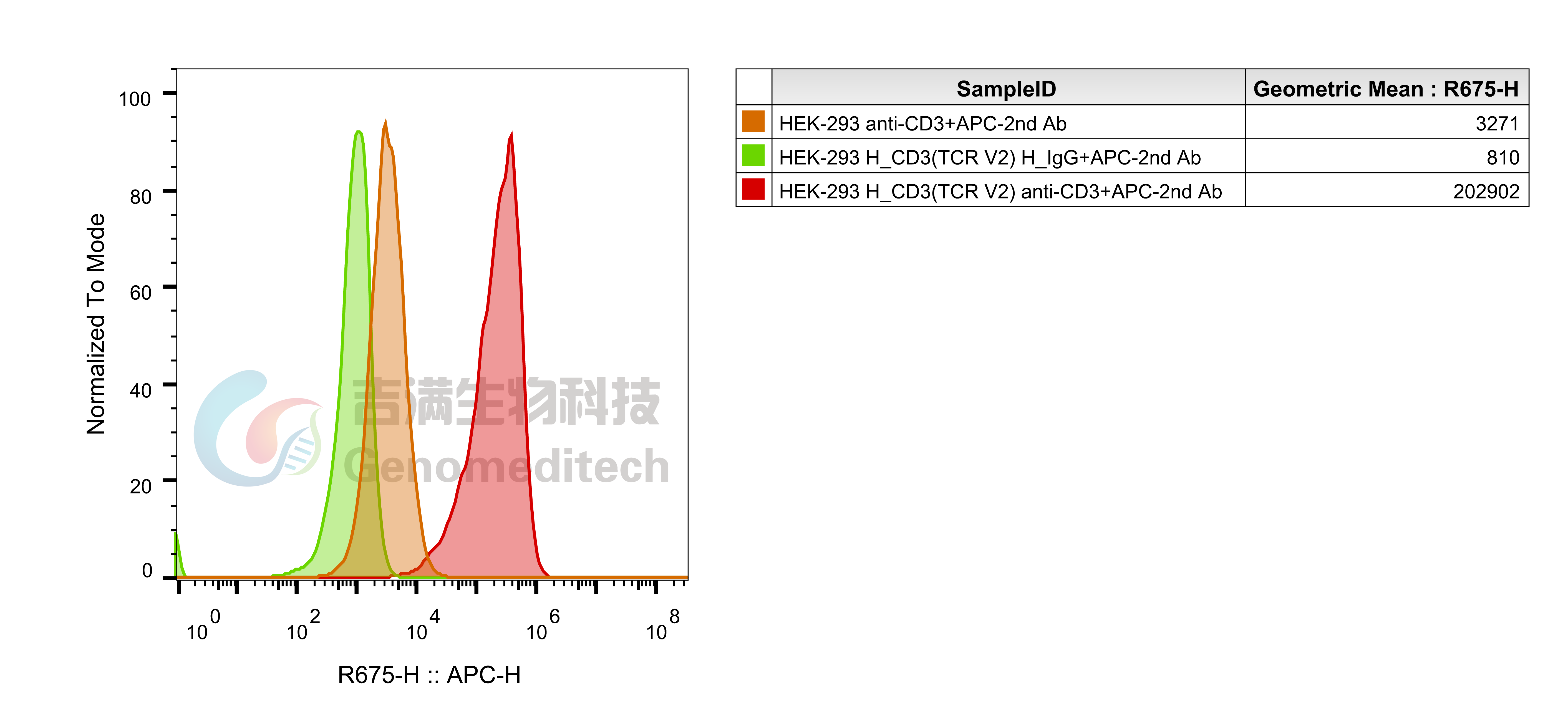 | CD3复合物,又称T3复合物,是一种由四种不同多肽链组成的多聚体蛋白复合物:ε、γ、δ和ζ链。这些链组装并形成三对二聚体:εγ、εδ和ζζ。CD3蛋白复合物是T细胞谱系的一个定义性特征,因此抗CD3抗体可有效用作T细胞的标志物。在T细胞中,CD3复合物与T细胞受体(TCR)α链和β链非共价结合,形成TCR-CD3信号传导复合物,该复合物对抗原识别和T细胞活化至关重要。 H_CD3(TCR V2) HEK-293 Cell Line过表达细胞系经过工程改造,组成型表达人CD3复合物以及T细胞受体α和β(TCRαβ)链。该细胞株与GM-C30877 H_CD3 HEK-293 Cell Line的关键区别在于TCR组分的序列不同。 |