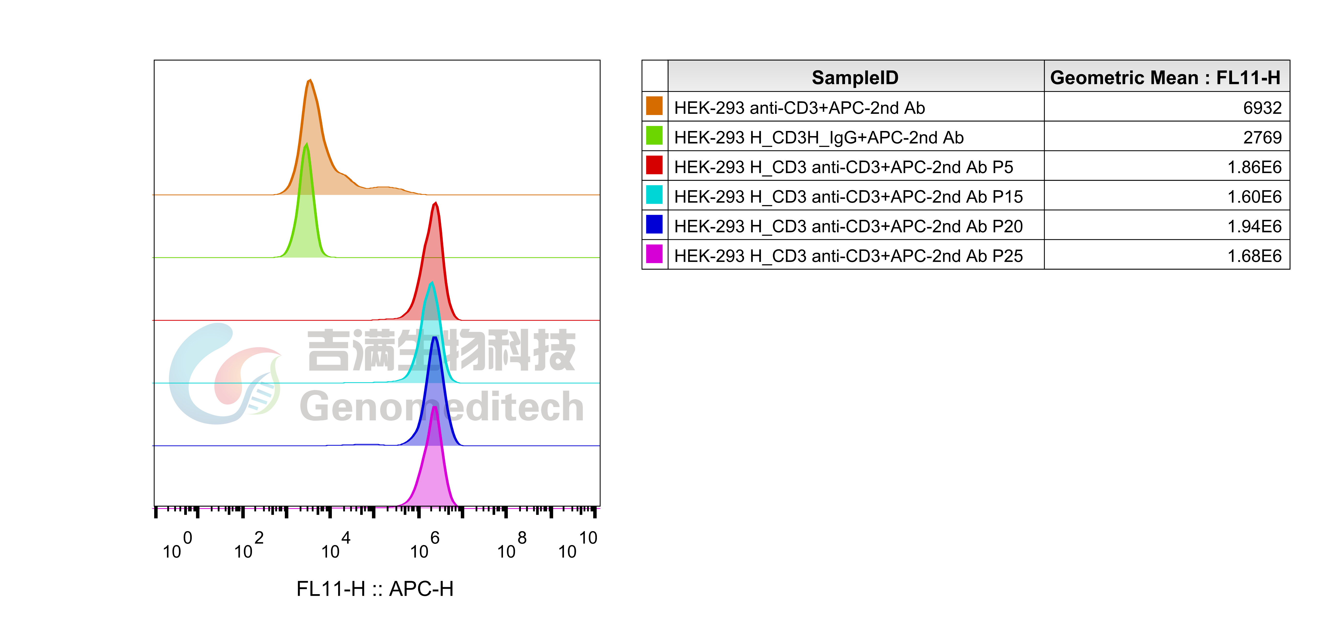 | 产品编号:GM-C30877 产品名称:H_CD3 HEK-293 Cell Line CD3是一种多聚体蛋白复合物,又称为T3复合物,由四个不同的多肽链组成;epsilon (ε)、gamma (γ)、delta (δ)和zeta (ζ),它们组装并作为三对二聚体(εγ、εδ、ζζ)发挥作用。CD3 蛋白复合物是 T 细胞谱系的决定性特征,因此抗CD3抗体可有效用作T细胞标记物。 吉满生物H_CD3 HEK-293 Cell Line过表达细胞系经过工程改造,可表达CD3复合物,可用于筛选CD3相关抗体。 | ![]() |