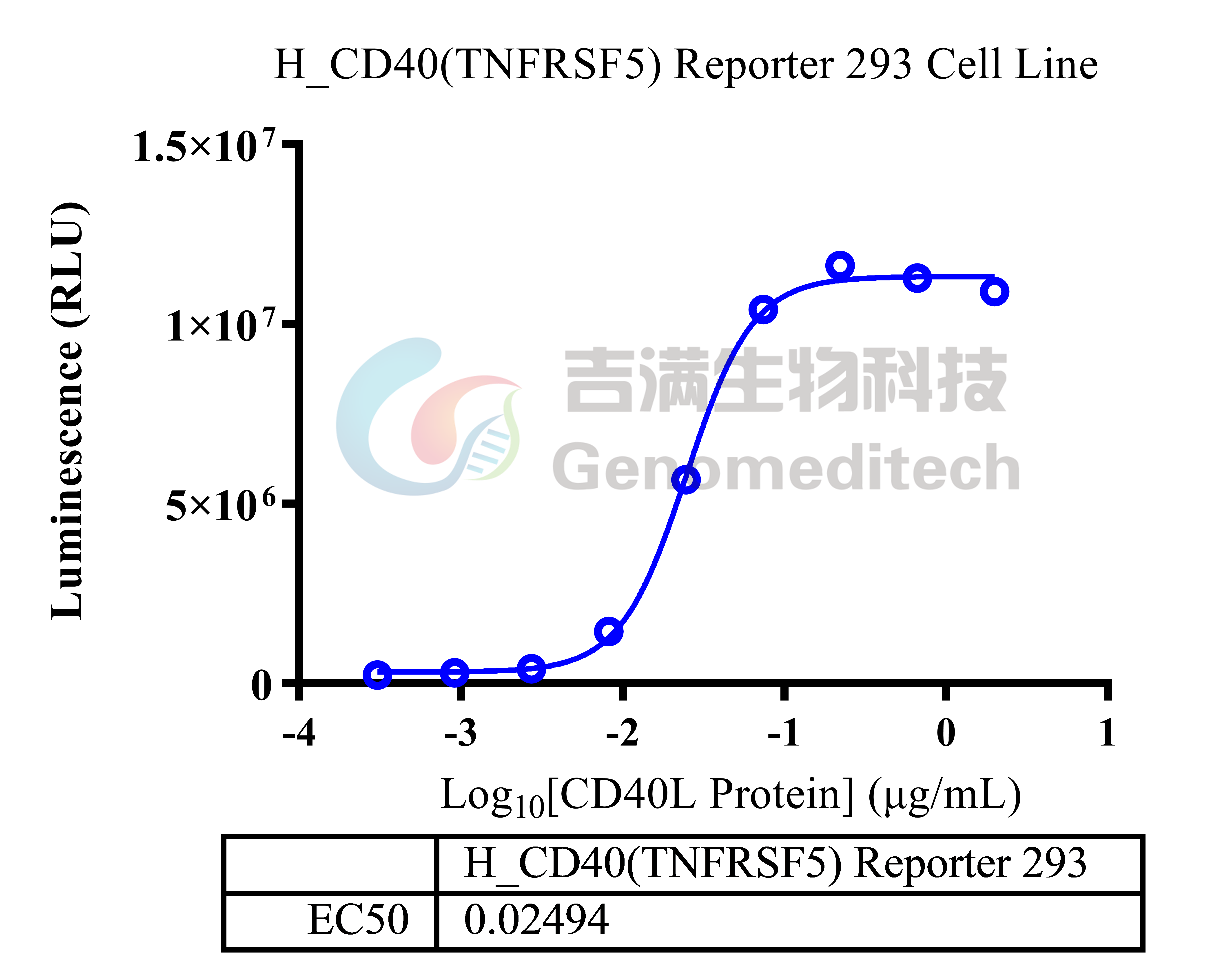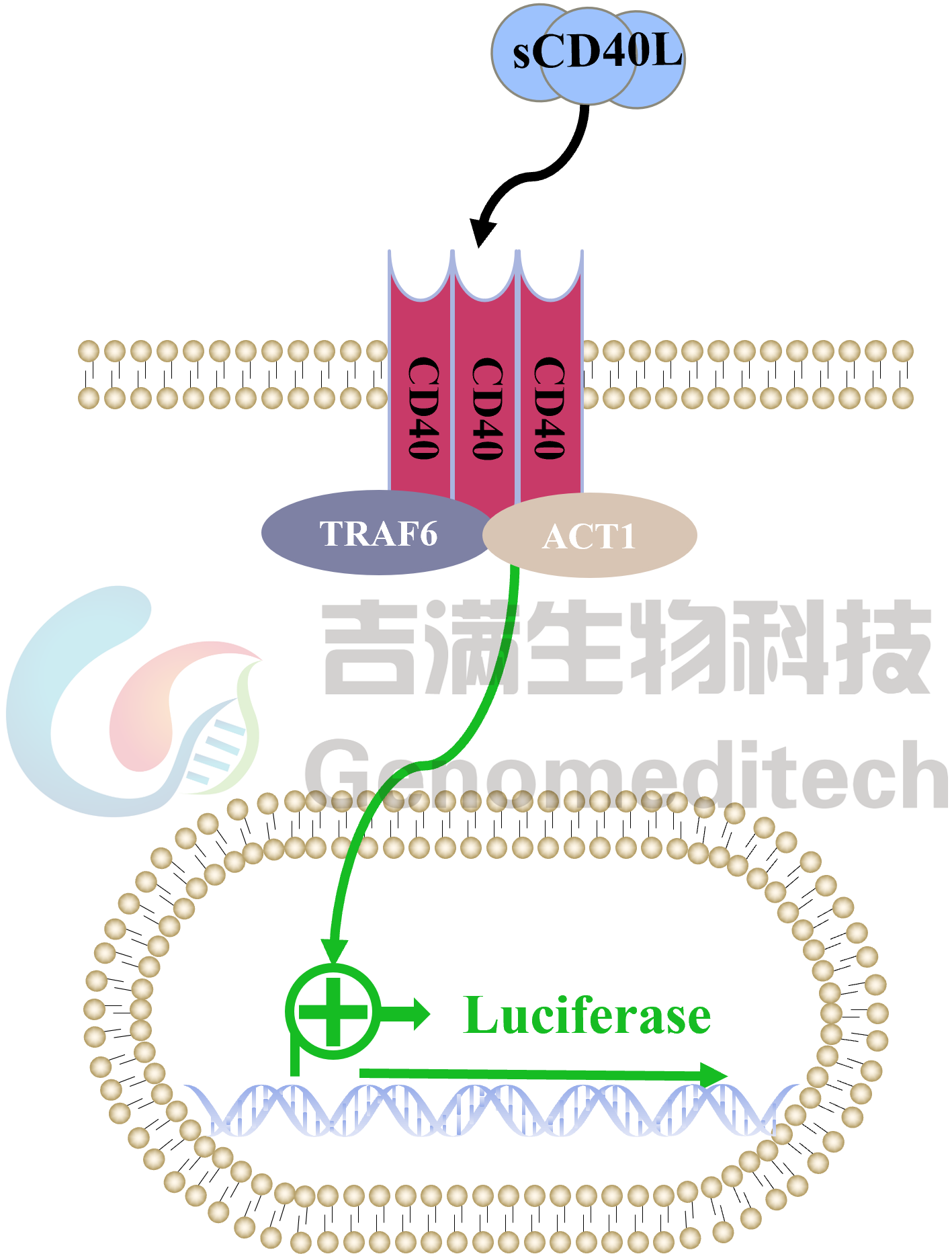 产品编号:GM-C03829 产品名称:H_CD40(TNFRSF5) Reporter 293 Cell Line 分化簇40(Cluster of differentiation 40,简称CD40),是一种分布于抗原呈递细胞(APC)的协同刺激因子暨蛋白受体。CD40与辅助T细胞上的CD154(CD40L)结合后,抗原呈递细胞激活,产生一系列下游反应。CD40与Act1和TRAF6分别结合后,激活下游报告基因信号。 吉满生物H_CD40(TNFRSF5) Reporter 293 Cell Line报告基因细胞系。当CD40与 Act1和TRAF6分别结合后,激活下游报告基因,从而激活荧光素酶(Luciferase)的表达。Luciferase读值即代表信号通路的激活效果,因此可用于CD40相关药物的体外效果评价。 | ![]() |