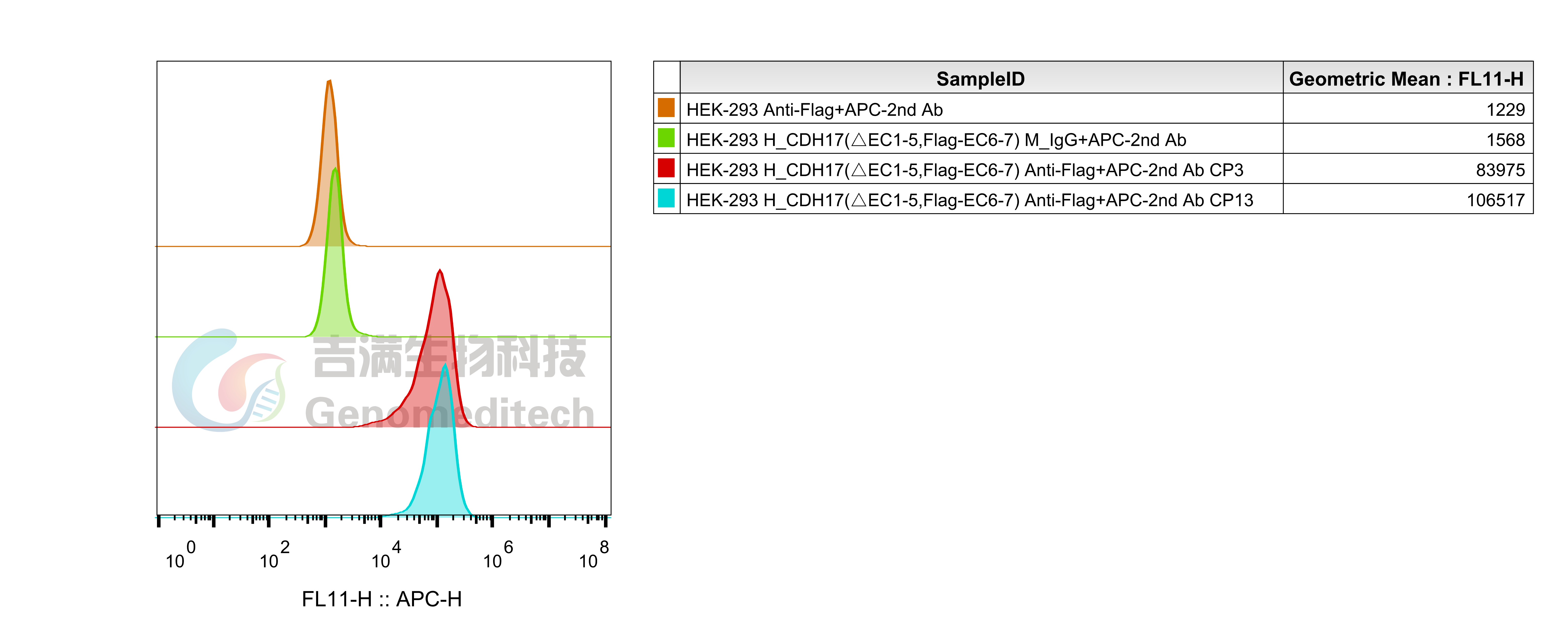 基于HEK-293细胞,使用慢病毒技术构建的稳定表达H_CDH17(ΔEC1-5,Flag-EC6-7)的单克隆细胞系。