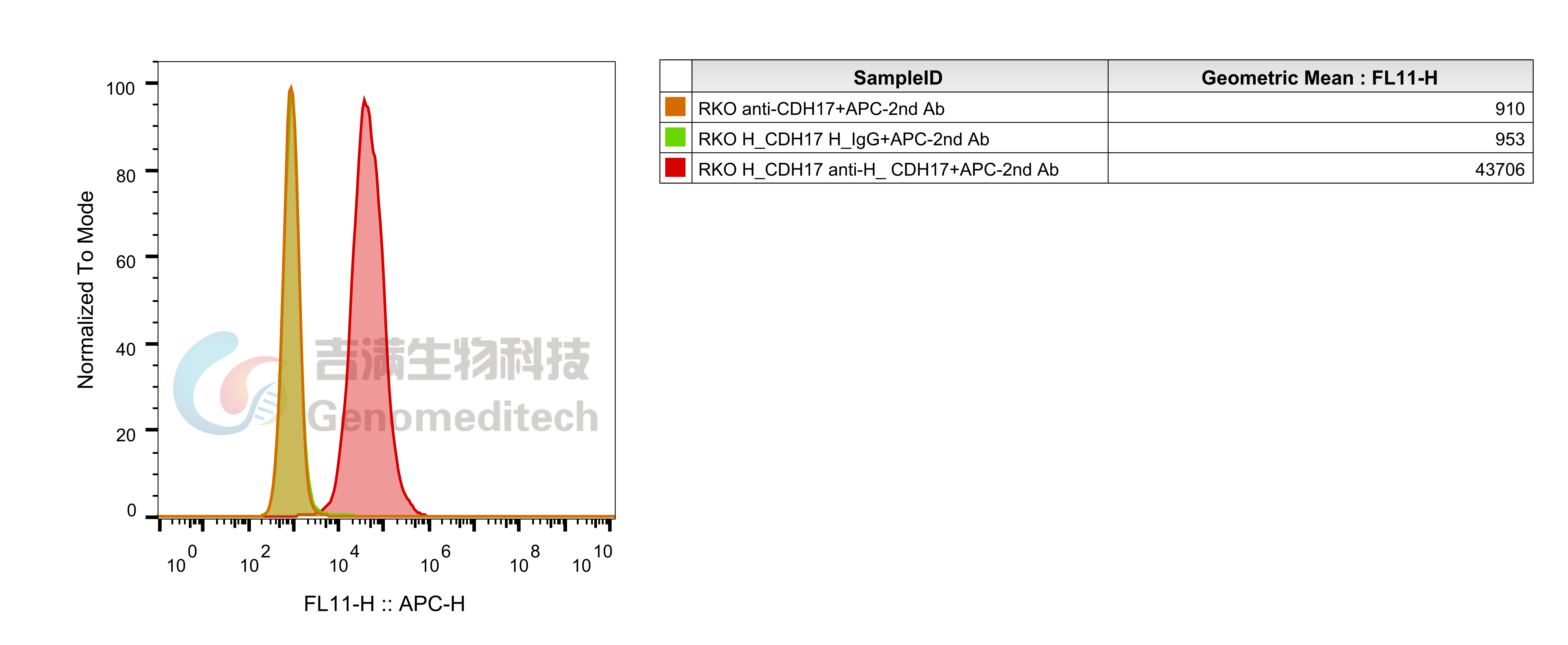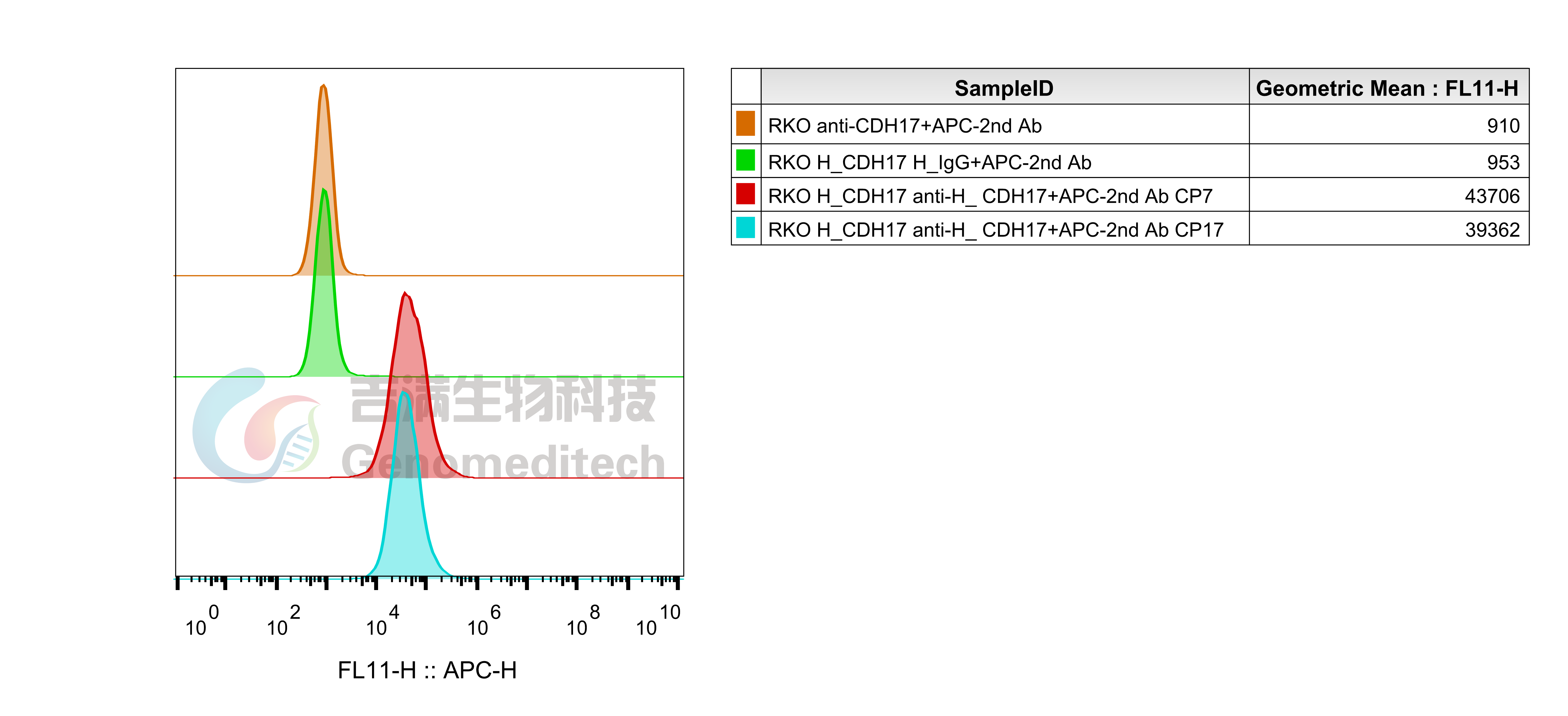 基于RKO细胞,使用慢病毒技术构建的稳定表达H_CDH17的单克隆细胞系。