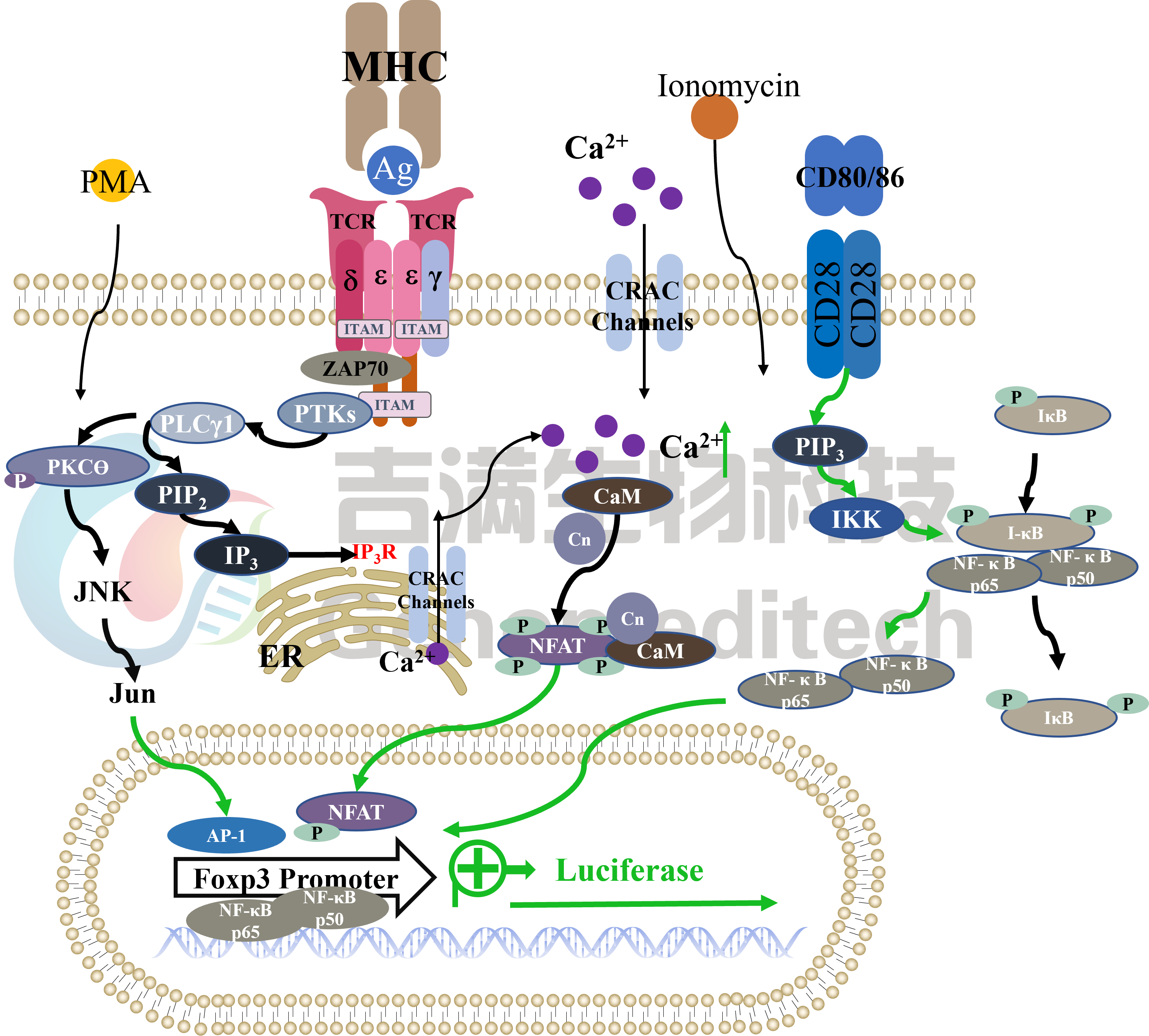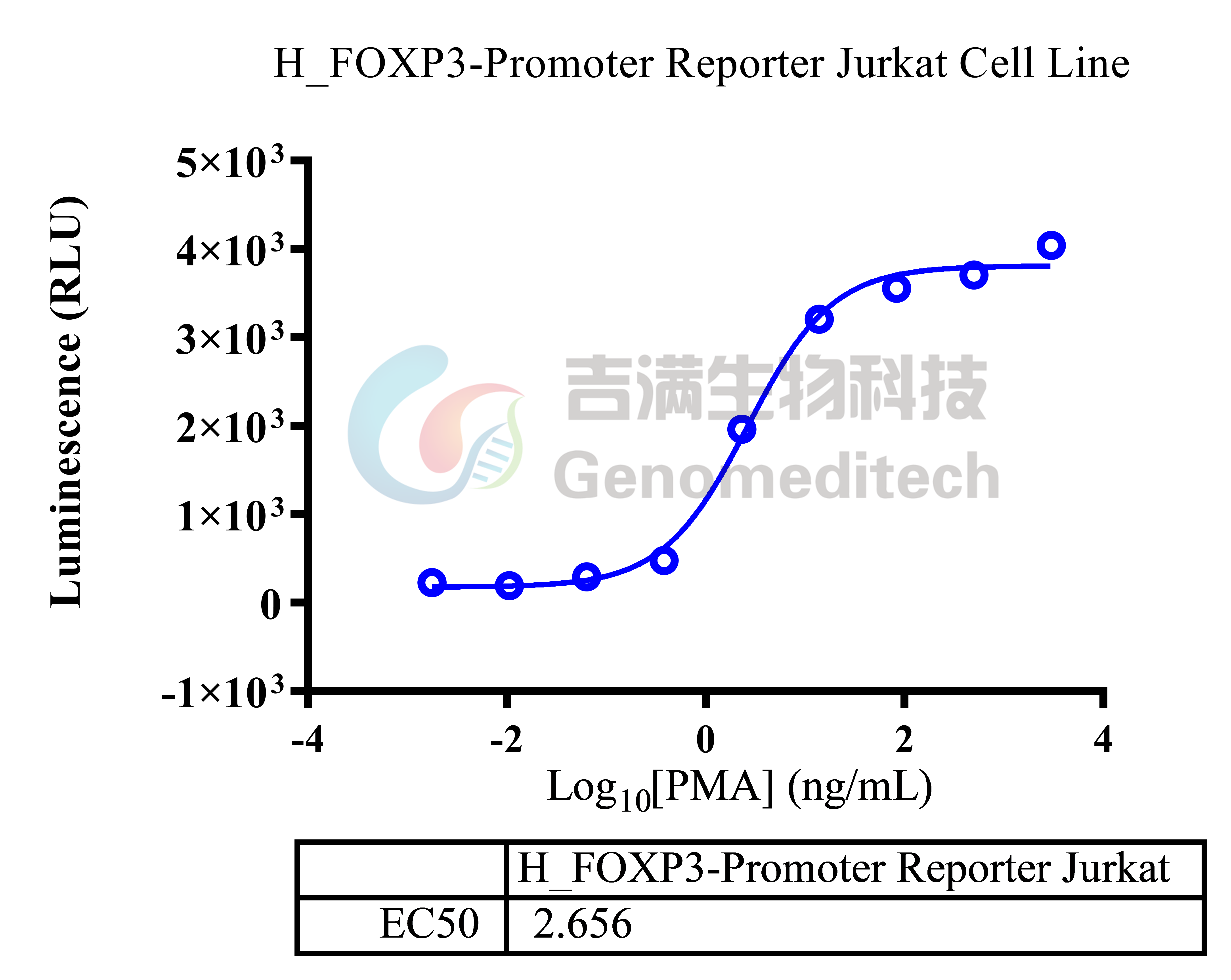 | 产品编号:GM-C13108 产品名称:H_FOXP3-Promoter Reporter Jurkat Cell Line FOXP3属于叉头家族,是一种主要的转录因子。 研究表明,在Jurkat细胞中过表达的FOXP3可以通过与NFAT竞争结合或作为IL-2启动子的转录抑制因子直接与NFAT或NF-κB相互作用。人类中,在所有活化的T细胞中均观察到FOXP3的表达上调。FOXP3是天然存在的Treg细胞的发育和功能所必需的,并参与控制免疫耐受的分子机制。 吉满生物H_FOXP3-Promoter Reporter Jurkat Cell Line,是将人类FOXP3启动子荧光素酶报告基因稳定的整合到Jurkat细胞的基因组中。当上游信号通路被激活后,由人类FOXP3启动子激活荧光素酶(Luciferase)的表达。Luciferase读值即代表信号通路的激活效果,因此可用于相关通路研究。 | ![]() |