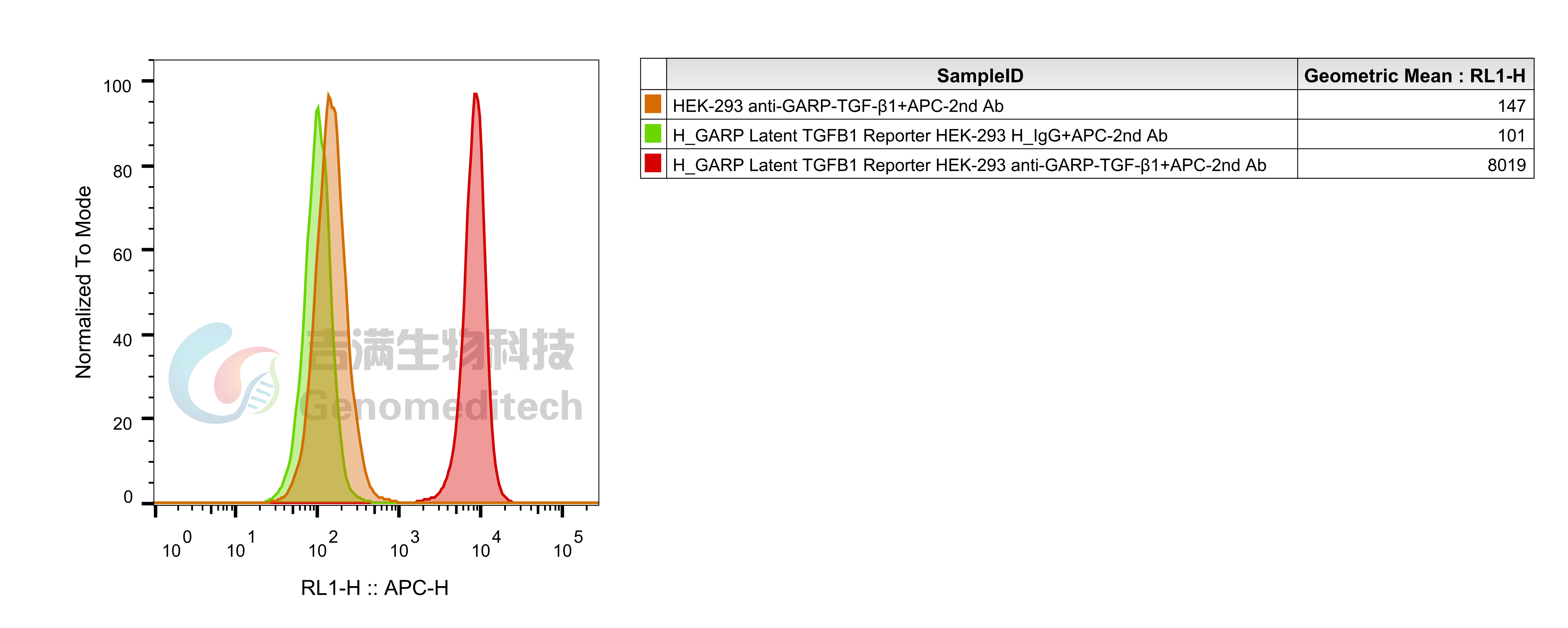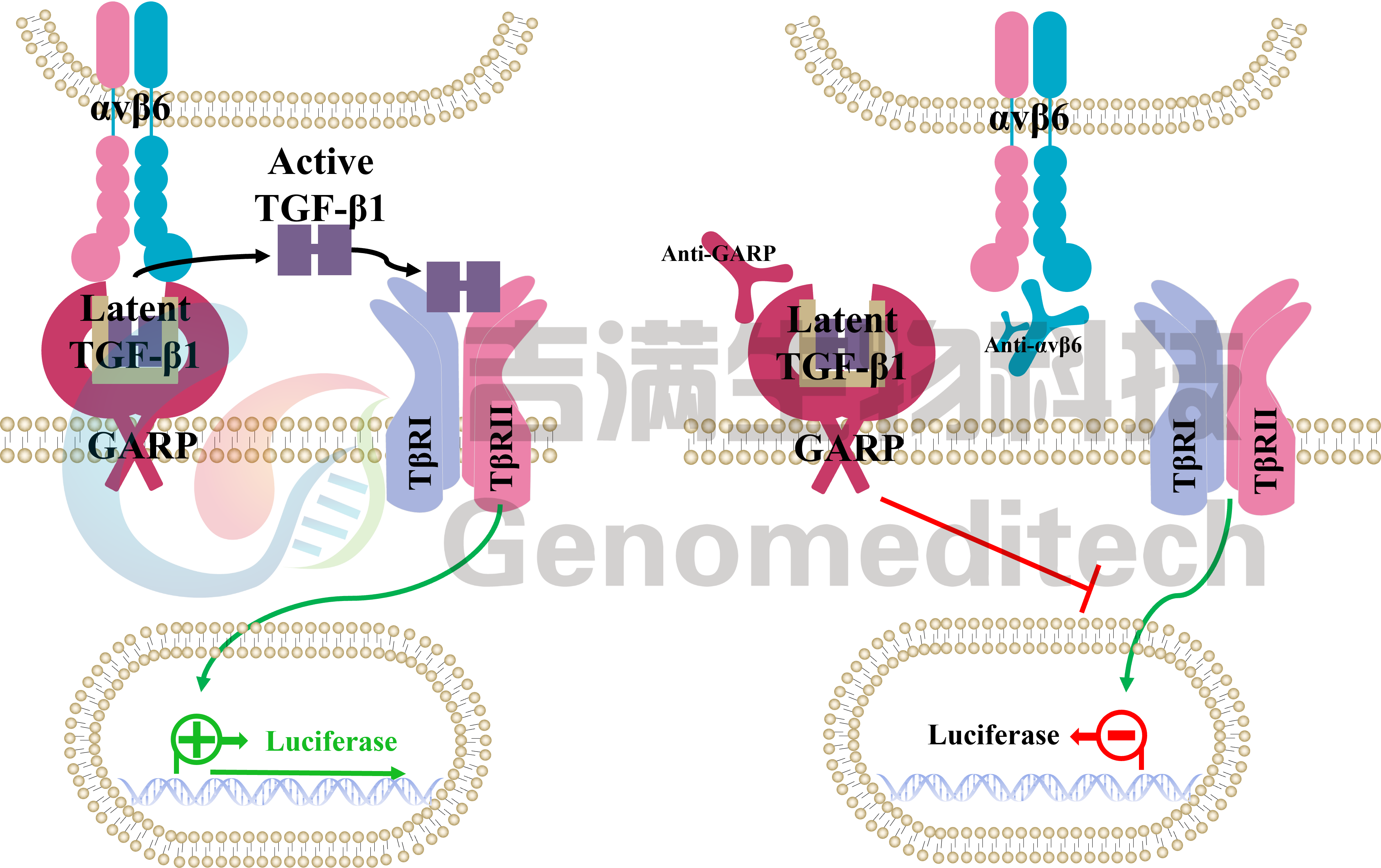 产品编号:GM-C13361 产品名称:H_GARP Latent TGFB1 Reporter HEK-293 Cell Line 调节性T淋巴细胞(Tregs)通过产生转化生长因子-β来发挥抑制免疫过度反应,预防自身免疫性疾病的作用。转化生长因子-β (TGF-β)编码的二聚体前蛋白(proTGF-β),可被furin酶切割出TGF-β前肽,也称为latency-associated peptide(LAP)。紧接着,可通过与潜在TGF-β结合蛋白(latent TGF-beta binding proteins (LTBPs))结合形成复合物。此外也可同Tregs表面高度表达的GARP(glycoprotein A repetitions predominant,又称为LRRC32)形成复合物,将无活性的TGF-β释放到细胞外基质(ECM)中或积累在细胞表面,后者的结合能力强于前者。 随后,通过整合素激活GARP-proTGFβ复合物,形成具有的活性的TGF-β。整合素αvβ6,是由α、β亚单位以非共价键组合组成的跨膜异二聚体,其通过其蛋白结构上的高亲和力结合位点RGD LXXL结合LAP,然后激活latent TGF-β。 吉满生物H_GARP Latent TGFB1 Reporter HEK-293 Cell Line报告基因细胞系,即稳定表达人GARP基因、Latent TGFβ和TGF-β诱导的荧光素酶报告基因的HEK-293细胞。当与H_αvβ6 HEK-293 Cell Line (Genomeditech/GM-C19431)细胞共培养时,TGF-β被αvβ6切割到培养基中,结合TβRI和TβRII受体,激活转录因子介导的荧光素酶基因(Luciferase)的表达。而加入GARP/αvβ6的阻断抗体后,阻断了TGF-β的活化及由其激活的下游信号通路。阻断抗体对信号通路的影响程度可以通过测定荧光信号评估。 | ![]() |
