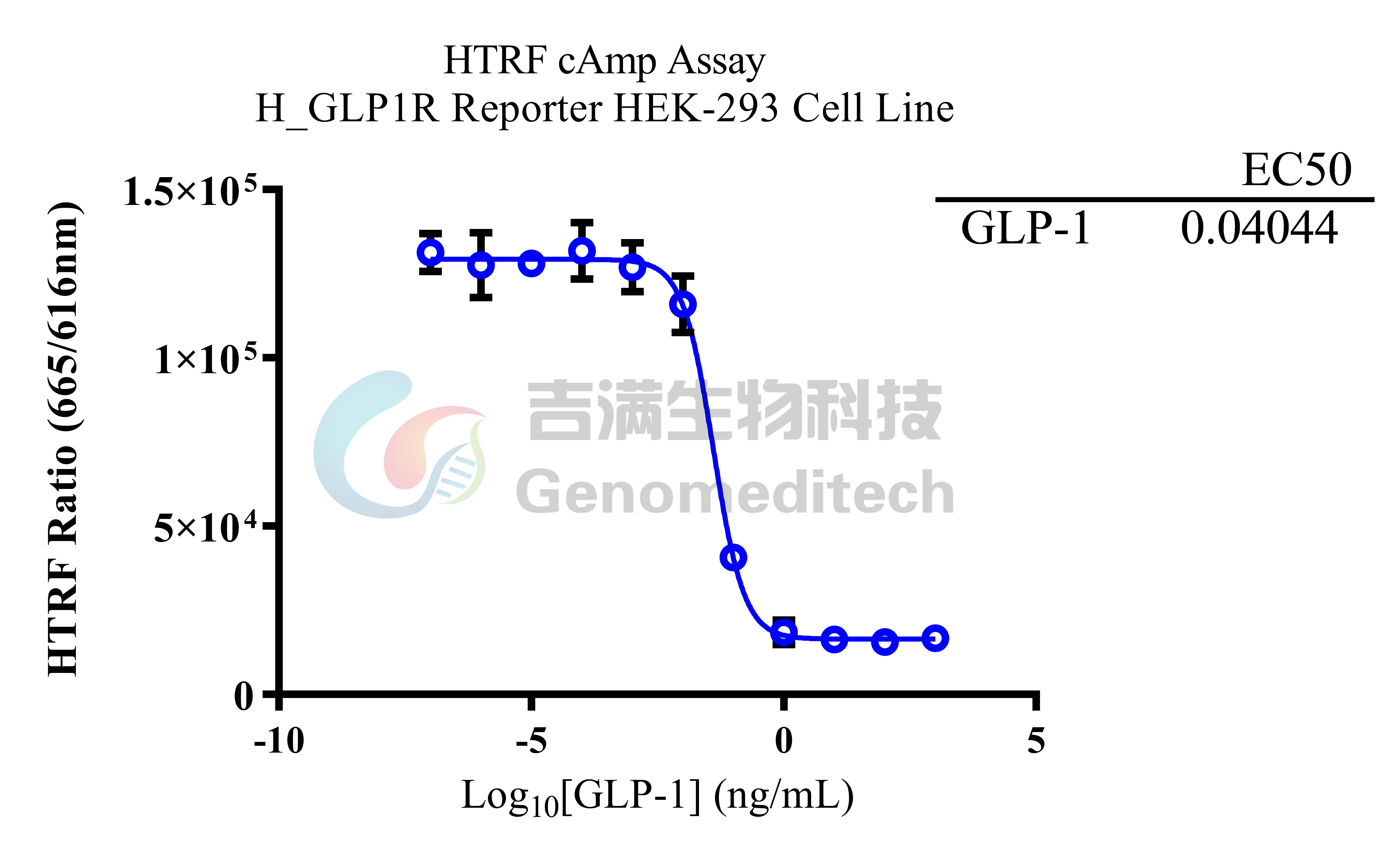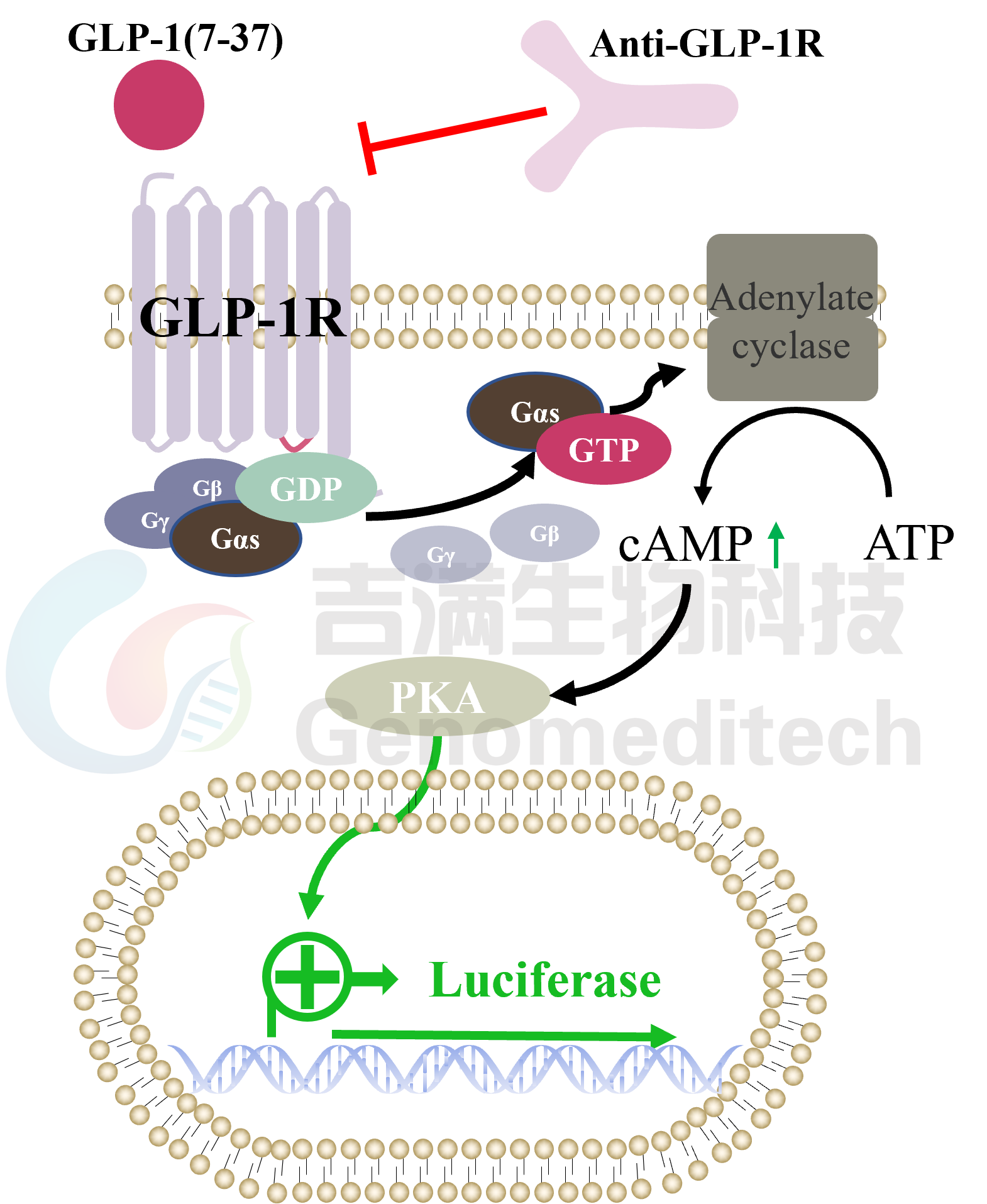 | 产品编号:GM-C25537 产品名称:H_GLP1R Reporter HEK-293 Cell Line 胰高血糖素样肽-1受体(GLP-1R)是在胰腺细胞和大脑神经元上发现的一种受体蛋白。 在人类中,它是由位于6号染色体上的GLP1R基因合成的。 它是G蛋白偶联受体中胰高血糖素受体家族的成员。 被激活的GLP-1R刺激腺苷酸环化酶通路,导致胰岛素合成和胰岛素释放增加。因此,GLP-1R一直是开发治疗糖尿病药物(通常称为GLP1R激动剂)的目标。GLP-1R也在大脑中表达,参与控制食欲。 GLP-1R是一种多效性偶联受体, N端识别特异性的配体,通过与多种G蛋白(Gαs、Gαi、Gαo和Gαq/11)偶联来调控细胞通路。当与GLP-1(7-37)结合后,G蛋白α亚基与β、γ亚基解离,Gαs蛋白偶联,激活腺苷环化酶(cAMP),促使cAMP在细胞内含量升高并增加蛋白激酶A(PKA)的含量,激活下游信号通路,引起胰岛素基因转录增加。 吉满生物H_GLP1R Reporter HEK-293 Cell Line报告基因细胞系,是基于cAMP-PKA信号通路构建的一种Luciferase报告基因细胞系。当GLP-1(7-37)与其受体结合时,亚基互相解离。Gαs蛋白偶联,激活腺苷环化酶,促使cAMP在细胞内含量升高并增加PKA的含量。激活下游信号通路,从而激活荧光素酶(Luciferase)的表达。Luciferase读值即代表信号通路的激活效果,因此可用于GLP1R相关药物的体外效果评价。 | ![]() |