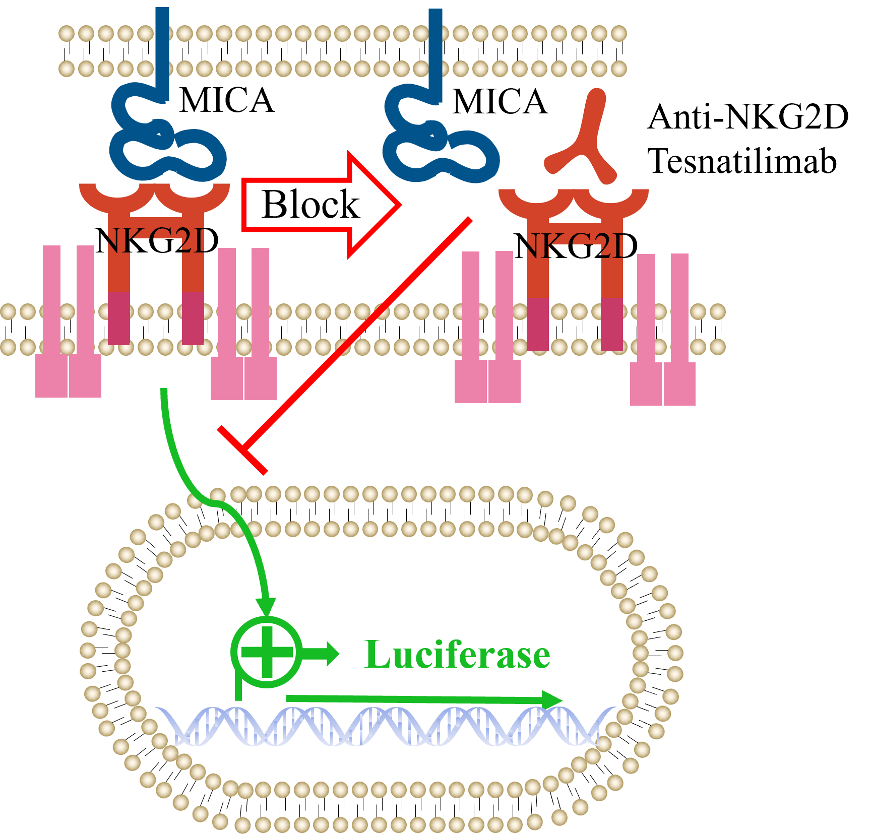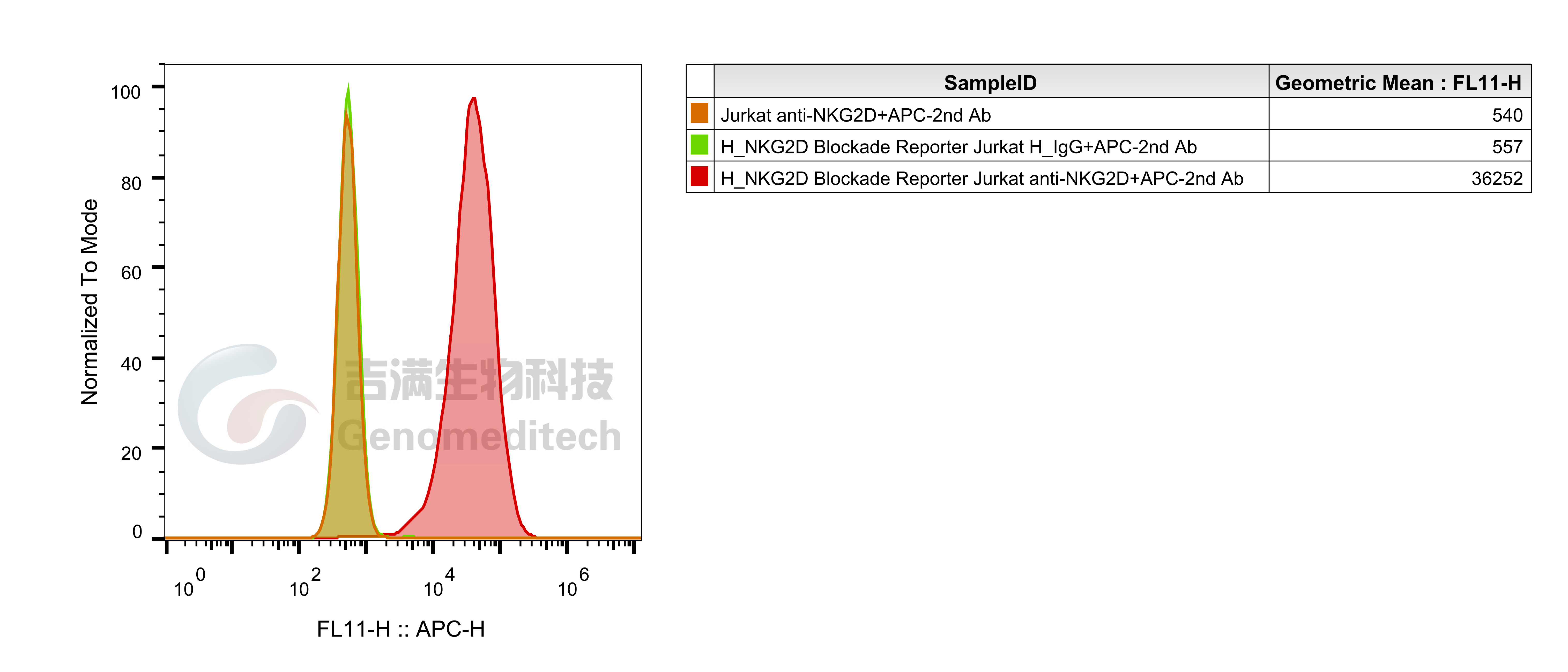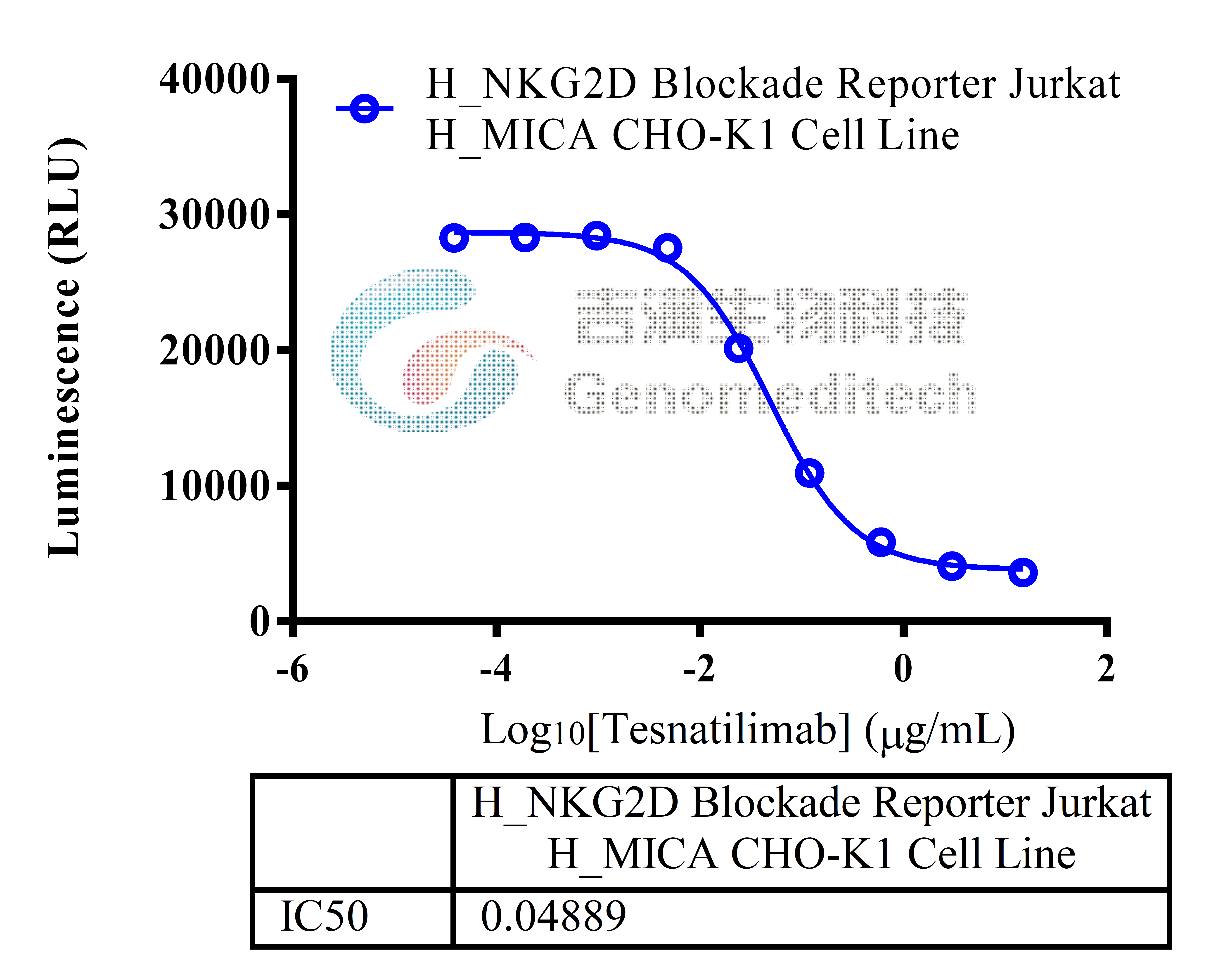| 产品编号:GM-C27755 产品名称:H_NKG2D Blockade Reporter Jurkat Cell Line NKG2D是一种活化受体(跨膜蛋白),属于C 型凝集素样受体NKG2家族。NKG2D 由KLRK1 (杀伤细胞凝集素样受体 K1)基因编码,该基因位于小鼠 6 号染色体和人类 12 号染色体上的 NK 基因复合体 (NKC) 中。 在NK细胞中,主要有两种受体控制细胞激活和抑制的平衡:一种识别MHC I(HLA-A,B,C),另一种识别非MHC I。识别MHC I的为NKG2A和NKG2C,识别非MHCI的主要为NKGD和NCR。NKG2D是二型膜蛋白,以二聚体形式表达在细胞膜上,有两种转录本,长转录本NGK2DL和短转录本NKG2DS。NKG2D的配体主要有MCA/MICB,ULBP1-6,当配体与NKG2D结合后,DAP10蛋白上YXXM序列可以招募GRB2,PI3K,进而激活PLCγ,激活NK细胞。NKG2D也在CD8+ T细胞和γδT细胞上表达,但其仅作为共刺激信号, 需要与T 细胞上的其他受体配合。 吉满生物H_NKG2D Blockade Reporter Jurkat Cell Line是一种Luciferase报告基因细胞系。当MICA结合NKG2D后,激活下游信号通路,从而激活荧光素酶(Luciferase)的表达,使用阻断型的抗体可以阻断这一信号的传导。Luciferase读值即代表信号通路的激活效果,因此可用于NKG2D相关药物的体外效果评价。 | ![]() |