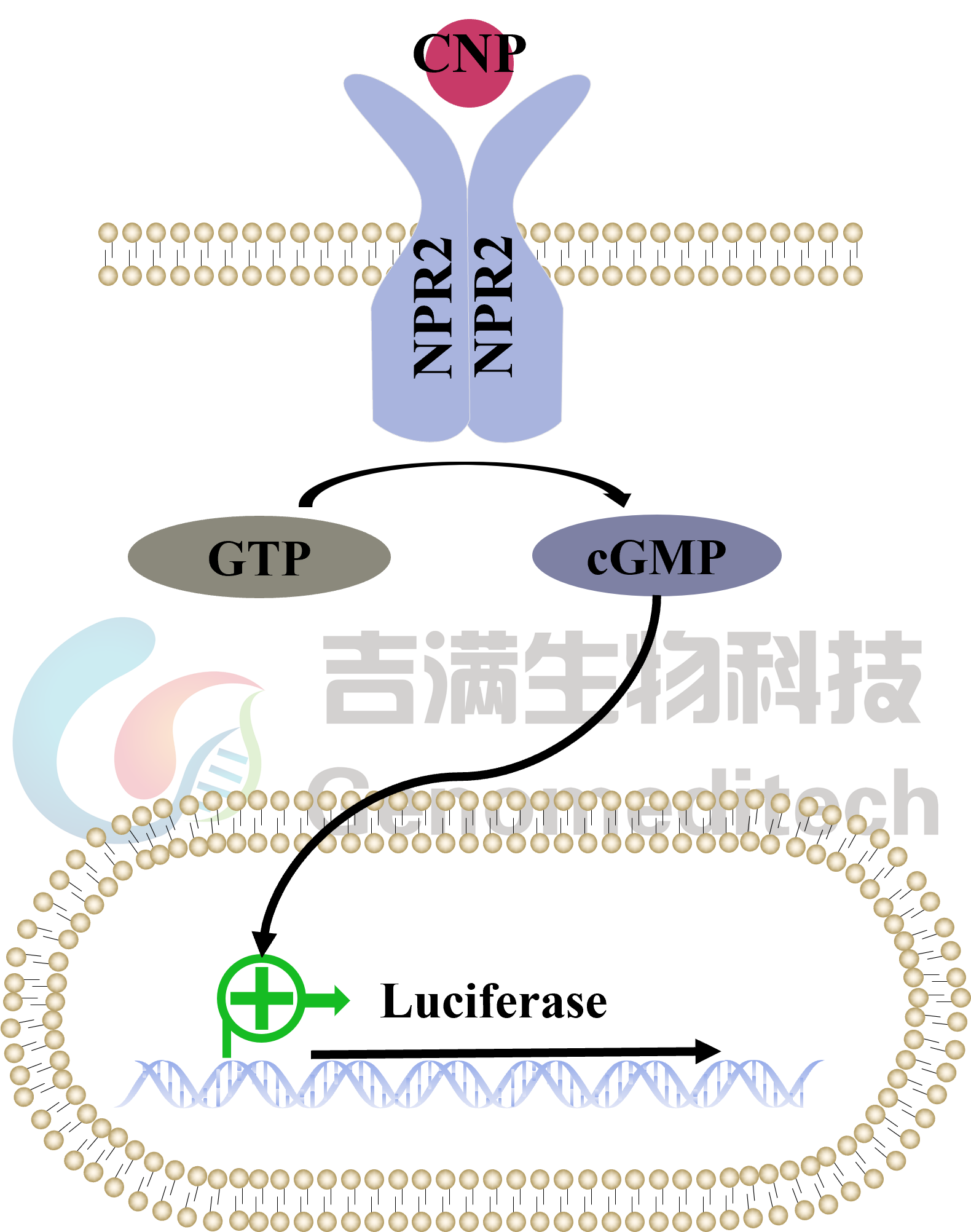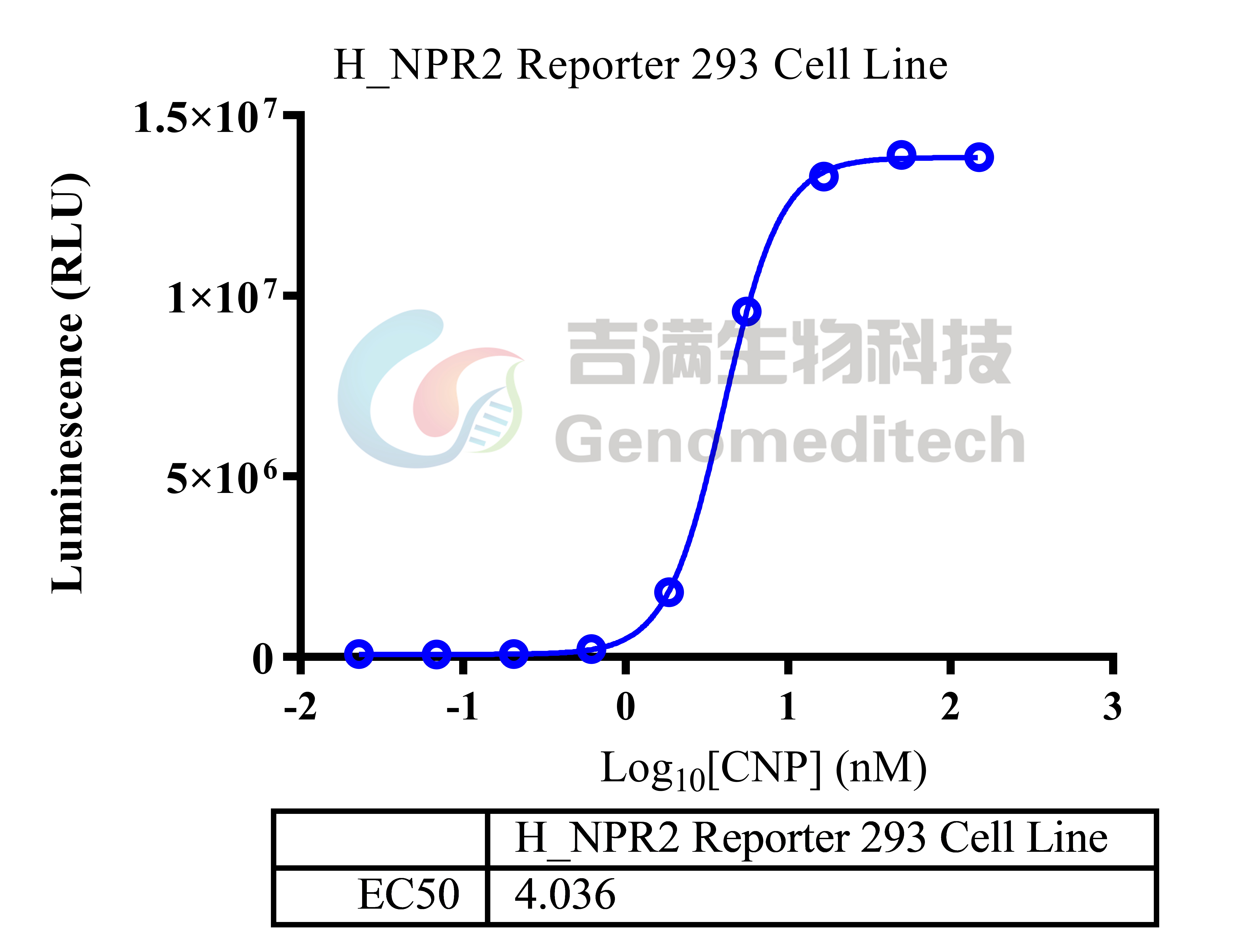 | 产品编号:GM-C41611 产品名称:H_NPR2 Reporter 293 Cell Line NPR2蛋白(Natriuretic Peptide Receptor B,又称Guanylate Cyclase B,GC-B)是一种跨膜受体蛋白,由NPR2基因编码,属于Ⅰ型受体鸟苷酸环化酶(guanylyl cyclase)家族。该蛋白主要介导C型利钠肽(C-type natriuretic peptide, CNP)的信号转导作用。NPR2位于细胞膜上,结构包含细胞外配体结合结构域、单次跨膜区域及胞内鸟苷酸环化酶催化结构域。当CNP与其结合时,NPR2能够催化GTP生成环鸟苷酸(cGMP),并通过cGMP依赖性信号通路调控骨骼发育、血管舒张、细胞增殖与分化等多种生理过程。特别是在软骨细胞增殖与骨骼纵向生长中,NPR2/CNP信号轴起关键作用;其功能异常与软骨发育不全、骨骼畸形及部分类型的侏儒症密切相关。 吉满生物H_NPR2 Reporter 293 Cell Line细胞系是基于转录因子信号通路构建的Luciferase报告基因细胞系。当配体与受体结合,激活下游信号通路,从而激活荧光素酶(Luciferase)的表达,Luciferase读值即代表信号通路的激活效果。因此可用于相关药物的体外评价效果。 | ![]() |