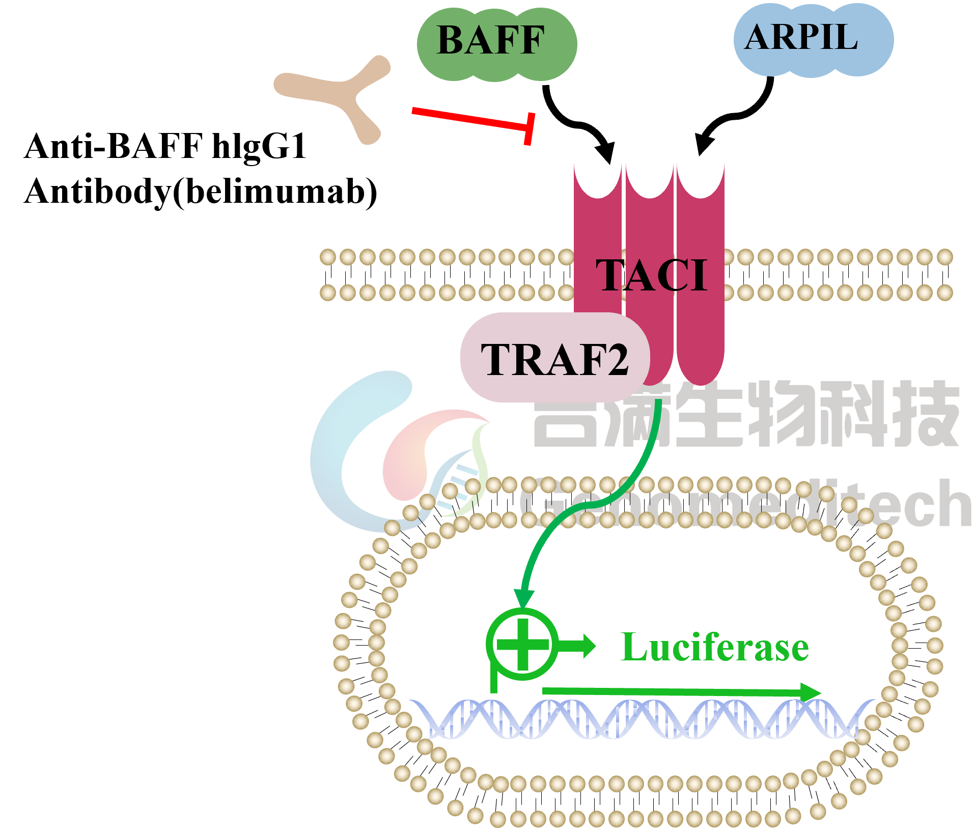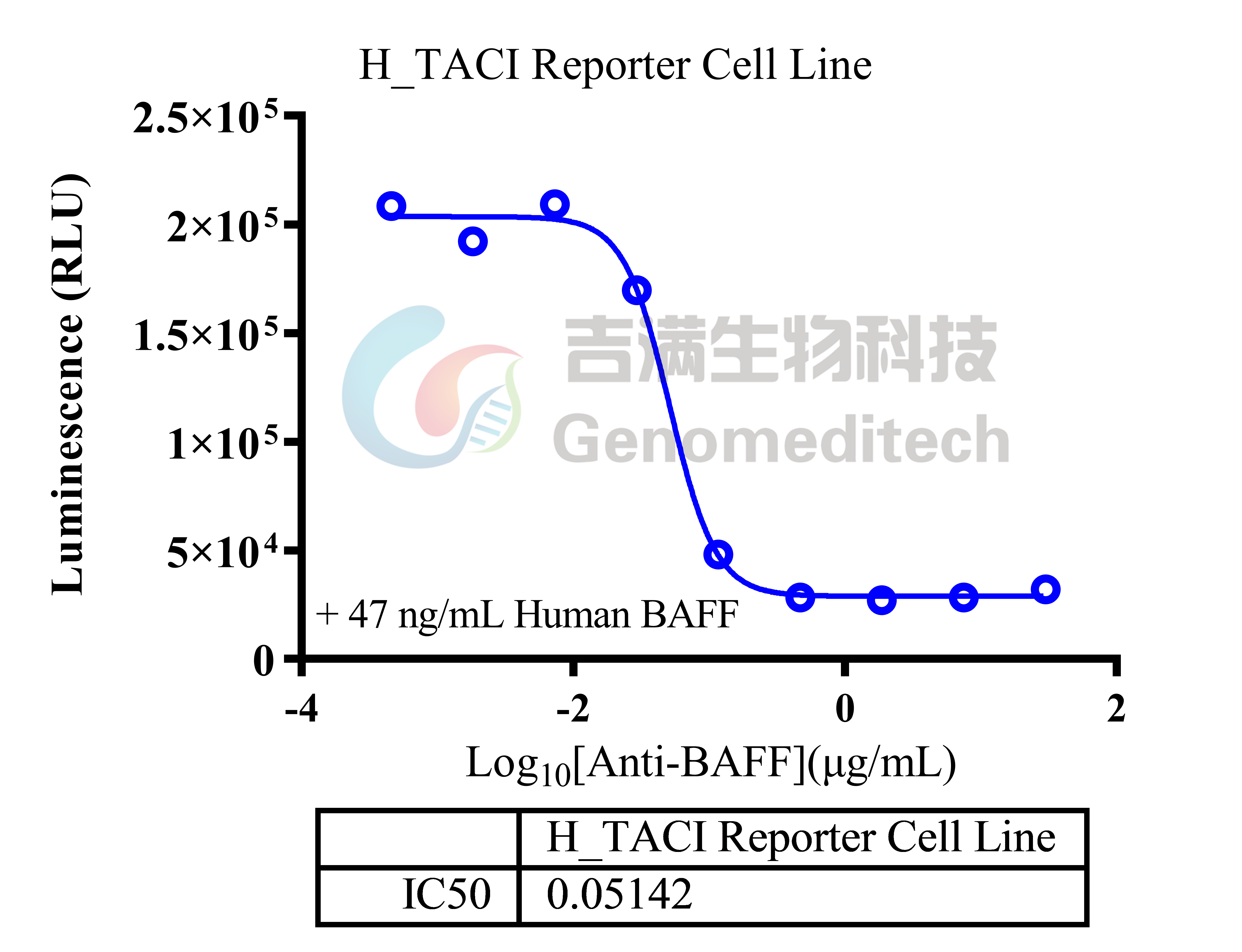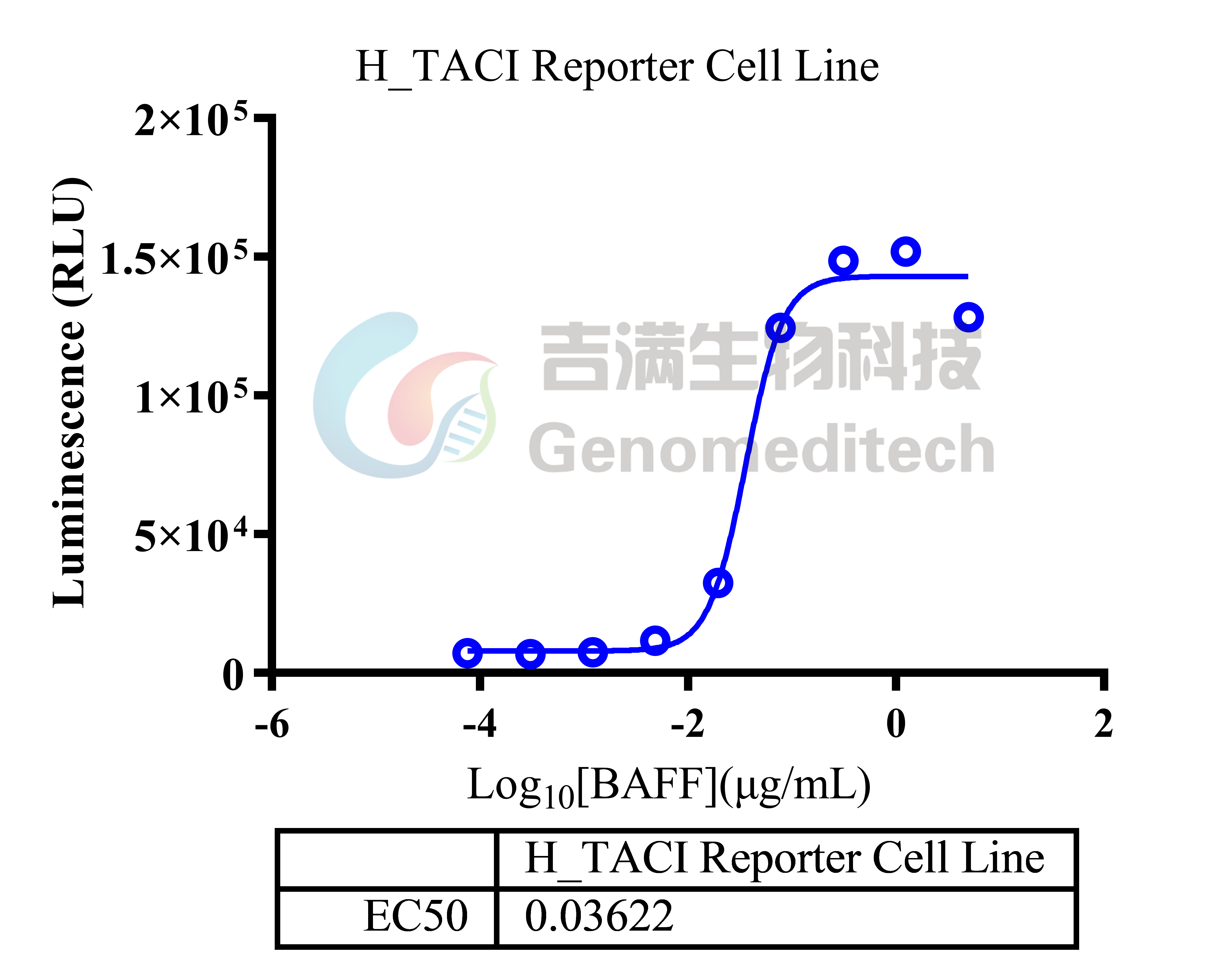 产品编号:GM-C35041 产品名称:H_TACI Reporter Cell Line TACI(Transmembrane Activator and CAML Interactor)是由TNFRSF13B基因编码的一种受体,属于肿瘤坏死因子受体超家族(TNF receptor superfamily)。主要存在于B细胞和浆细胞上,并在免疫系统的调控中发挥重要作用。 TACI胞外包含两个半胱氨酸富集结构域(CRD),这两个结构域负责与其主要配体BAFF(B-cell Activating Factor)和APRIL(A Proliferation-Inducing Ligand)结合,使得TACI能够特异性识别和结合配体,从而启动信号传导。TACI信号传导在B细胞的存活、成熟和抗体生成中起关键作用。 吉满生物H_TACI Reporter Cell Line是一种Luciferase报告基因细胞系。当BAFF、APRIL结合TACI受体后,激活下游信号通路,从而激活荧光素酶(Luciferase)的表达,使用阻断型的抗体可以阻断这一信号的传导。Luciferase读值即代表信号通路的激活效果,因此可用于TACI相关药物的体外效果评价。 | ![]() |