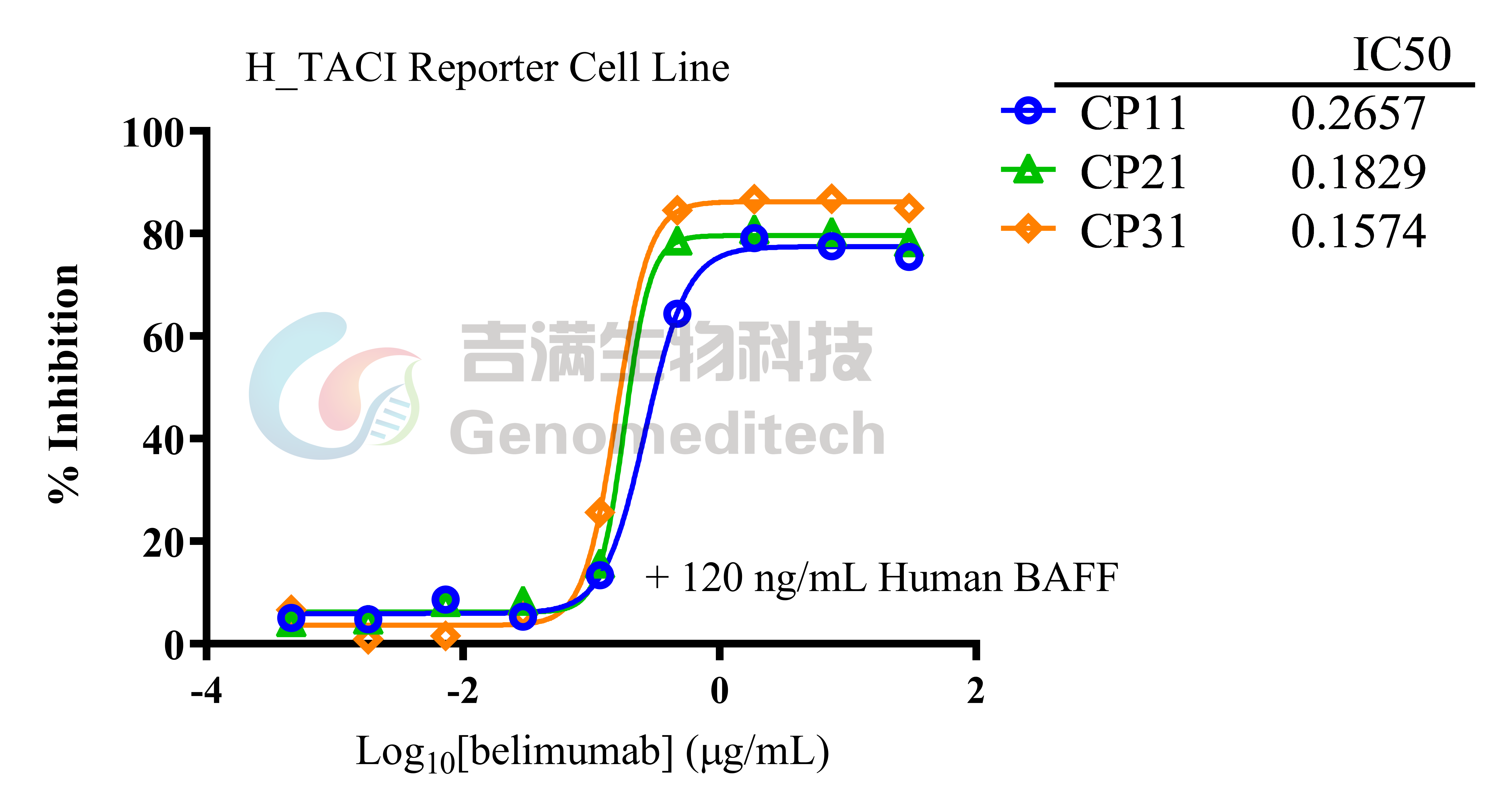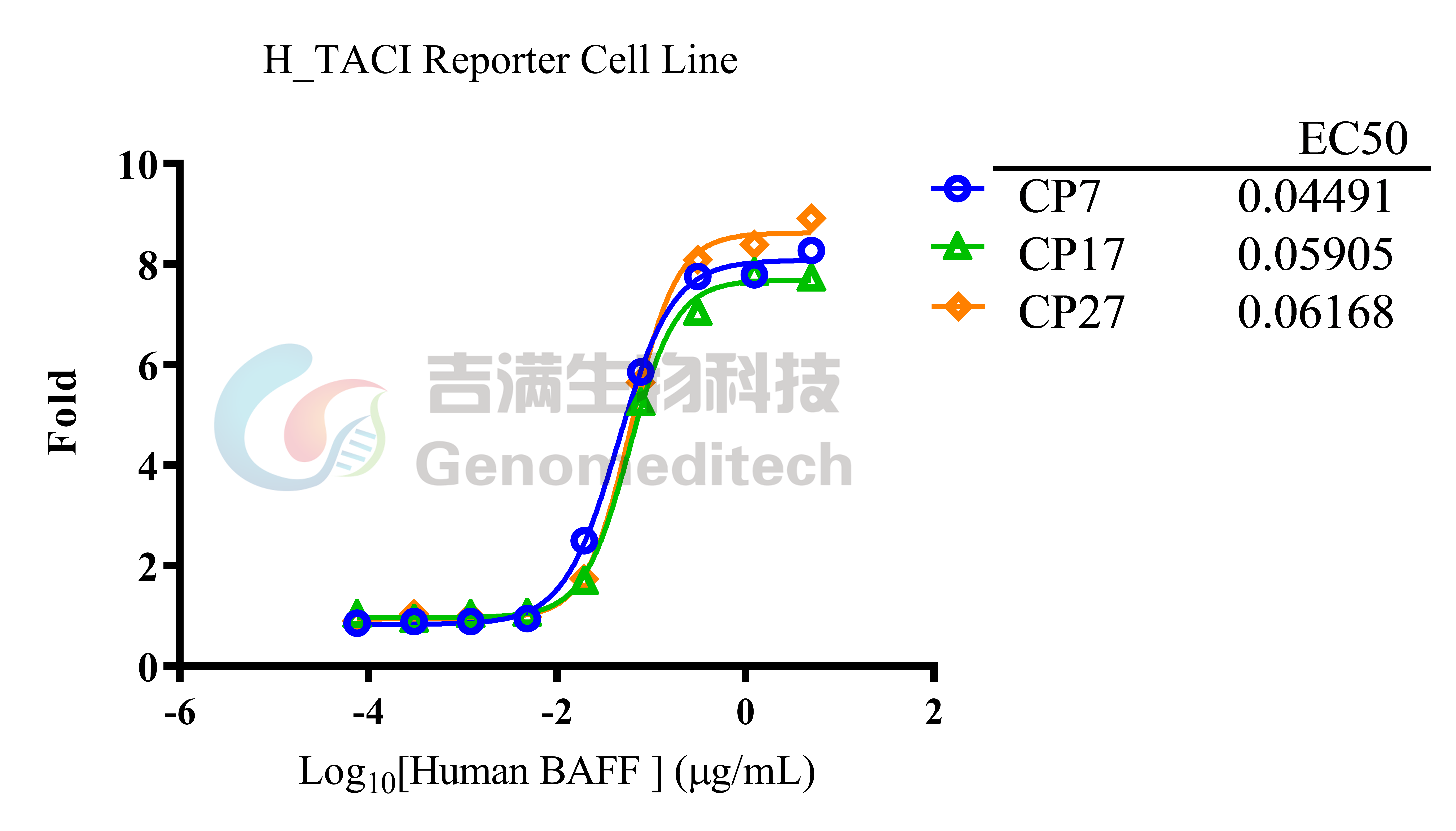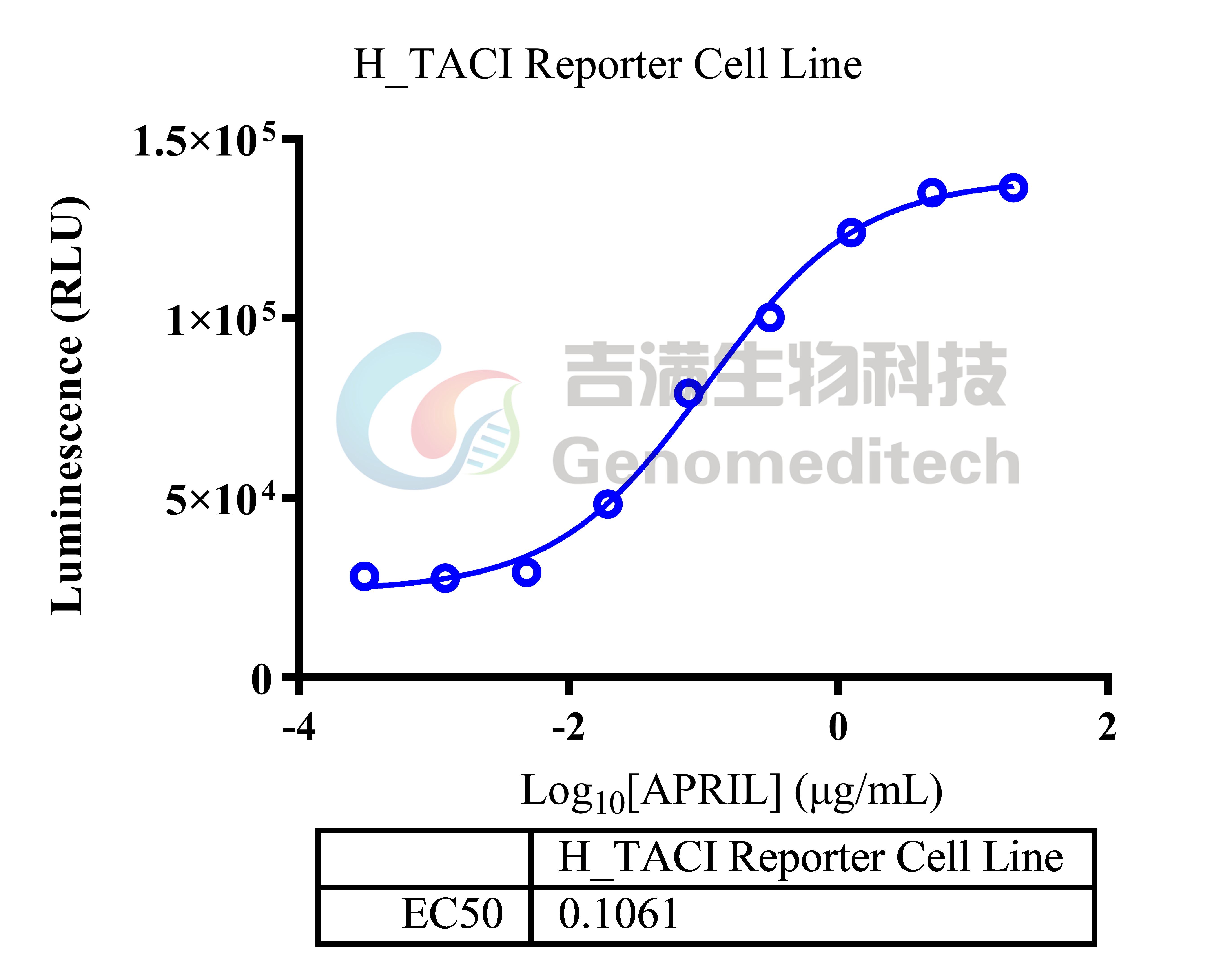 产品编号:GM-C35041 产品名称:H_TACI Reporter Cell Line TACI(Transmembrane Activator and CAML Interactor)是由TNFRSF13B基因编码的一种受体,属于肿瘤坏死因子受体超家族(TNF receptor superfamily)。主要存在于B细胞和浆细胞上,并在免疫系统的调控中发挥重要作用。 TACI胞外包含两个半胱氨酸富集结构域(CRD),这两个结构域负责与其主要配体BAFF(B-cell Activating Factor)和APRIL(A Proliferation-Inducing Ligand)结合,使得TACI能够特异性识别和结合配体,从而启动信号传导。TACI信号传导在B细胞的存活、成熟和抗体生成中起关键作用。 吉满生物H_TACI Reporter Cell Line是一种Luciferase报告基因细胞系。当BAFF、APRIL结合TACI受体后,激活下游信号通路,从而激活荧光素酶(Luciferase)的表达,使用阻断型的抗体可以阻断这一信号的传导。Luciferase读值即代表信号通路的激活效果,因此可用于TACI相关药物的体外效果评价。 | ![]() |