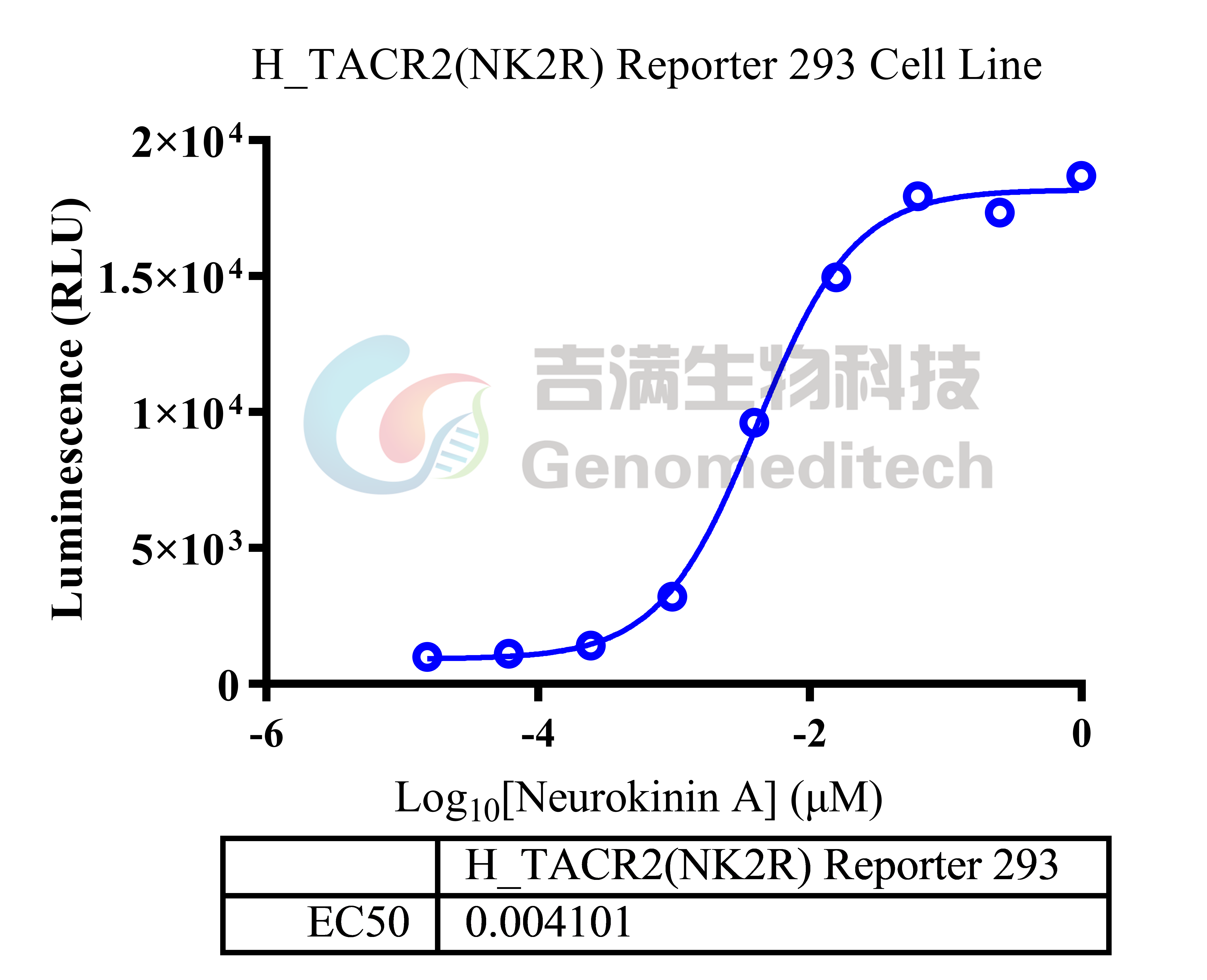 | 产品编号:GM-C39222 产品名称:H_TACR2(NK2R) Reporter 293 Cell Line TACR2(又称NK2R)是神经激肽受体家族的重要成员,属于G蛋白偶联受体(GPCR)超家族,主要分布于中枢神经系统、呼吸道、胃肠道及免疫细胞等组织。其特异性内源性配体为神经激肽A(Neurokinin A、NKA),与神经激肽B(NKB)、P物质(Substance P)共同构成速激肽家族,通过激活Gq/11蛋白介导下游信号通路,引发钙离子释放、细胞增殖及炎症因子释放等生理效应。TACR2在多种病理过程中发挥关键作用,包括哮喘、慢性阻塞性肺病(COPD)等呼吸系统疾病的平滑肌收缩与炎症反应,肠易激综合征的肠道高敏感性,以及偏头痛、焦虑相关的神经调节异常。 吉满生物的H_TACR2(NK2R) Reporter 293 Cell Line是一种Luciferase报告基因细胞系,当Neurokinin A结合TACR2(NK2R)时,TACR2(NK2R)与胞内G蛋白偶联,导致Ca2+释放,从而激活荧光素酶报告基因,Luciferase报告基因读值即代表信号通路的激活效果,因此可用于靶向TACR2(NK2R) 相关药物的活性检测。 | ![]() |