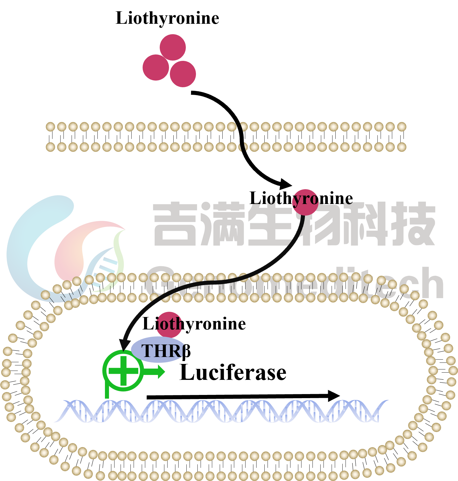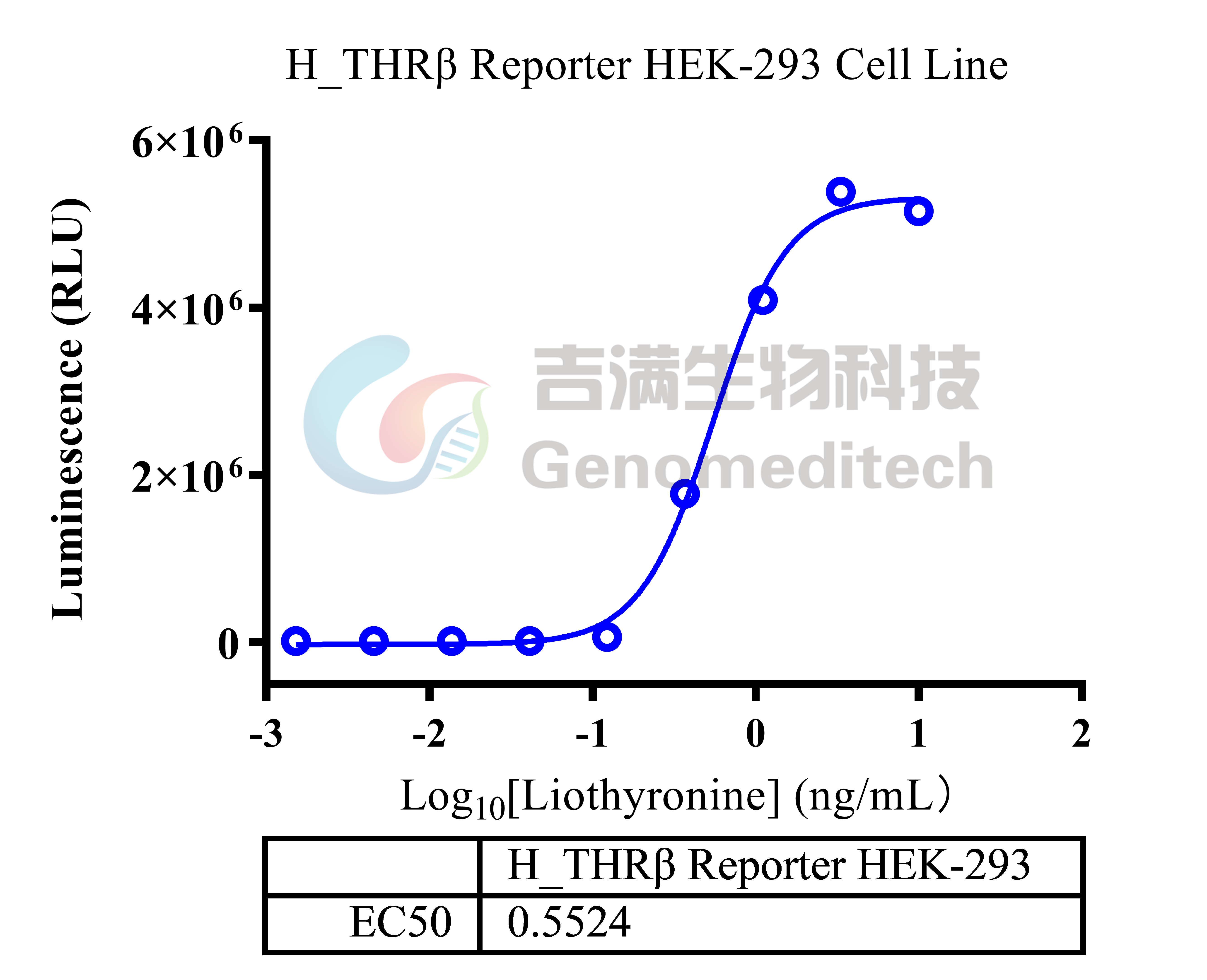 | 产品编号:GM-C30364 产品名称:H_THRβ Reporter HEK-293 Cell Line THRβ(Thyroid Hormone Receptor Beta,甲状腺激素受体β)是一种配体依赖性的核受体转录因子,属于核激素受体超家族成员。THRB基因在人类中位于染色体3p24.2,其产物主要作为甲状腺激素T3(三碘甲腺原氨酸)的受体。THRB蛋白通过与T3结合,调控下游靶基因的转录,从而影响多种生理过程,包括代谢调控、发育、心血管功能以及神经系统的成熟。THRB可以与视黄酸X受体(RXR)形成异源二聚体,结合到特定的DNA反应元件上,实现激素信号的精确调控。 THRβ具有多个剪接变体,主要包括TRβ1和TRβ2,两者在组织分布和功能上有所不同:TRβ1主要存在于肝脏、肾脏和心脏等外周组织,TRβ2则主要分布于下丘脑、垂体和视网膜。THRB基因突变与甲状腺激素抵抗综合征、代谢异常及多种肿瘤的发生相关,被视为潜在的代谢与癌症治疗靶点。 吉满生物H_THRβ Reporter HEK-293 Cell Line报告基因细胞系,是基于THRβ信号构建的一种Luciferase报告基因细胞系。当Liothyronine与受体结合,进而激活荧光素酶(Luciferase)的表达。Luciferase读值即代表信号通路的激活效果,因此可用于相关药物的体外效果评价。 | ![]() |