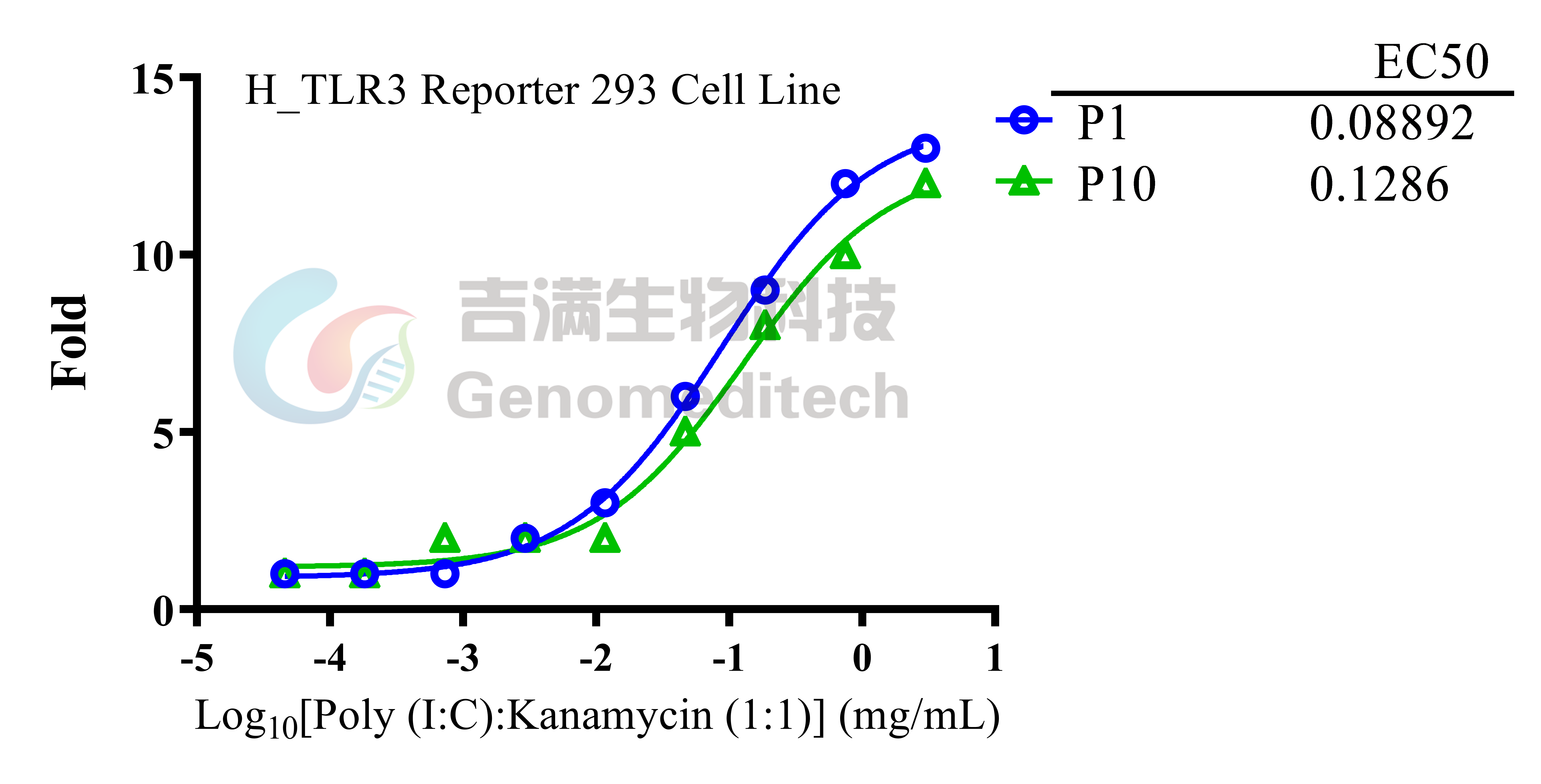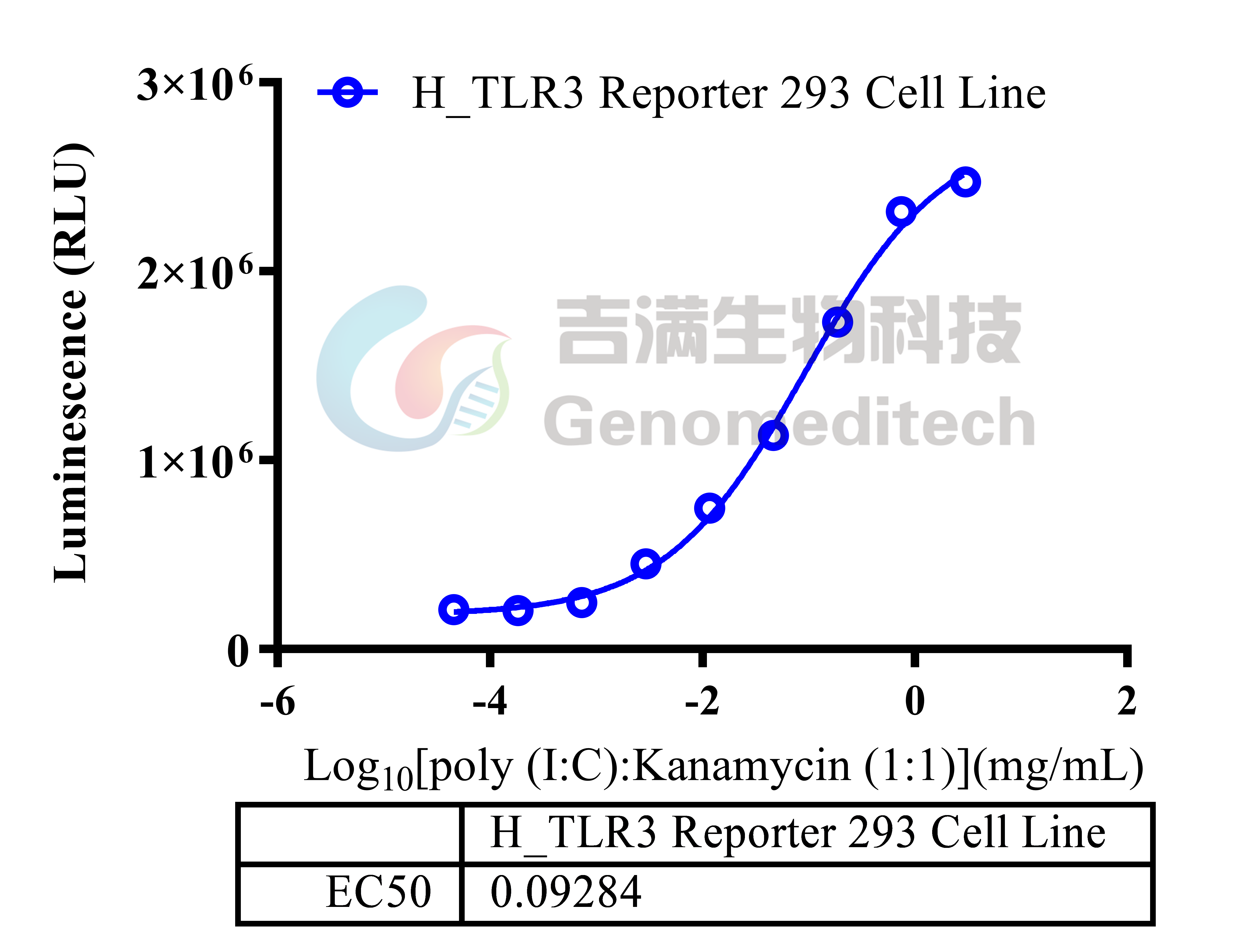 | 产品编号:GM-C27577 产品名称:H_TLR3 Reporter 293 Cell Line Toll样受体(Toll-like receptors, TLR)是参与非特异性免疫(天然免疫)的一类重要蛋白质分子,也是连接非特异性免疫和特异性免疫的桥梁。TLR3是一种模式识别受体,主要在内质网-溶酶体中表达,通过结合dsRNA来检测病毒感染。除病毒感染产生的dsRNA外,组织破坏过程中释放的内源性dsRNA也可激活TLR3。人工设计合成的dsRNA也可用来激活TLR3,包括Poly(I:C)、 Poly(A:U)及其变体。激活后,TLR3 从内质网移动到高尔基体和溶酶体,在那里它与信号通路中的主要蛋白 TRIF 相互作用,并激活下游信号。 吉满生物H_TLR3 Reporter 293 Cell Line报告基因细胞系,是基于TLR3信号通路构建的一种Luciferase报告基因细胞系。该细胞稳定表达TLR3基因及Luciferase报告基因,可用于作用于TLR3的dsRNA的体外激活效果评价。 | ![]() |