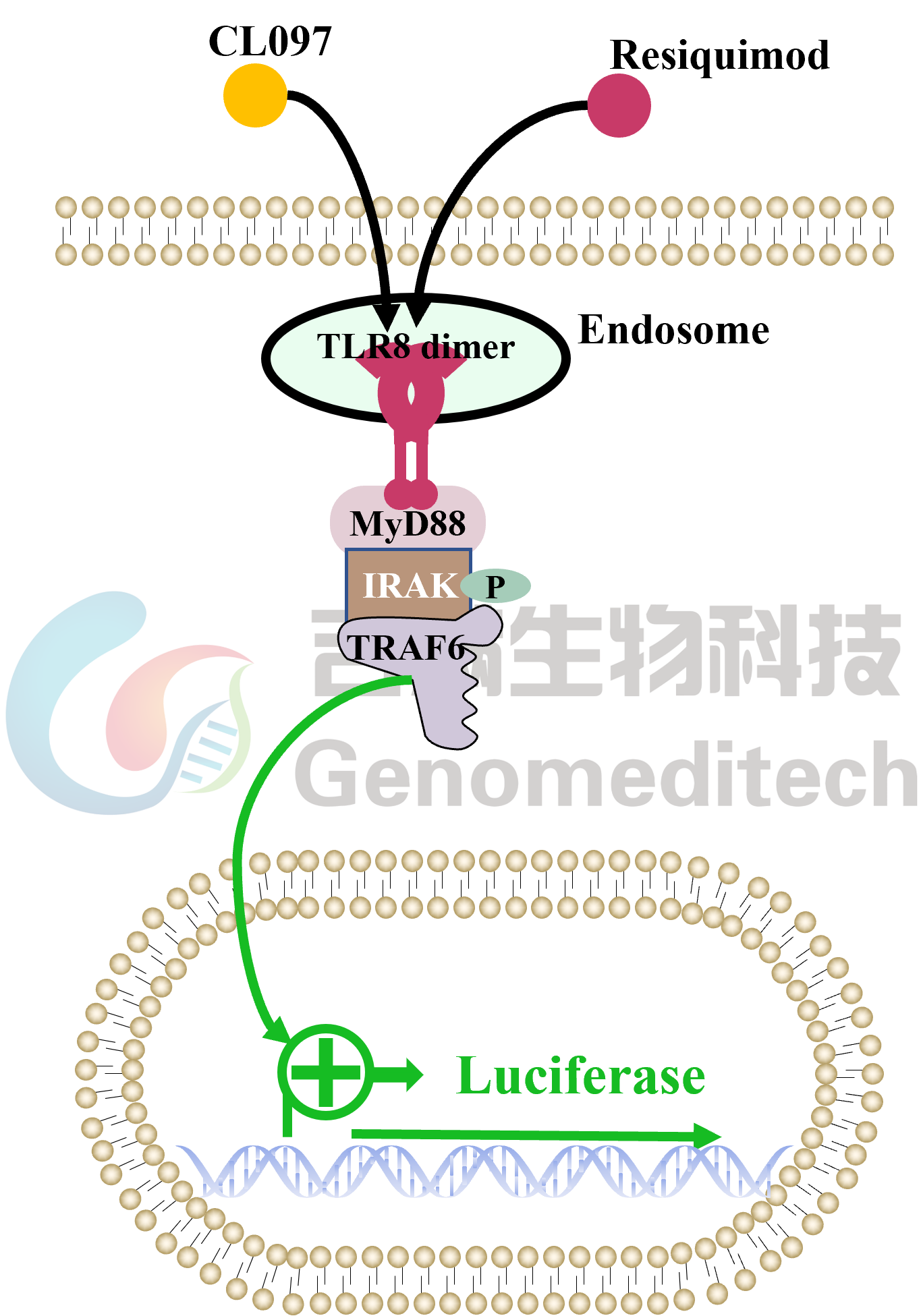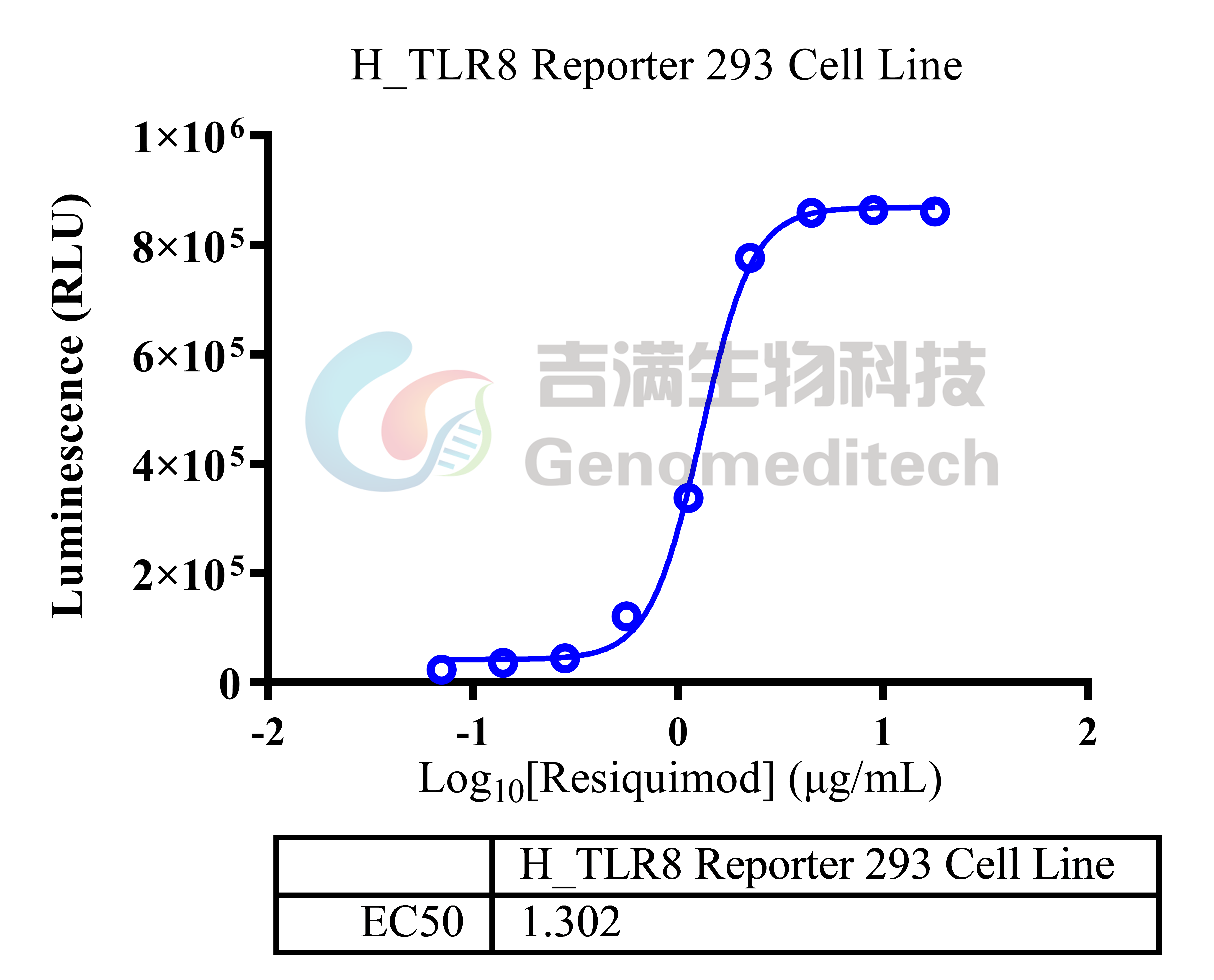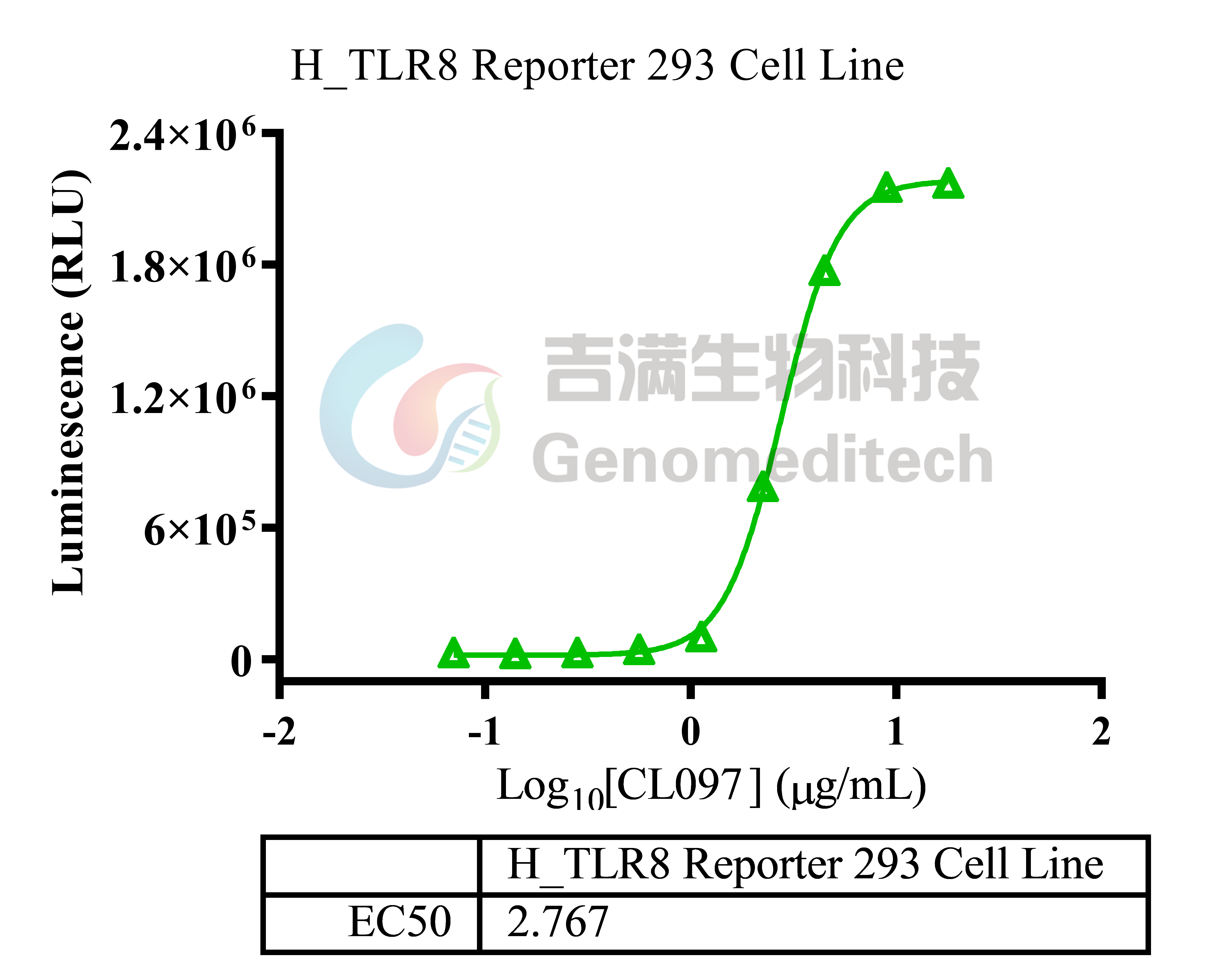| 产品编号:GM-C15427 产品名称:H_TLR8 Reporter 293 Cell Line Toll样受体(Toll-like receptors, TLR)是参与非特异性免疫(天然免疫)的一类重要蛋白质分子,也是连接非特异性免疫和特异性免疫的桥梁。激活TLR,可以诱导MyD88或TRIF依赖的信号通路,激活信号,诱导细胞因子和趋化因子分泌,激活先天免疫反应和介导获得性免疫反应的激活,因此将TLR激动剂应用到肿瘤免疫治疗中,有望将冷肿瘤变热,解决单免疫检查点抑制剂应答率低的问题,提高免疫治疗效果。 吉满生物H_TLR8 Reporter 293 Cell Line报告基因细胞系,是基于TLR8信号通路构建的一种Luciferase报告基因细胞系。该细胞稳定表达TLR8基因及Luciferase报告基因,可用于针对TLR8激动剂的体外激活效果评价。 | ![]() |