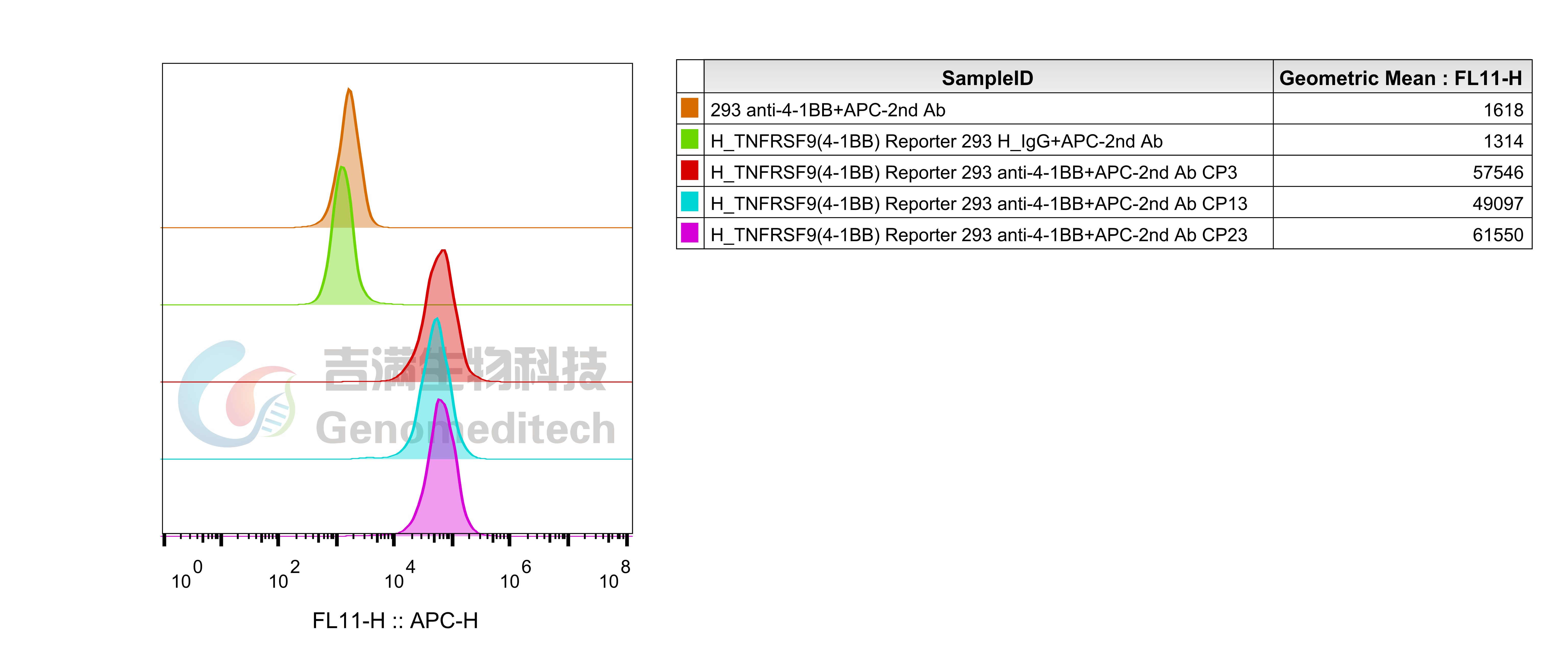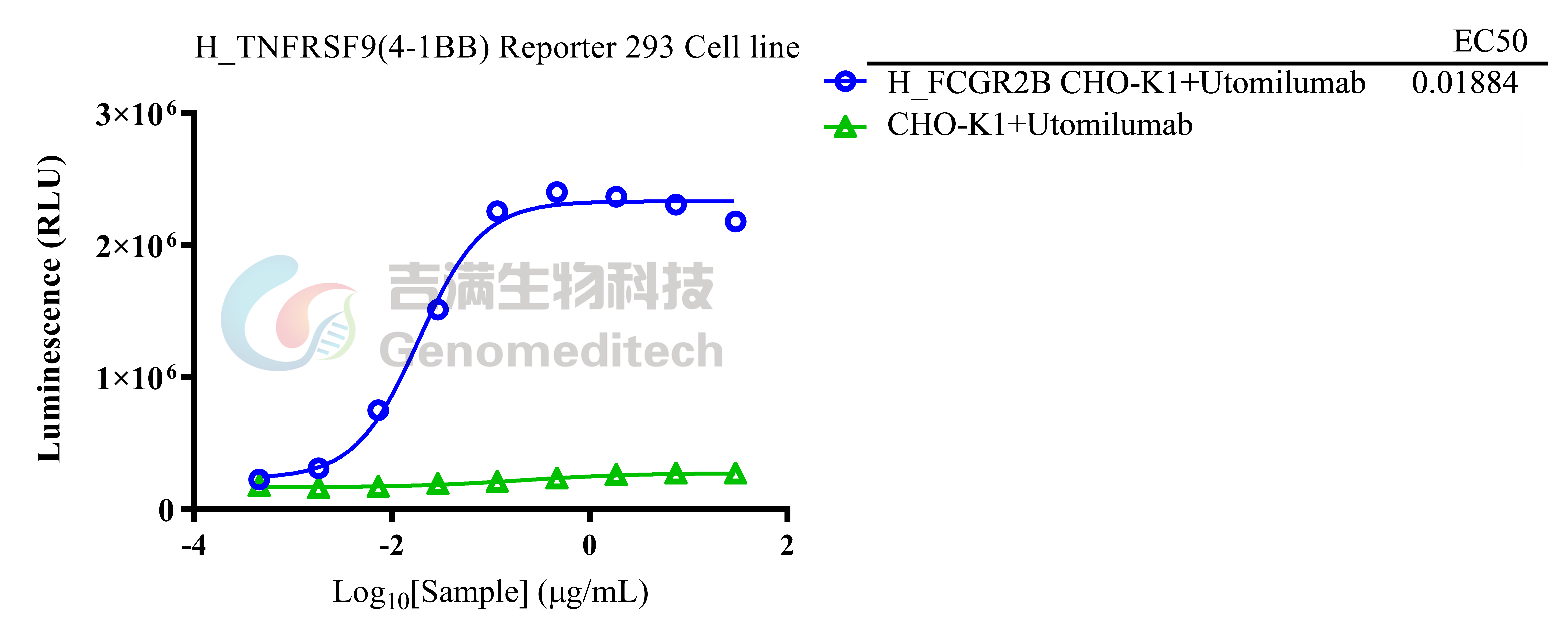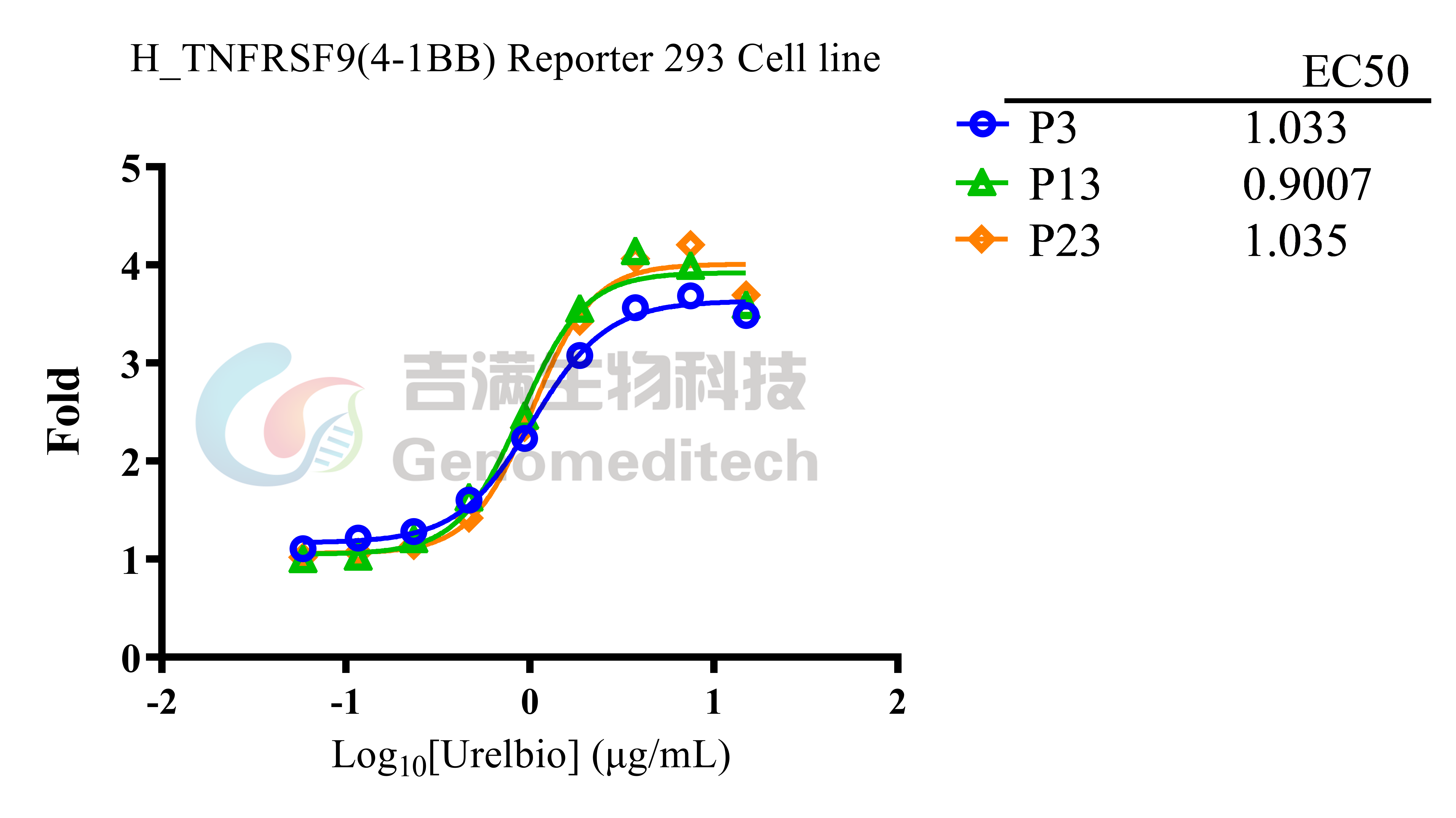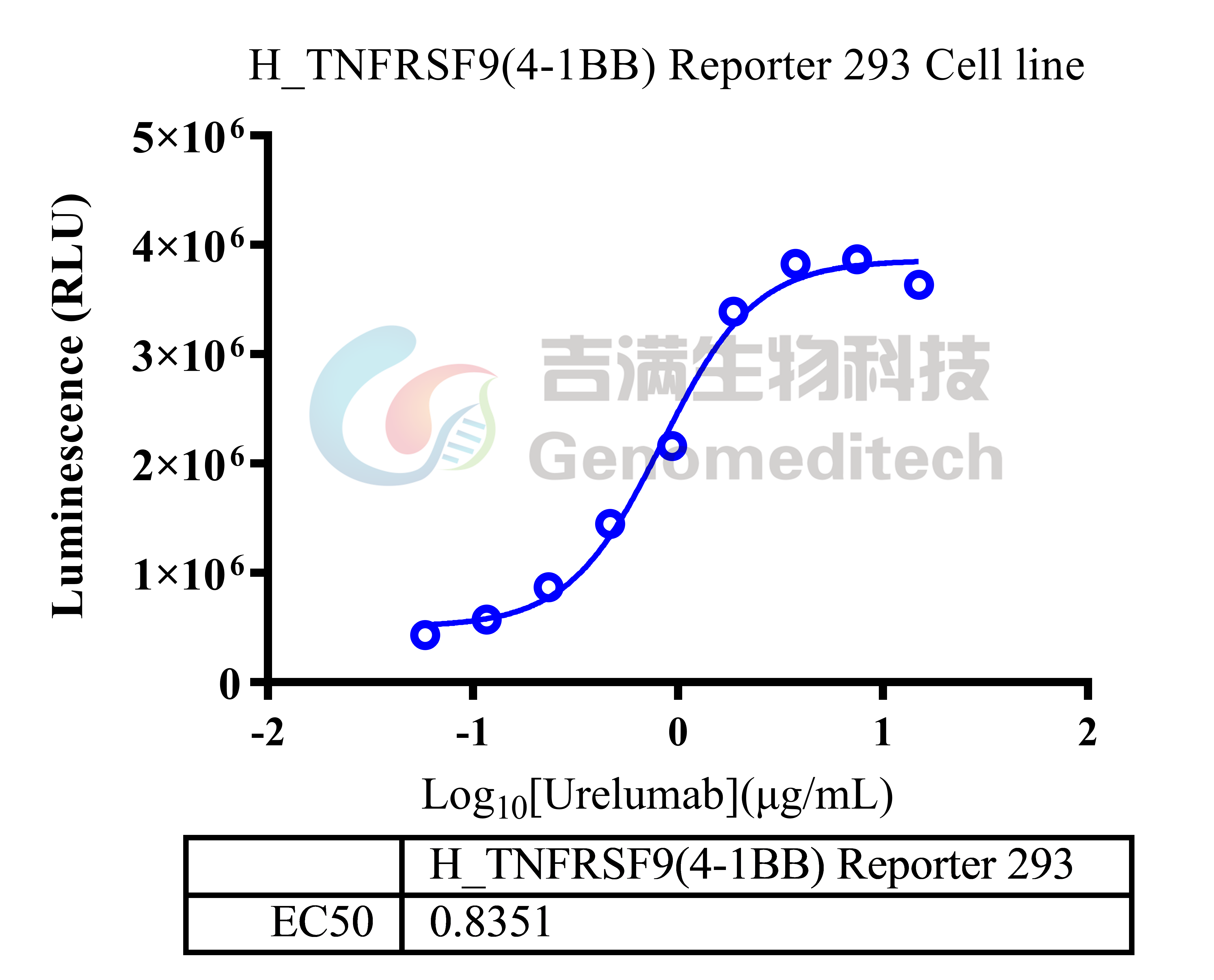 产品编号:GM-C04832 产品名称:H_TNFRSF9(4-1BB) Reporter 293 Cell line 4-1BB又称为CD137 或 TNFRSF9,是一种可诱导的共刺激受体,属于肿瘤坏死因子受体超家族的成员,在T细胞,自然杀伤(NK)细胞和先天免疫细胞中均有表达。4-1BB与4-1BB配体(4-1BBL)的相互作用,能够促进细胞增殖、存活和细胞因子产生。目前针对4-1BB的药物研发主要是用于治疗炎症或自身免疫病,以及用于癌症治疗。靶向4-1BB的激动型抗体在治疗炎症或自身免疫病方面进展喜人,靶向4-1BB和免疫检查点或共刺激靶点的联合疗法将发挥更强的抗肿瘤作用。 吉满生物H_TNFRSF9(4-1BB) Reporter 293报告基因细胞系,是基于4-1BBL/4-1BB构建的一种Luciferase报告基因细胞系。该细胞稳定表达4-1BB基因及Luciferase报告基因,可用于靶向4-1BB的单抗或双抗等治疗性抗体的体外激活效果评价。 | ![]() |