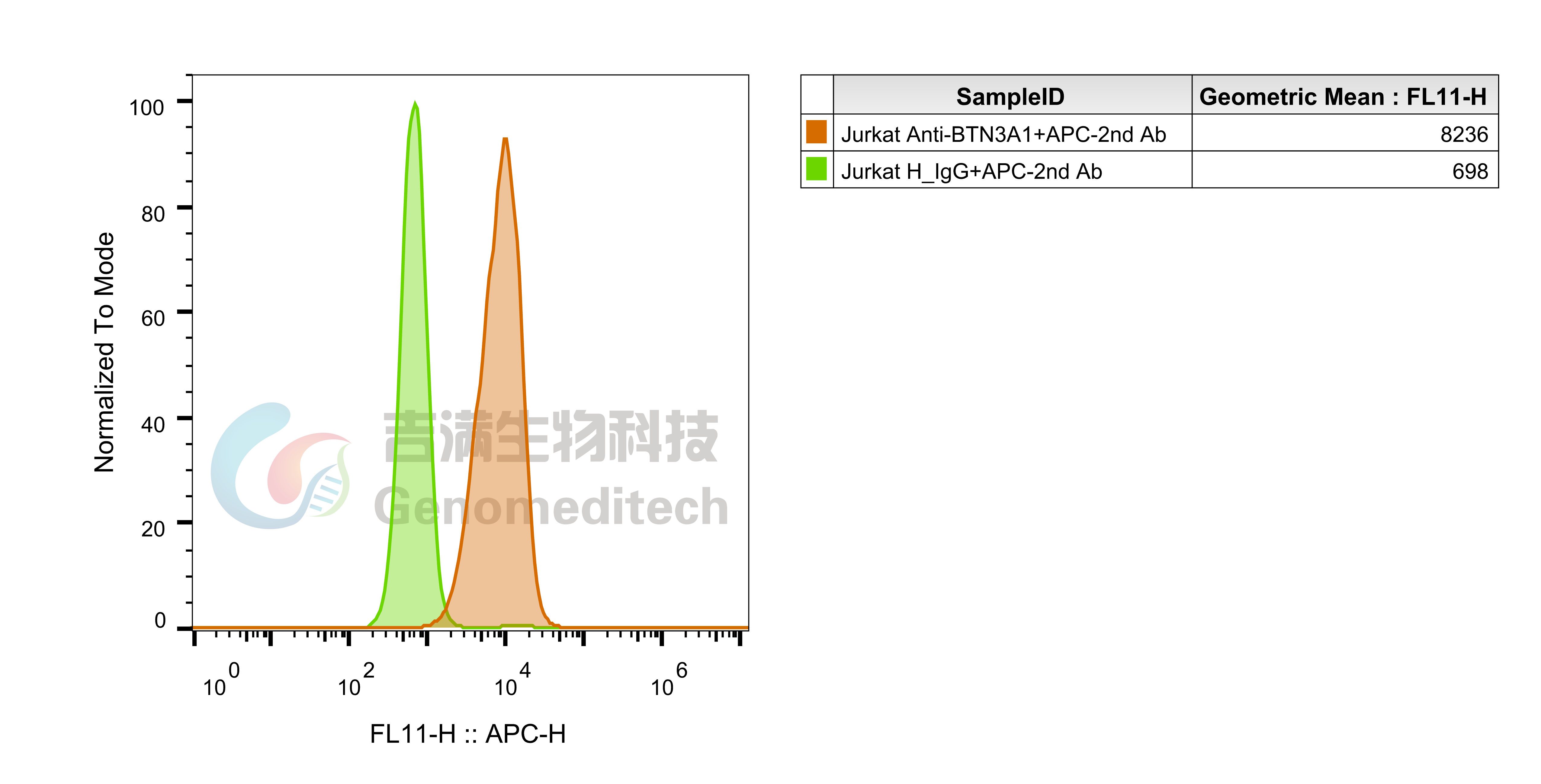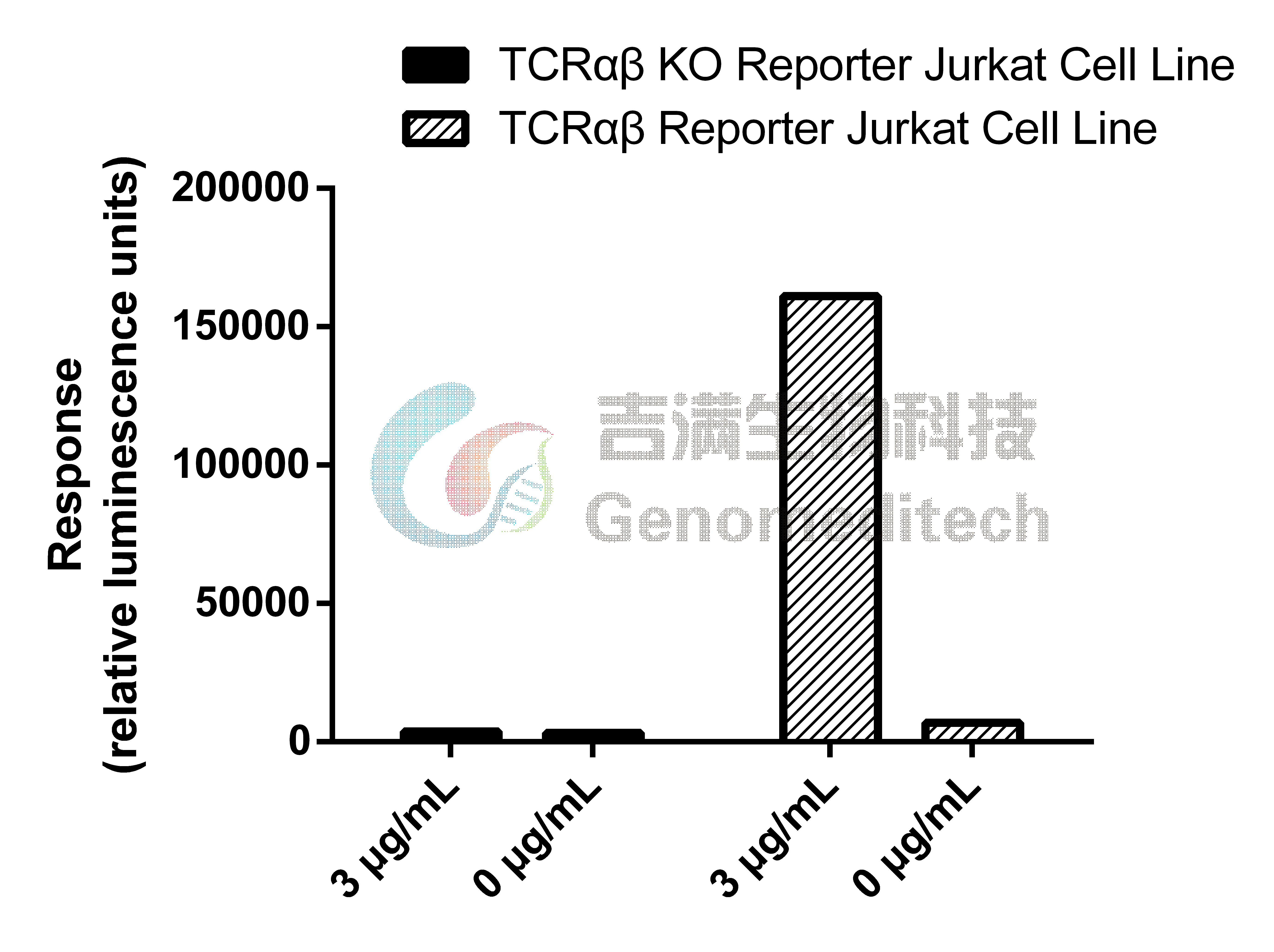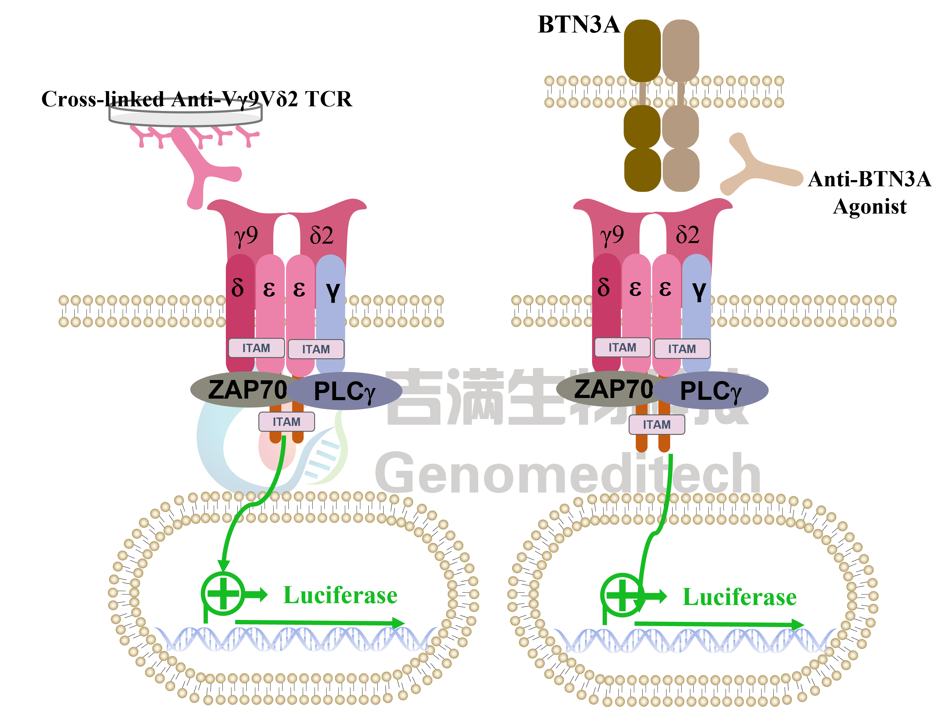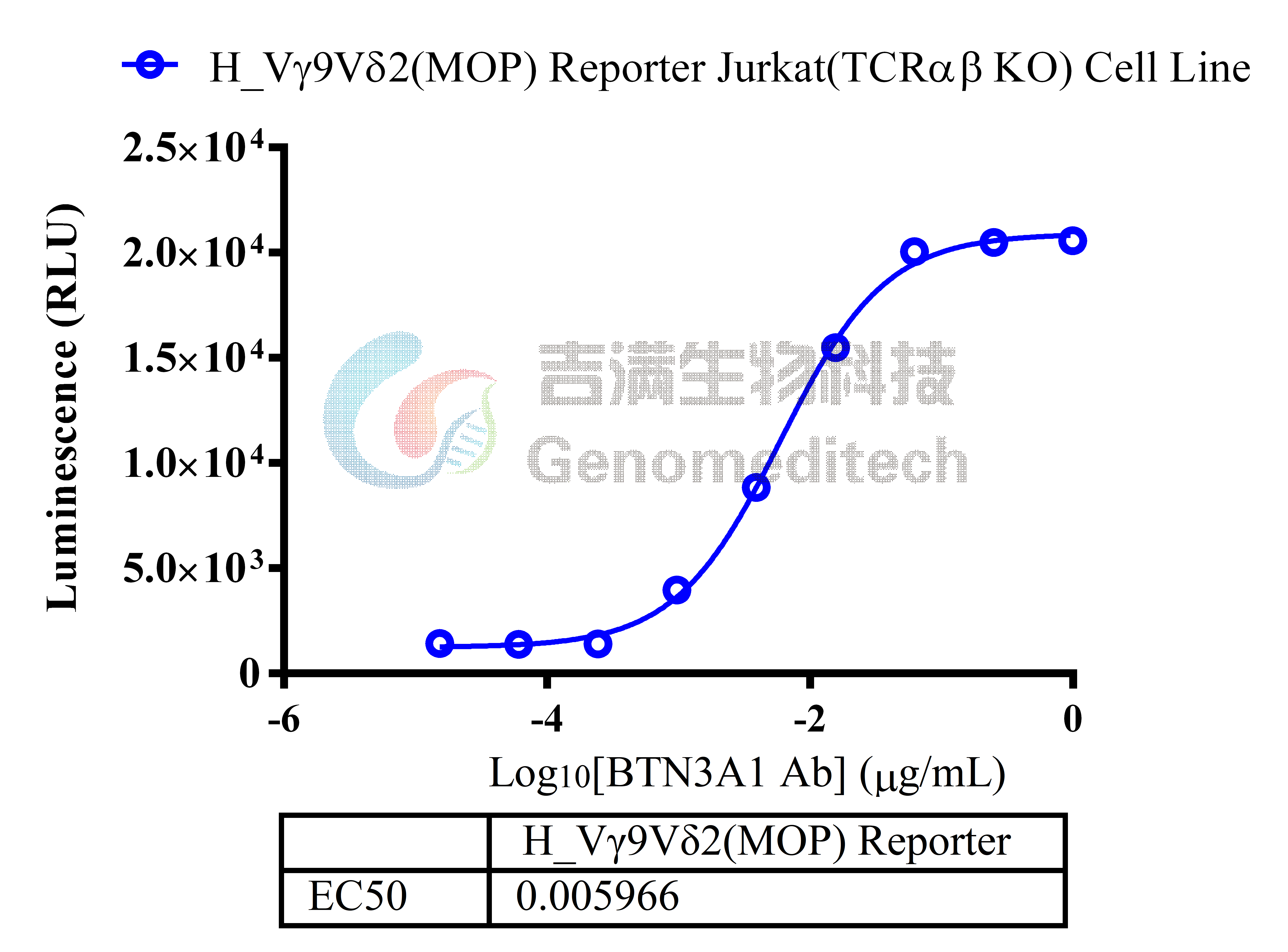 吉满生物H_Vγ9Vδ2(MOP) Reporter Jurkat(TCRαβ KO) Cell Line报告基因细胞系,是基于TCR α/β链 Knockout Jurkat细胞构建的一种Luciferase报告基因细胞系。当BTN3A抗体结合Jurkat本底表达的BTN3A或Vγ9Vδ2 TCR抗体结合Vγ9Vδ2后,激活下游信号通路,从而激活荧光素酶(Luciferase)的表达。Luciferase读值即代表信号通路的激活效果,因此可用于Vγ9Vδ2相关药物的体外效果评价。