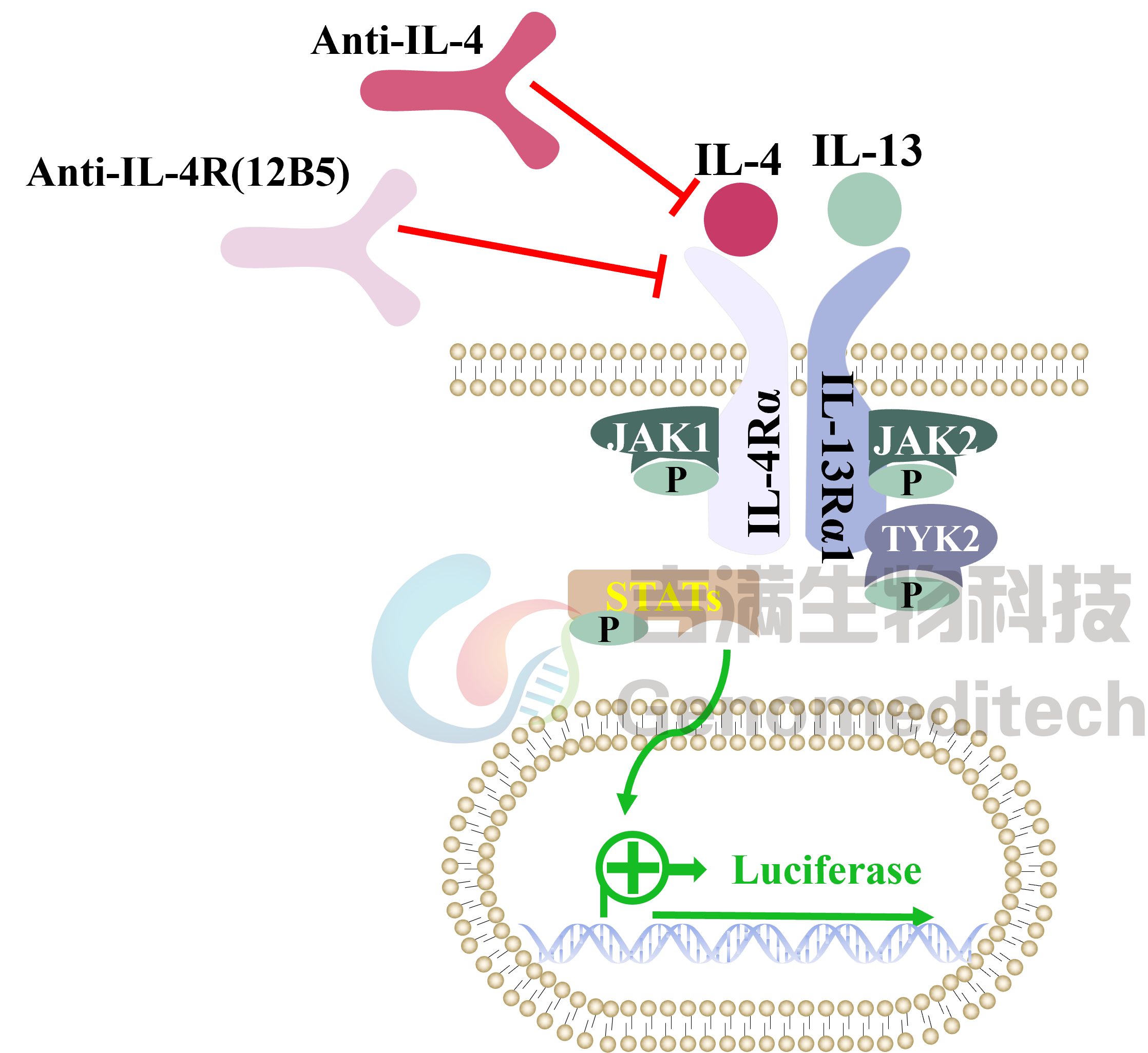 | 产品编号:GM-C01511 产品名称:IL-4/IL-13 Reporter 293 Cell Line 白介素-4(IL-4)是一种细胞因子,对Th0分化为Th2细胞至关重要,后者具有抗炎特性。此外IL-4主要Th2细胞分泌,因此形成了Th2细胞环路。IL-4的其他重要功能包括促进B细胞的增殖和分化,以及诱导免疫球蛋白E抗体的合成, 因此该抗体在过敏反应中起到重要作用。此外,IL-4诱导巨噬细胞极化为抗炎M2表型,这有助于减少病理性炎症的发生。信号主要通过IL-4与IL-4Rα和γc结合,激活下游信号通路。 细胞因子IL-13具有与IL-4相似的生物学特性,由包括Th2细胞在内的T细胞产生。IL-13R信号通路相当复杂,涉及IL-13Rα 1、13Rα2、4Rα和γc的组合,同样也激活下游信号通路。 吉满生物IL-4/IL-13 Reporter 293 Cell Line报告基因细胞系,当IL-4或IL-13与受体结合后激活下游信号通路,从而激活荧光素酶(Luciferase)的表达。该细胞可用于IL-4、IL-13相关药物的体外效果评价。 | ![]() |