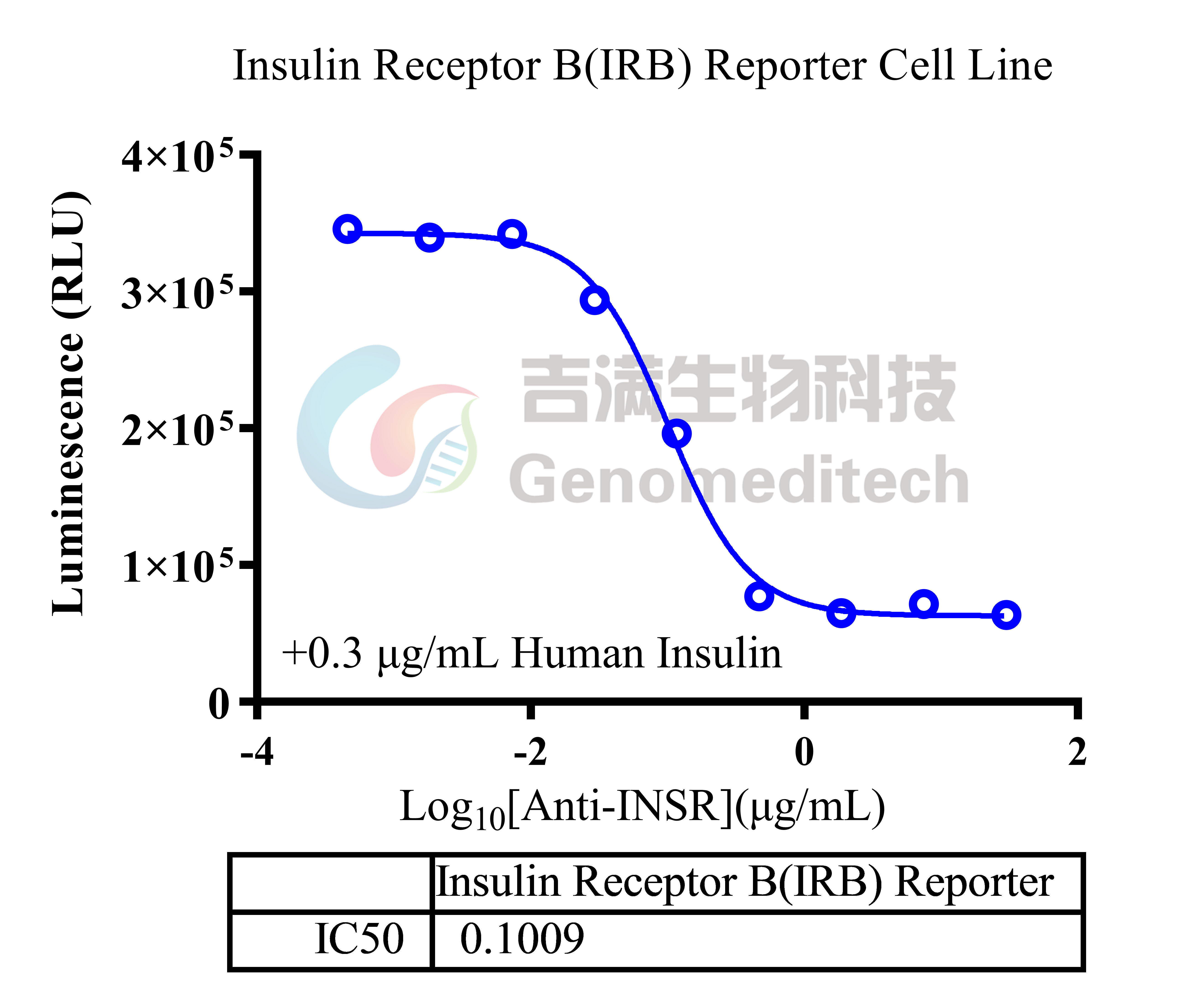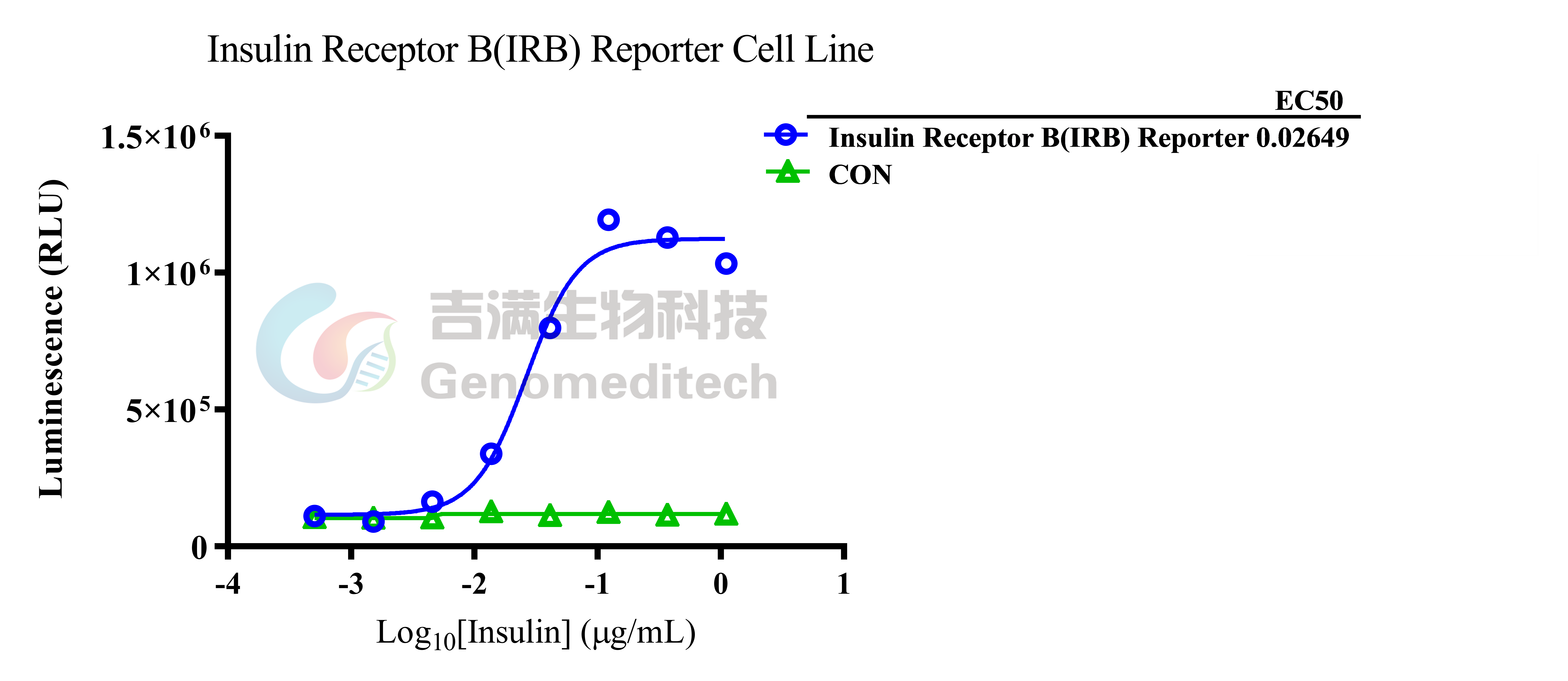 吉满生物 Insulin Receptor B(IRB) Reporter Cell Line 报告基因细胞系,当 Insulin 与细胞表面的 Insulin Receptor B(IR-B) 受体结合后激活下游信号通路,从而激活荧光素酶(Luciferase)的表达。Luciferase 读值即代表信号通路的激活,因此该细胞可用于 Insulin 相关药物的体外效果评价。