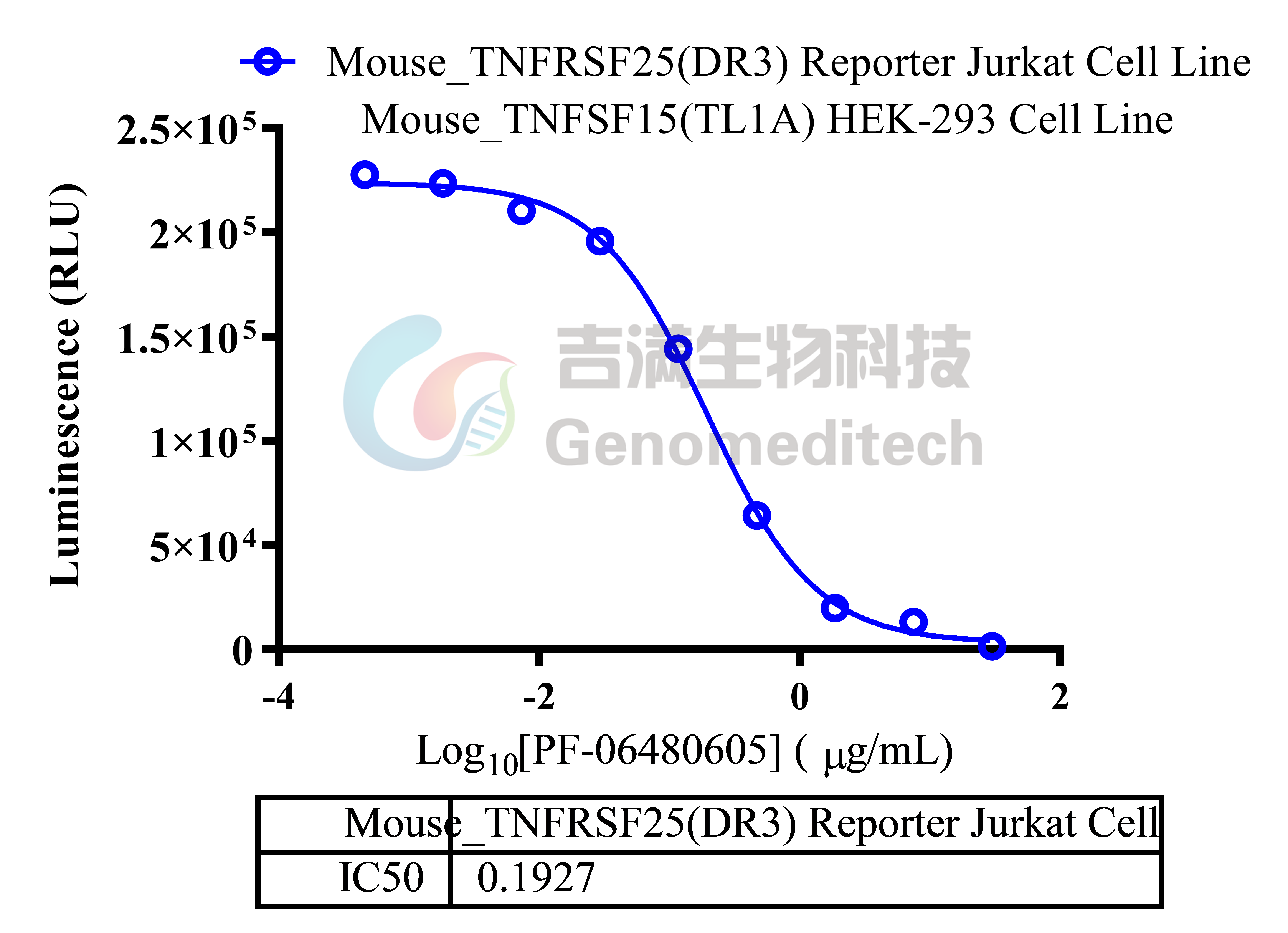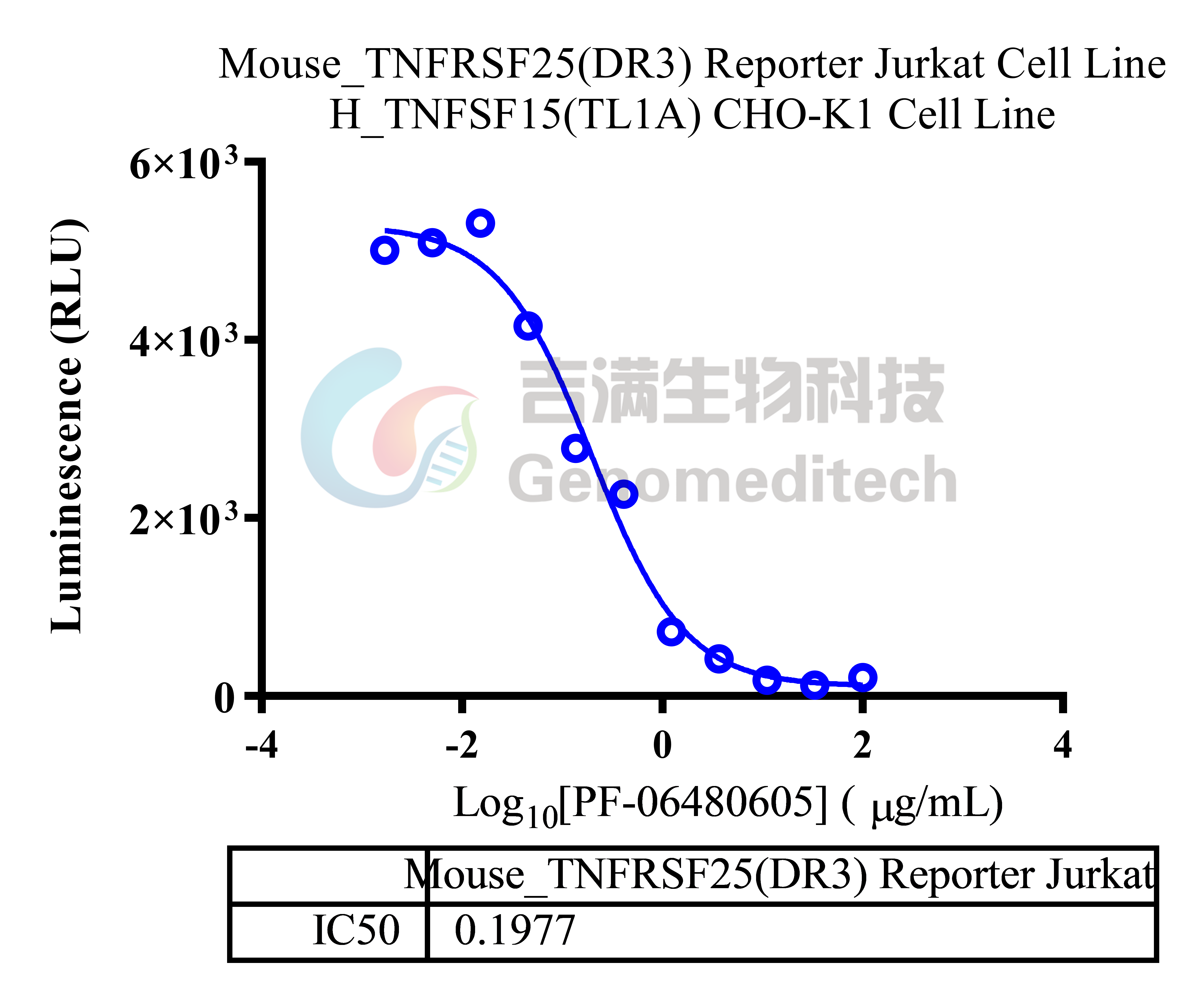 | 产品编号:GM-C30291 产品名称:Mouse_TNFRSF25(DR3) Reporter Jurkat Cell Line 吉满生物Mouse_TNFRSF25(DR3) Reporter Jurkat Cell Line是一种Luciferase报告基因细胞系。其具有两种应用场景:第一,可通过加入DR3激动型药物,激活报告基因细胞下游信号通路,通过测定荧光信号确定荧光素酶(Luciferase)的表达,可用于筛选或验证靶向DR3的激动型药物;第二,可通过加入TL1A的拮抗型抗体,阻断由TL1A膜表达细胞激活的小鼠DR3下游信号,通过测定荧光信号确定荧光素酶(Luciferase)的表达,可用于筛选或验证靶向TL1A的拮抗型药物。 | ![]() |