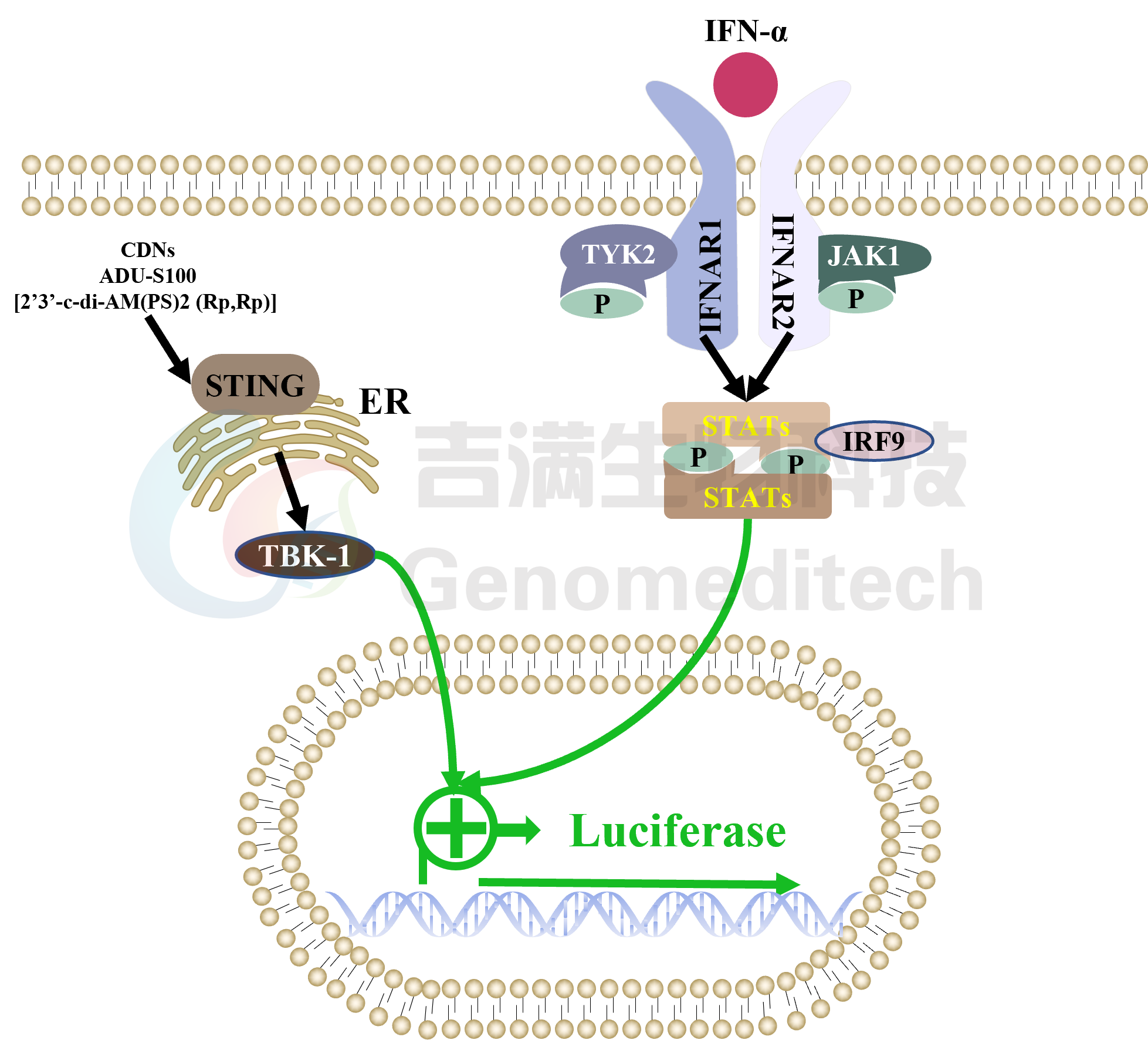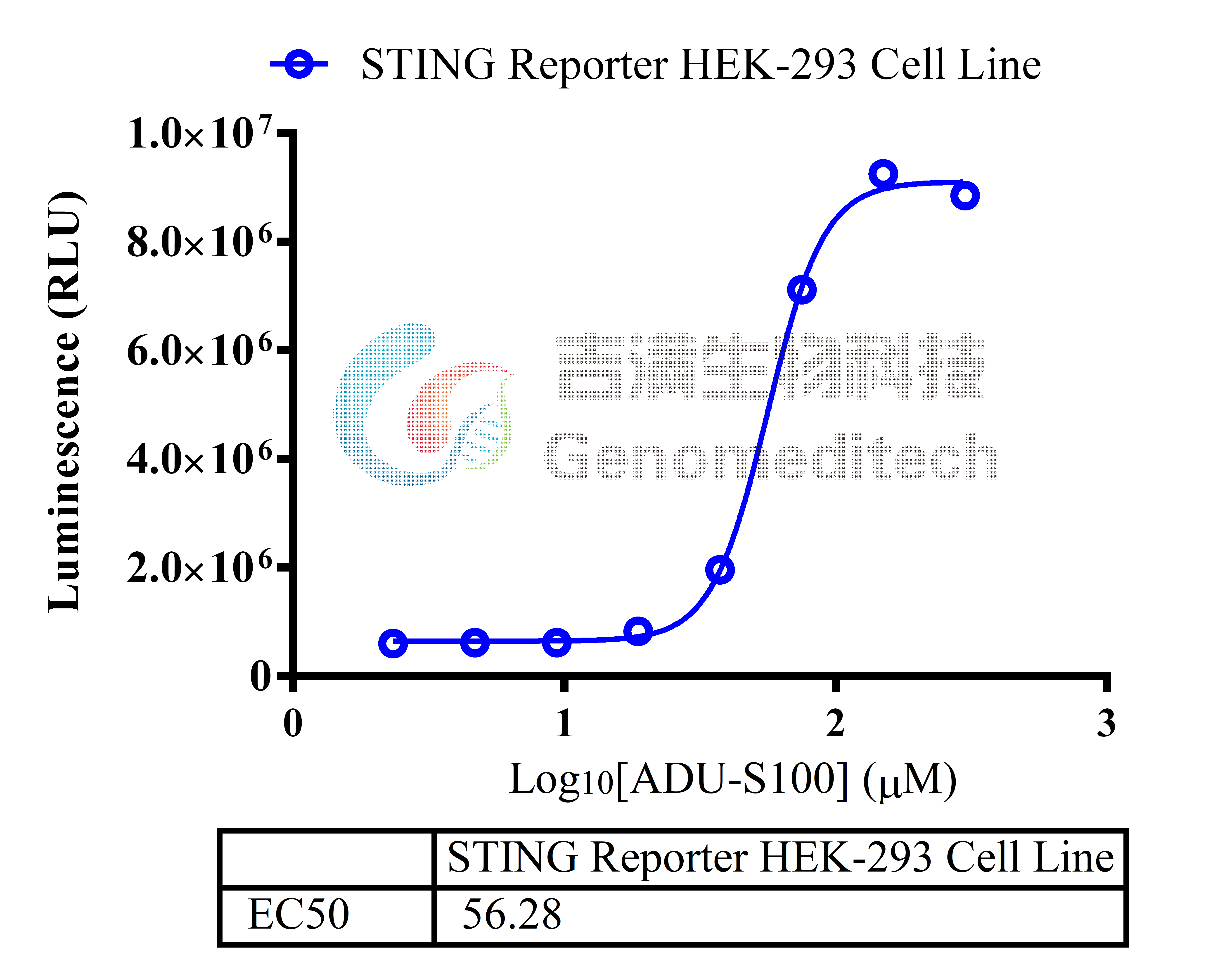 | 产品编号:GM-C33256 产品名称:STING Reporter HEK-293 Cell Line STING( Stimulator of interferon genes ) 能 够 识 别 细 胞 质 中 的 环 状 二 核 苷 酸(cyclic dinucleotides,CDN),然后通过 cGAS-STING 通路激活天然免疫应答。目前针对STING 靶点的激动剂,在癌症、肥胖、病毒感染、肝损伤、糖脂代谢紊乱等诸多疾病领域中备受研究人员关注。STING 在肿瘤中的主要机制是参与 T 细胞介导的肿瘤免疫过程。在结肠癌、黑素瘤、缺乏端粒酶等多种癌症相关疾病中均检测到激活 cGAS-STING 途径可有效抑制癌细胞转移。 吉满生物STING Reporter HEK-293 Cell Line 报告基因细胞系,是基于STING/TBK1/IRF3 信号通路构建的一种Luciferase报告基因细胞系。当CDN结合STING后,STING被激活,募集并激活TANK结合激酶 1(TBK1),活化的TBK反过来磷酸化 STING,导致干扰素调节因子3(IRF3)的募集和磷酸化。磷酸化的IRF3二聚化并进入细胞核,从而激活荧光素酶(Luciferase)的表达。Luciferase读值即代表信号通路的激活效果,因此可用于CDN相关药物的体外效果评价。 | ![]() |