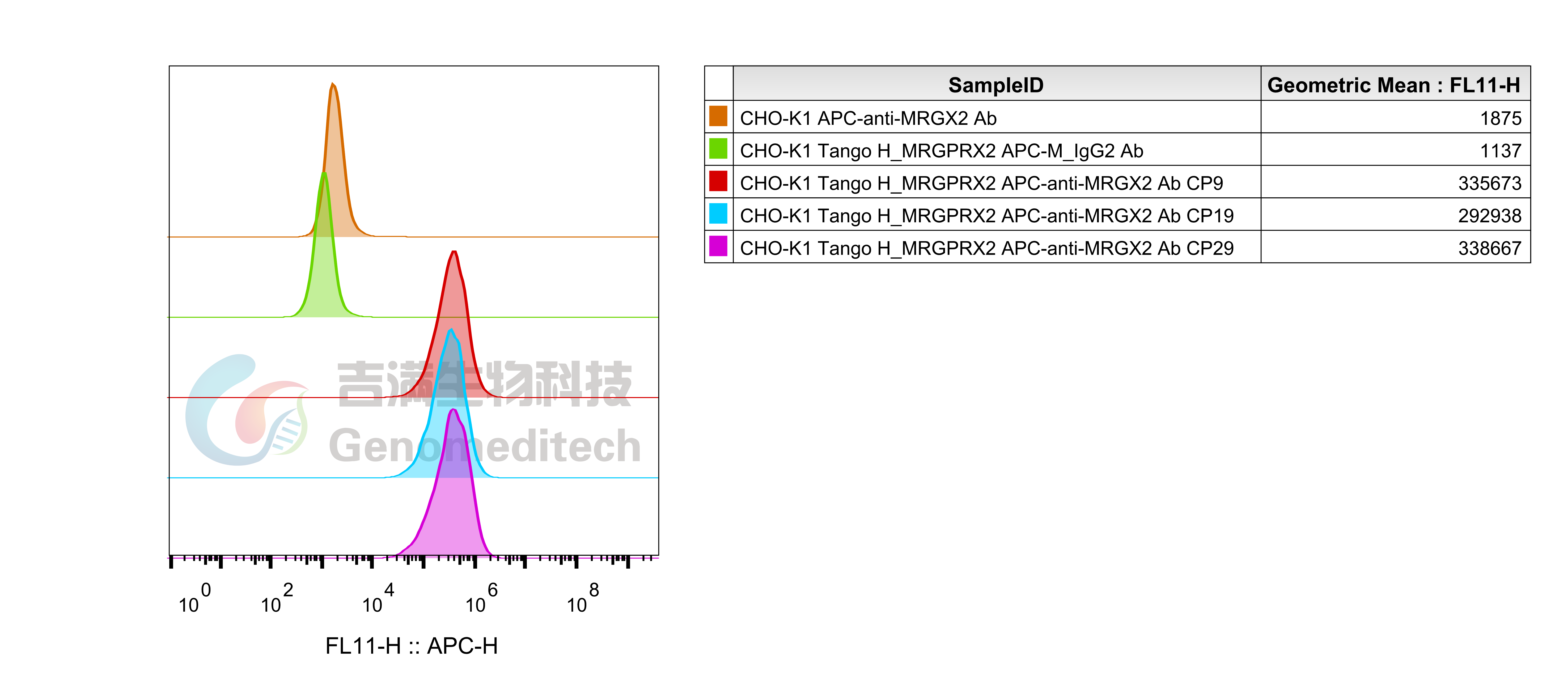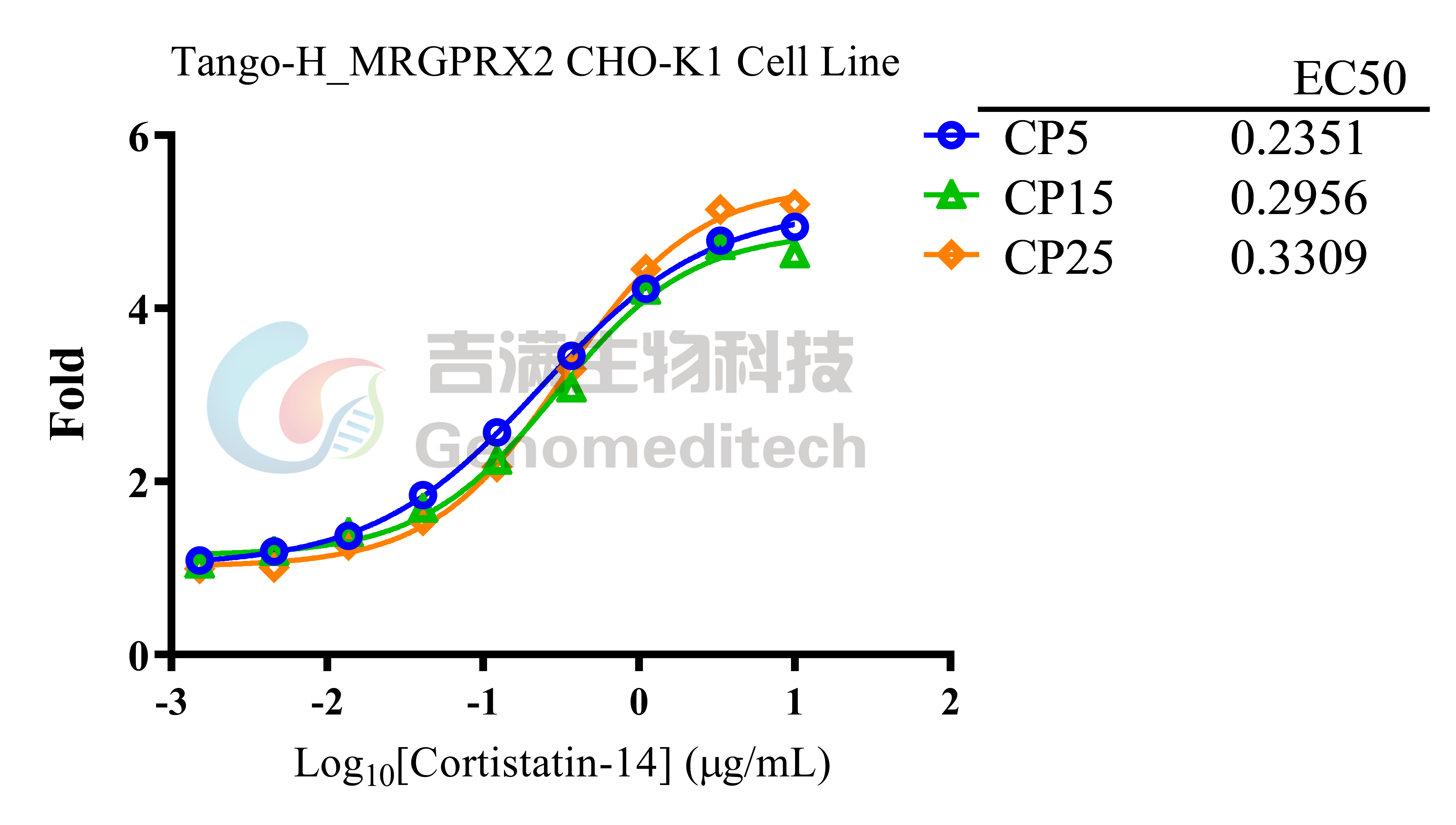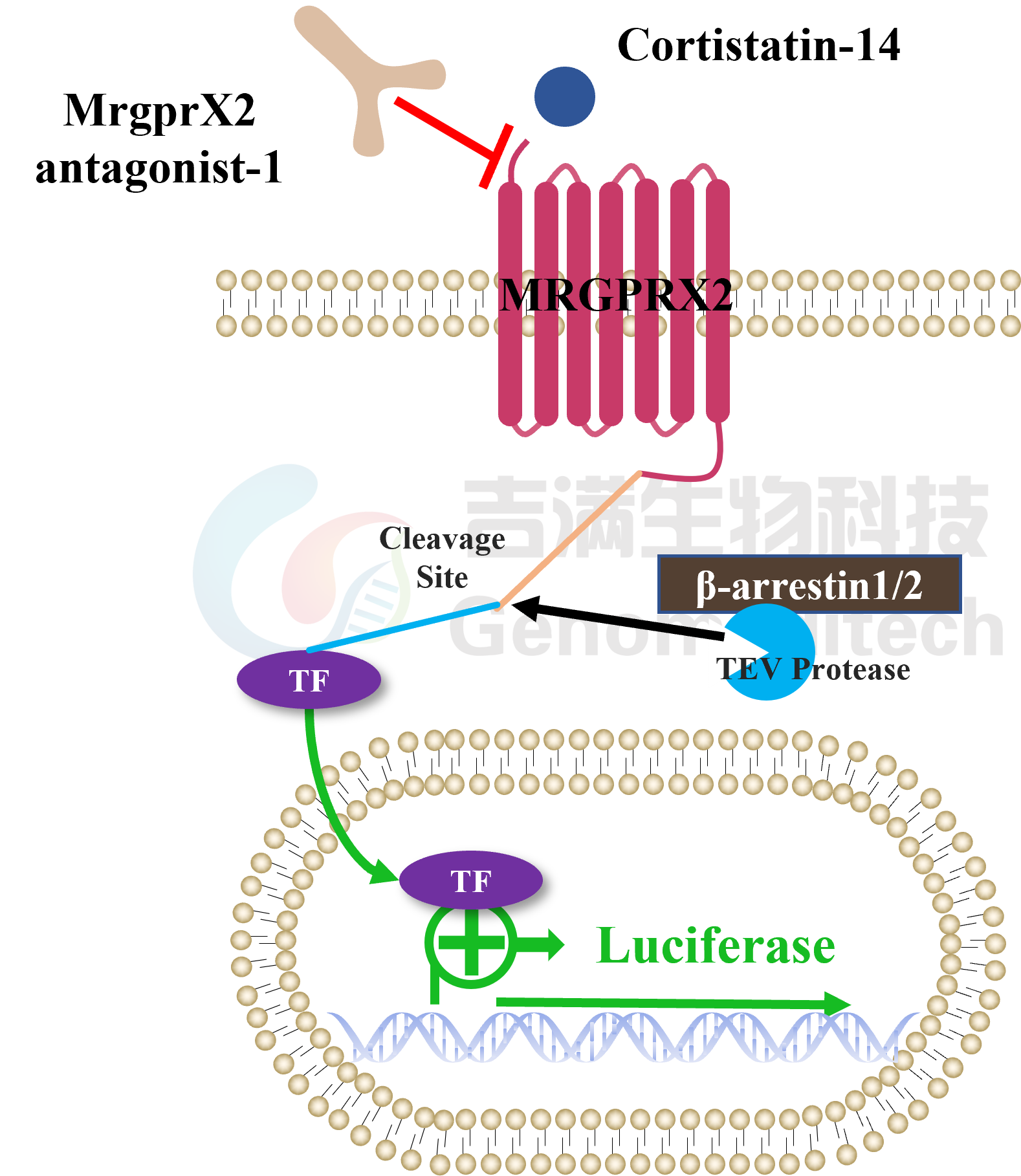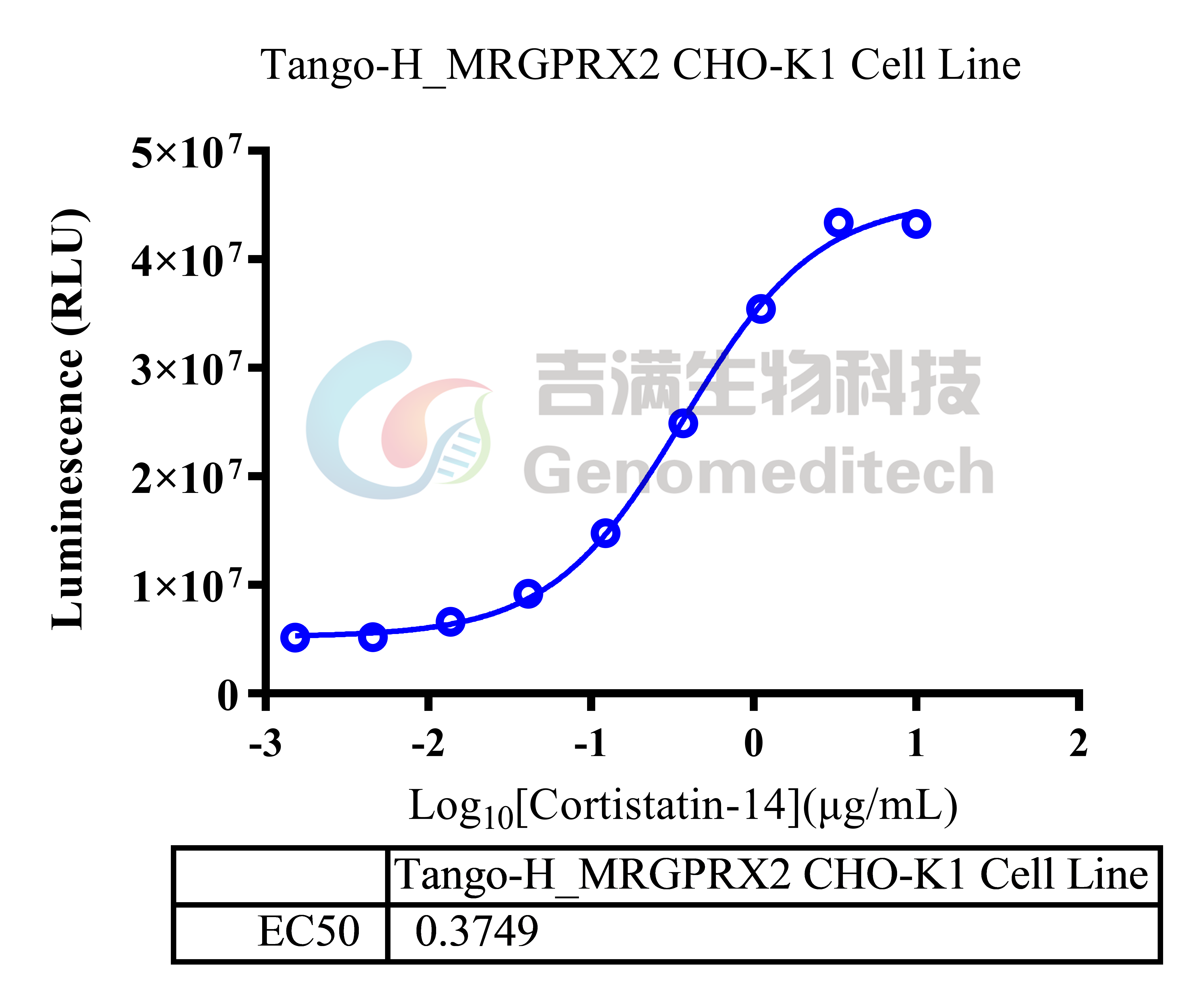 | 产品编号:GM-C37884 产品名称:Tango-H_MRGPRX2 CHO-K1 Cell Line MRGPRX2(Mas-related G protein-coupled receptor member X2)是一种G蛋白偶联受体(GPCR),主要表达于肥大细胞和一些神经组织。MRGPRX2受体参与多种生理和病理过程,包括痛觉传导、免疫反应、和炎症反应。它能识别并与多种配体结合,包括一些环肽和促炎症分子。MRGPRX2与某些过敏性疾病有关,如慢性荨麻疹和过敏性休克,因其在肥大细胞中的表达能够触发组胺和其他炎症介质的释放。此外,该受体还参与一些药物过敏反应,因此在药物开发和过敏反应的研究中具有潜在的医学价值。 吉满生物的Tango-H_MRGPRX2 CHO-K1 Cell Line细胞系以 CHO-K1 为工具细胞,采用慢病毒感染的方式,依靠 Tango 技术构建 Tango MRGPRX2 报告基因的细胞系,当配体激活 MRGPRX2 β-arrestin 通路时,β-arrestin 携带蛋白酶切下转录激活元件,转录激活元件移位到细胞核中,激活荧光素酶报告基因;使用阻断型的抗体可以阻断这一信号的传导。Luciferase 读值即代表信号通路的激活效果。因此可用于靶向 MRGPRX2 功能性抗体的活性检测。 | ![]() |