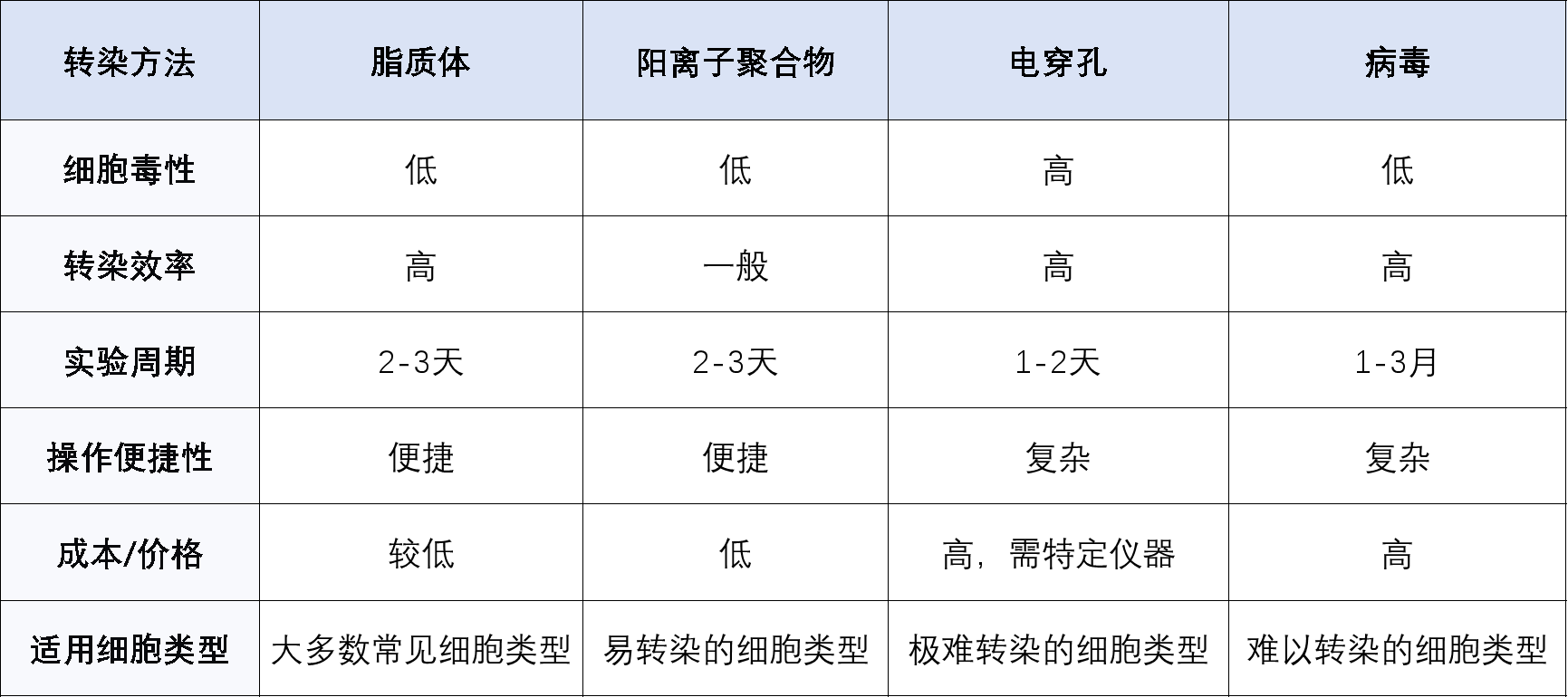 从对比表中,我们可以看出,现有转染方法普遍面临效率与毒性难以平衡、操作复杂或成本高昂等问题。