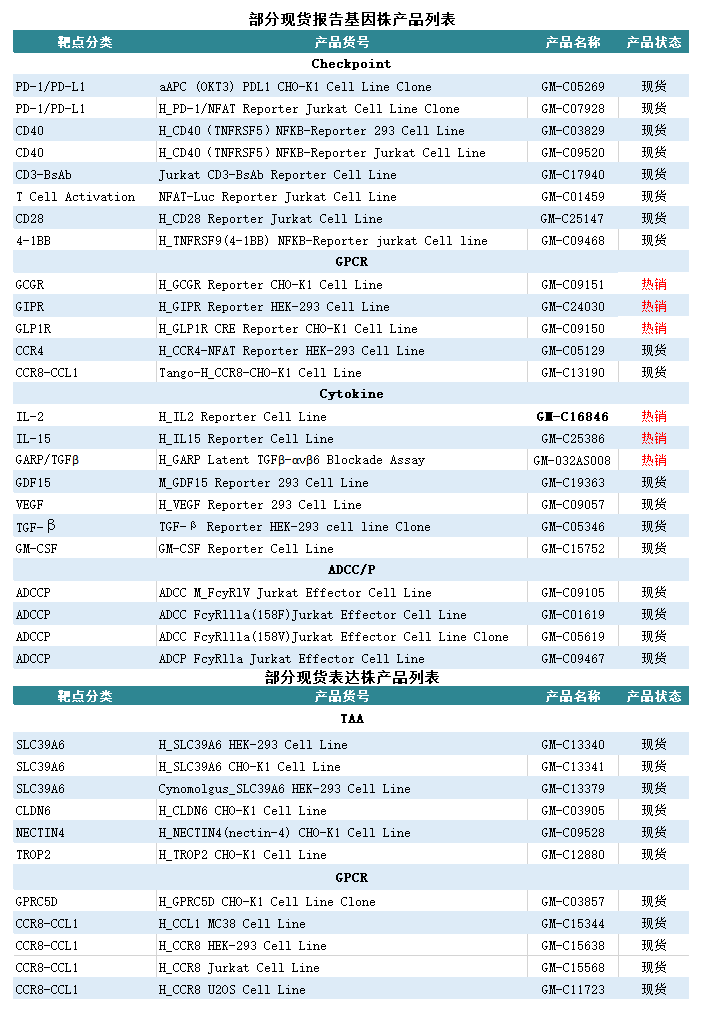 吉满生物助力药物研发,紧随前沿靶点资讯,储备几百株现货细胞,覆盖GPCR、细胞因子、免疫检查点、TAA等多领域近200余个靶点。