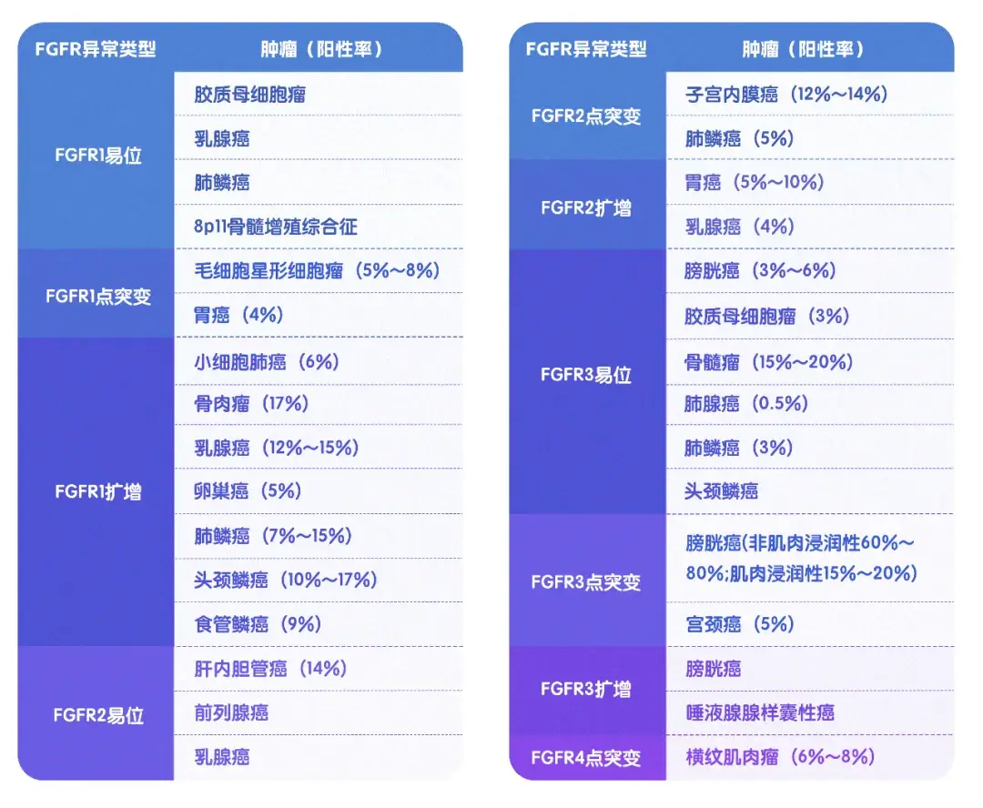 在正常生理状态下,FGF–FGFR信号轴维持着上皮与间质之间的稳态平衡。然而,一旦这一系统发生异常——例如 FGFR基因扩增、突变、融合或过度表达——受体将处于持续激活状态,从而导致信号通路过度刺激,使细胞获得持续增殖和抗凋亡能力。这种“失控的生长信号”是多种肿瘤发生与进展的关键分子机制之一。
