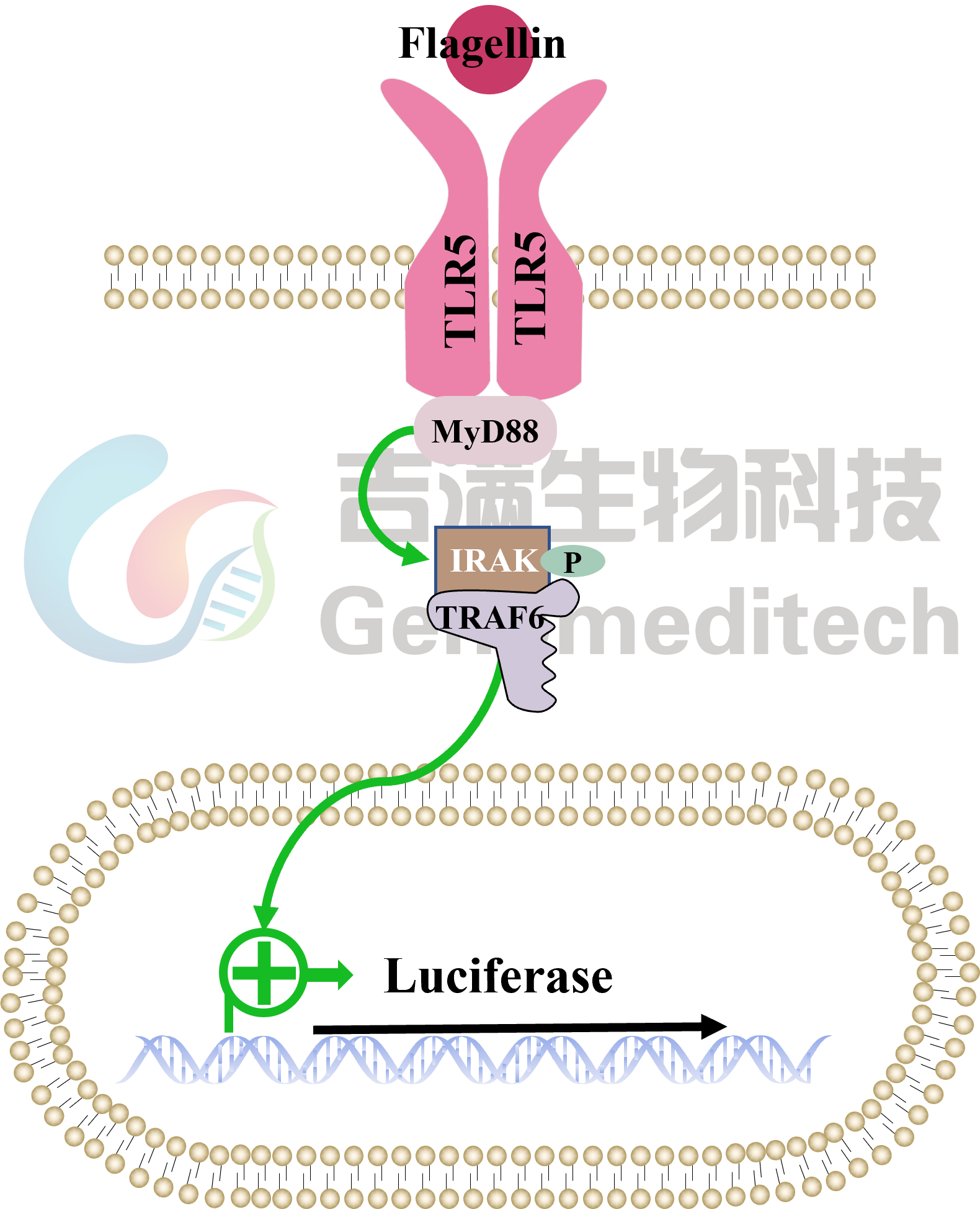 | 产品编号:GM-C42128 产品名称:H_TLR5 Reporter 293 Cell Line TLR5基因(Toll样受体5,Toll-Like Receptor 5)是人类先天免疫系统中的重要成员,位于染色体1q41-q42区域。该基因编码一种跨膜受体蛋白,主要识别细菌鞭毛蛋白(flagellin),从而激活先天免疫反应通路。TLR5的激活可通过招募下游信号分子(如MyD88)诱导NF-κB等转录因子的活化,促进炎症因子(如IL-6、TNF-α)的产生,在机体抵御细菌感染、调节肠道菌群稳态及黏膜免疫中具有关键作用。研究表明,TLR5基因的多态性与多种疾病的易感性相关,包括炎症性肠病、肥胖、糖尿病及感染性疾病等。作为先天免疫识别系统的重要组成部分,TLR5在维持免疫平衡及疾病防御中发挥着重要生理功能。 吉满生物H_TLR5 Reporter 293 Cell Line报告基因细胞系,是一种Luciferase报告基因 细胞系。当配体与受体结合后,激活下游信号,从而导致荧光素酶(Luciferase)的表达。 Luciferase 读值即代表信号通路的激活效果,因此可用于TLR2相关药物的体外效果评价。 | ![]() |
