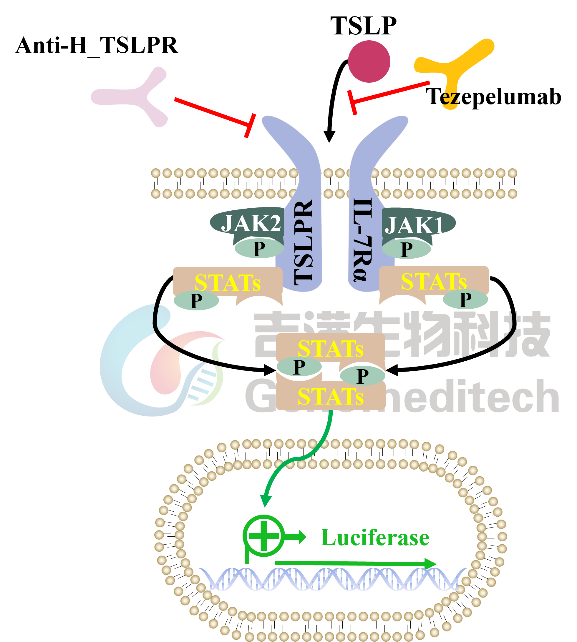 | 产品编号:GM-C15572 产品名称:H_TSLP Reporter Cell Line 胸腺基质淋巴细胞生成素(TSLP)是一种细胞因子家族的蛋白质。它通过激活抗原呈递细胞在T细胞群的成熟中发挥重要作用。TSLP主要由非造血细胞产生,如成纤维细胞、上皮细胞和不同类型的基质或基质样细胞。TSLP与胸腺基质淋巴细胞受体CRLF2(TSLPR)和IL-7Rα链形成三元信号复合物,激活下游信号。 吉满生物H_TSLP Reporter Cell Line报告基因细胞系,是一种Luciferase报告基因细胞系。当TSLP与TSLPR结合后,二聚体增强IL-7Rα的募集,形成细胞外三元复合物,激活下游信号,从而导致荧光素酶(Luciferase)的表达。Luciferase读值即代表信号通路的激活效果,因此可用于TSLP相关药物的体外效果评价。 | ![]() |